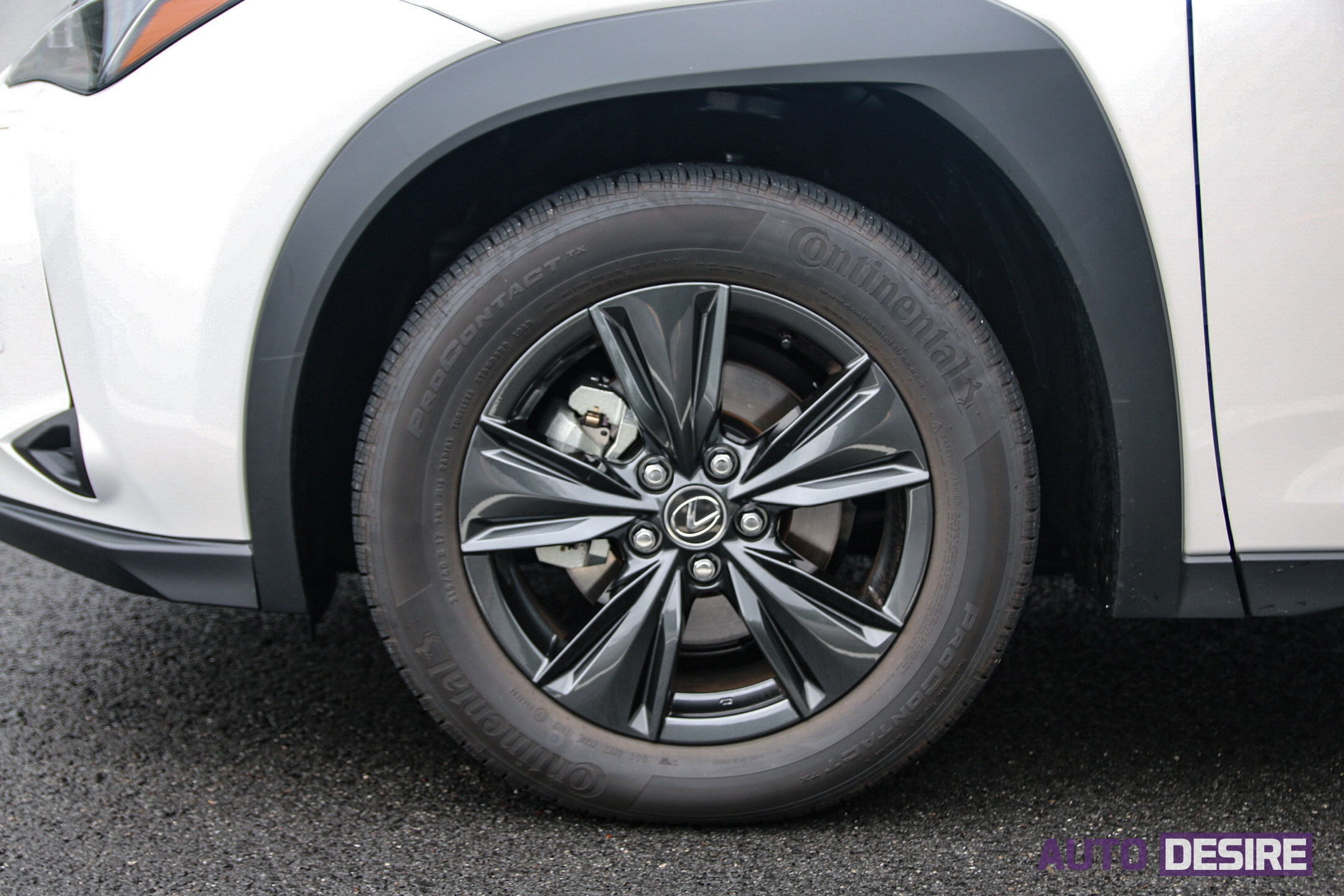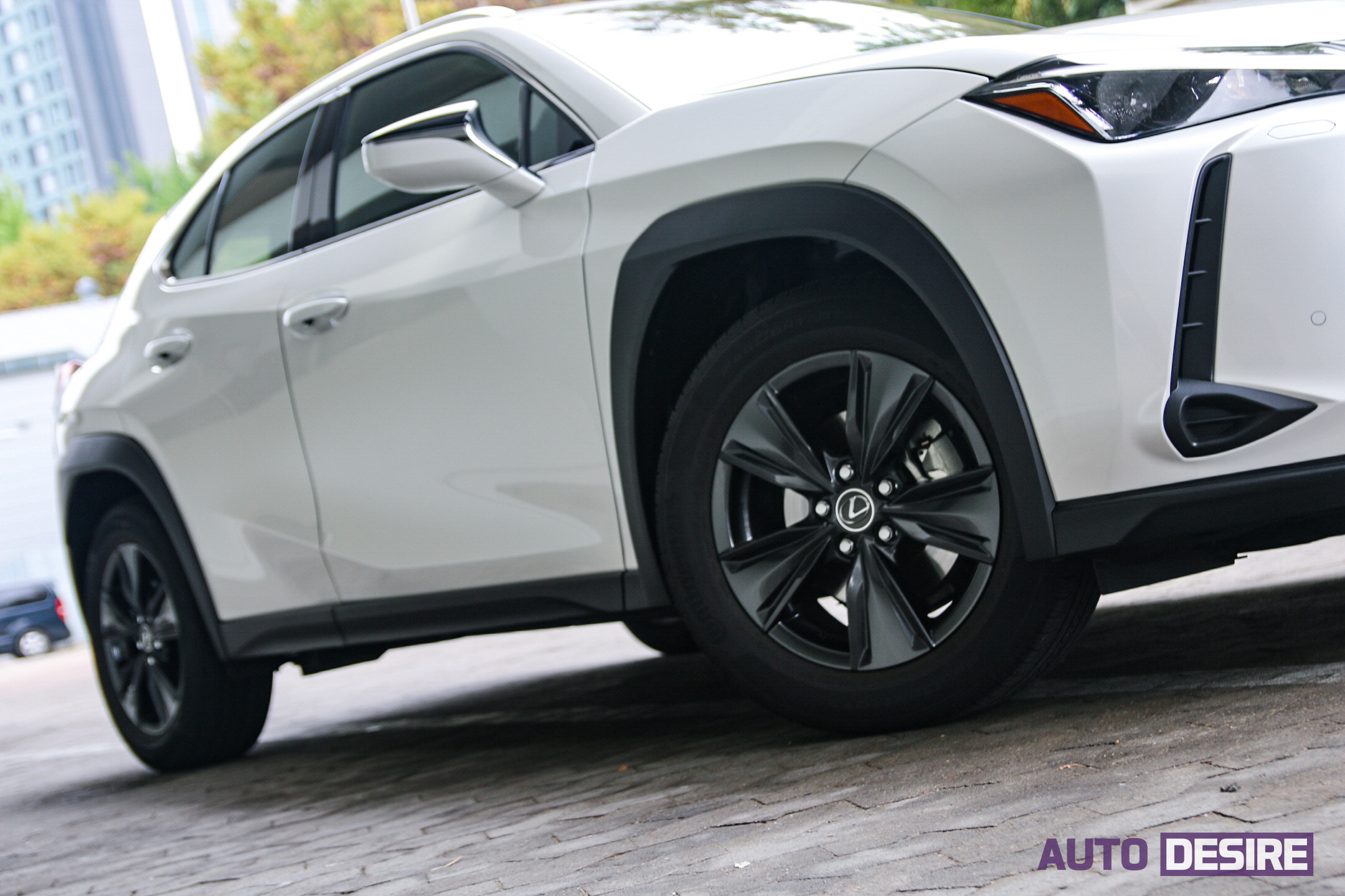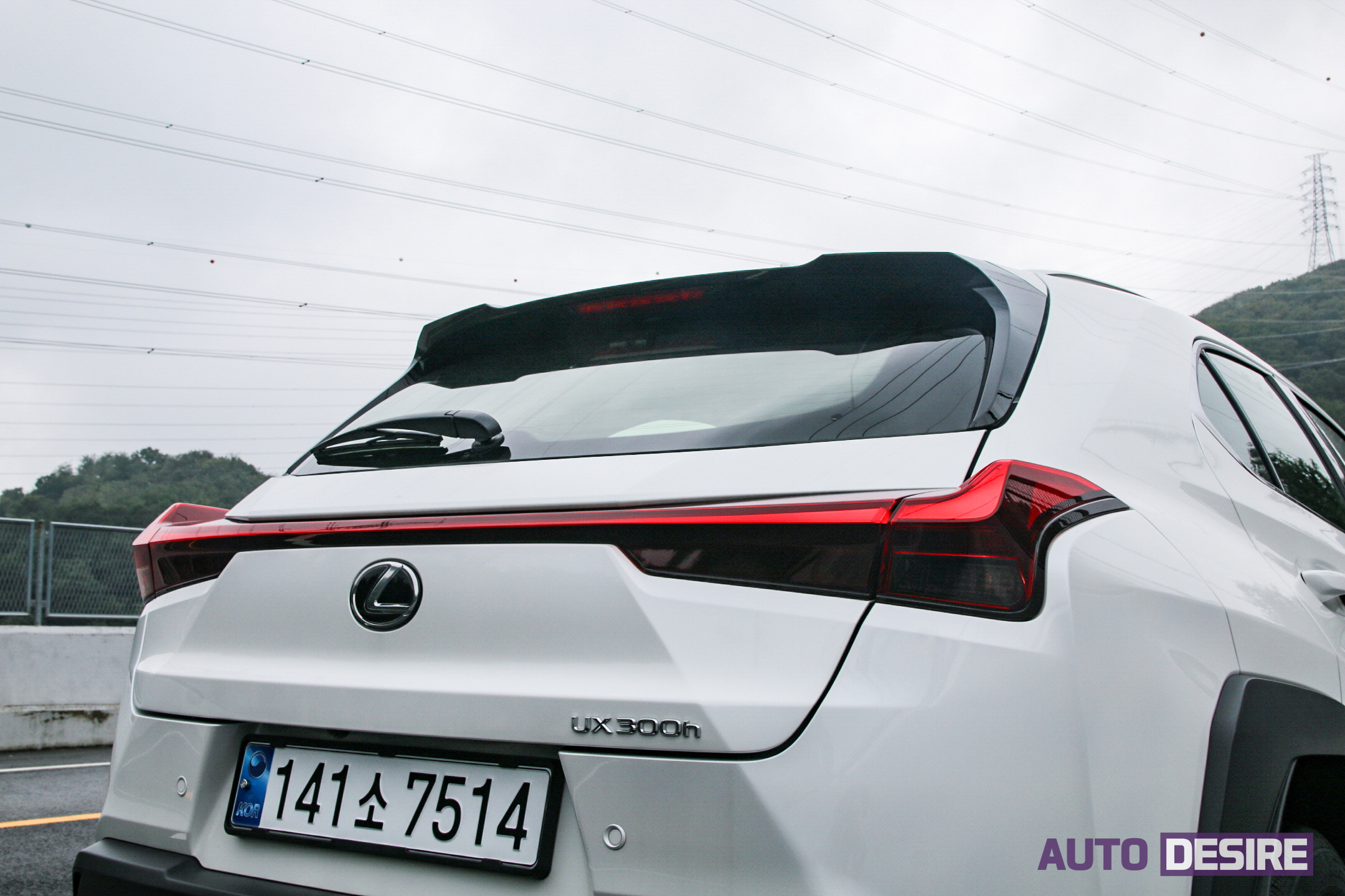 측면에서도 볼드하게 들어간 사이드 캐릭터 라인과 볼륨감 있는 펜더로 컴팩트 SUV에 잘 어울리는 다이내믹한 인상을 주고 UX 300h F 스포츠 모델에는 바디 컬러 클래딩으로 세련미를, 2WD 모델에는 무광 클래딩을 적용해 액티브한 인상을 준다. 또 2WD 모델에는 17인치 다크 알루미늄 휠을 적용해 클래딩 부분과 자연스럽게 이어지면서 안정적인 자세감을 만든다. 타이어는 기본적으로 사계절 타이어로 장착, 출고되어 서머 타이어와 다르게 겨울철에 별도로 타이어를 교체할 불편함이 없다.