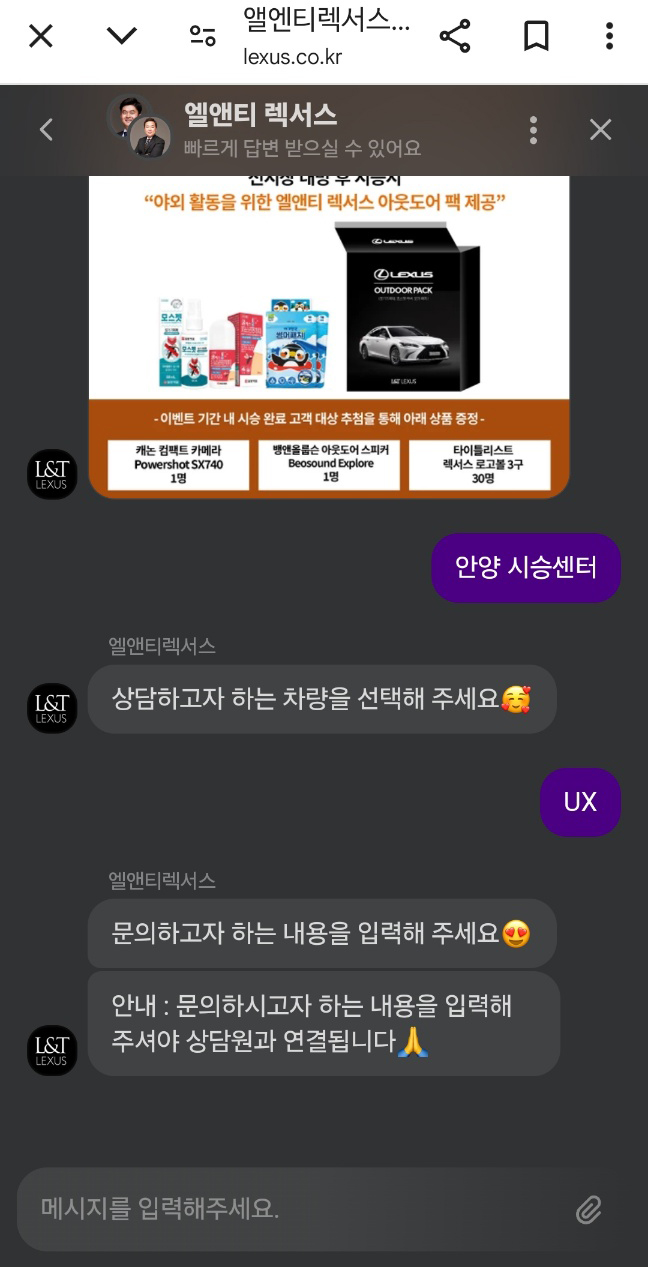 2025년형 렉서스 UX 300h를 비롯한 렉서스 하이브리드 차량 시승 신청과 프로모션, 구매 상담 문의와 함께 엘앤티렉서스 10월 이벤트에 관한 더 자세한 내용을 알고 싶다면, PC와 모바일 환경 모두 편하게 이용 가능한 엘앤티렉서스 ‘채널톡’(상담 운영시간 09:00~20:00)을 통해 문의해 보기 바란다.
