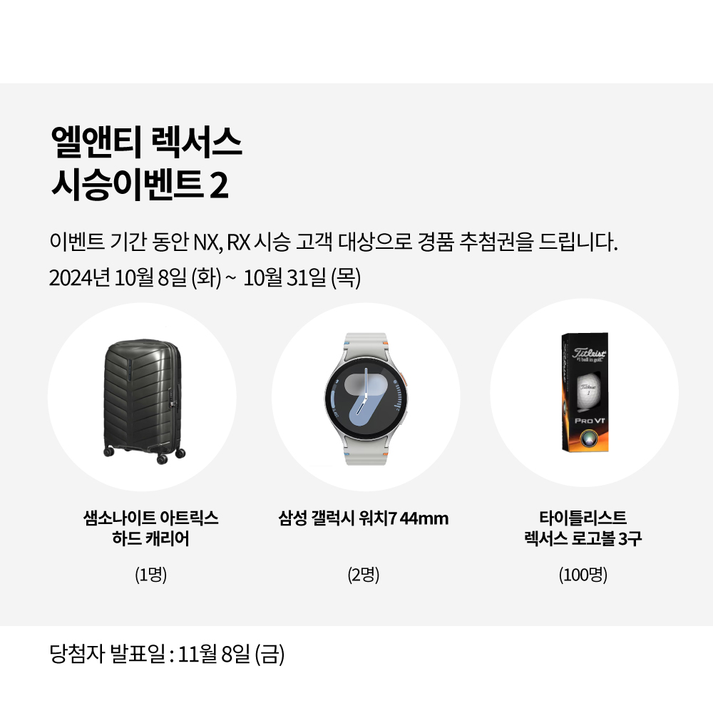 또 10월 이벤트 기간 동안 엘앤티렉서스 시승 고객 대상으로 트래블기어 압축 파우치 1개를 증정하고, 10월 31일까지 NX, RX를 시승하는 고객 대상으로는 추첨을 통해 1명에게 샘소나이트 아트릭스 하드 캐리어, 2명에서 삼성 갤럭시 워치7 44mm, 100명에게 타이틀리스트 렉서스 로고볼 3구까지 증정하고 있으니, 구매를 앞두고 경험해 보길 원했던 렉서스 차량이 있다면, 꼭 이번 10월에 엘앤티렉서스를 통해 경험하고 상담까지 받아보길 바란다.