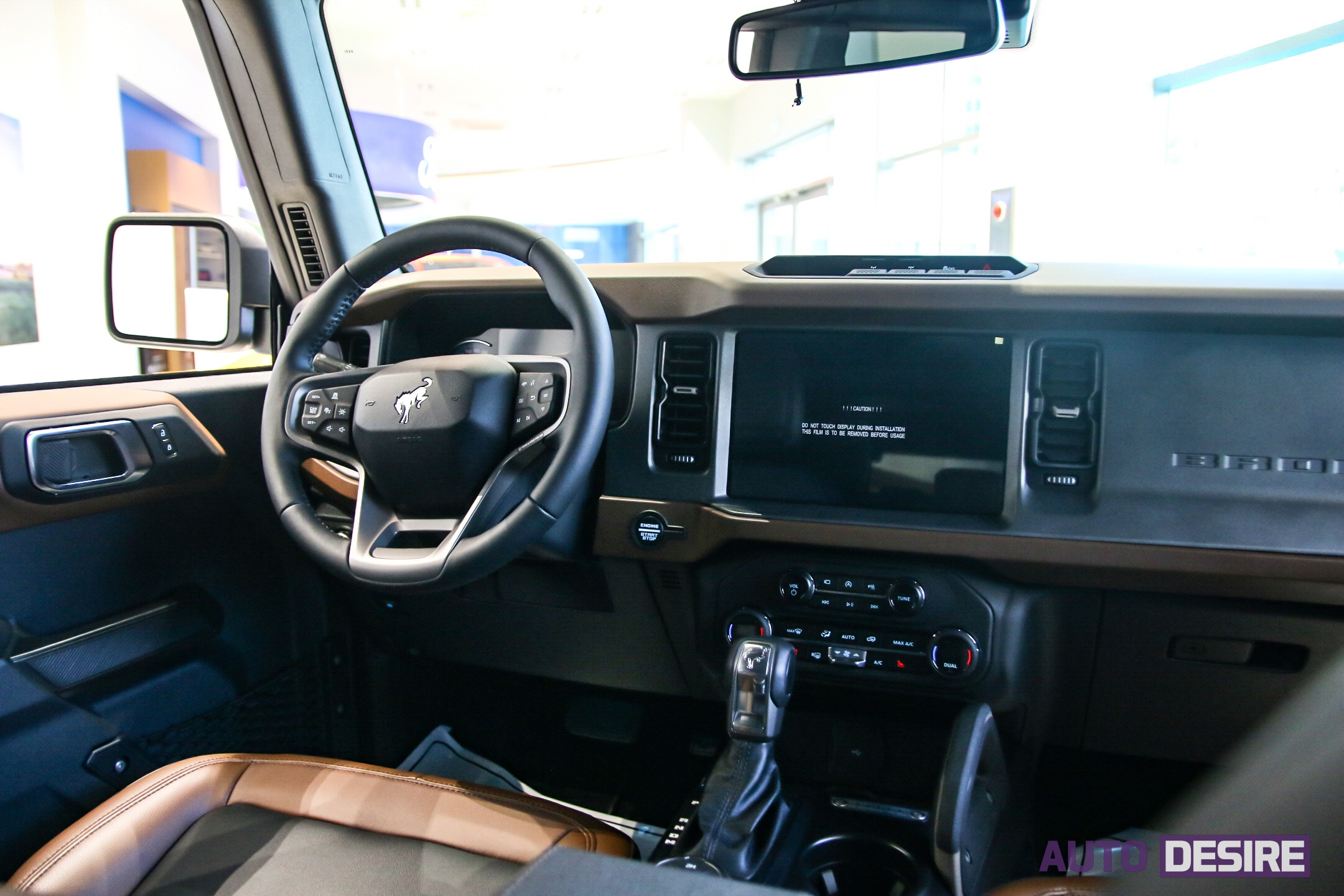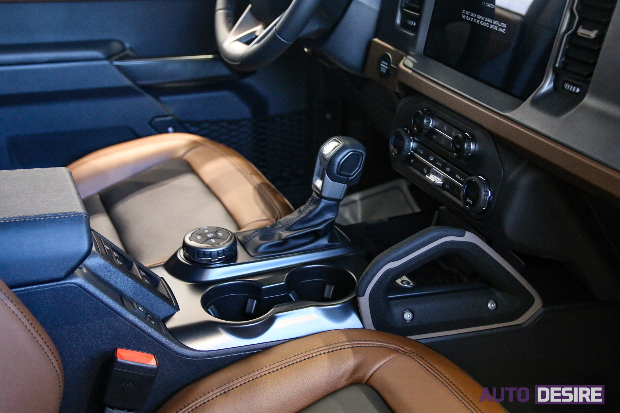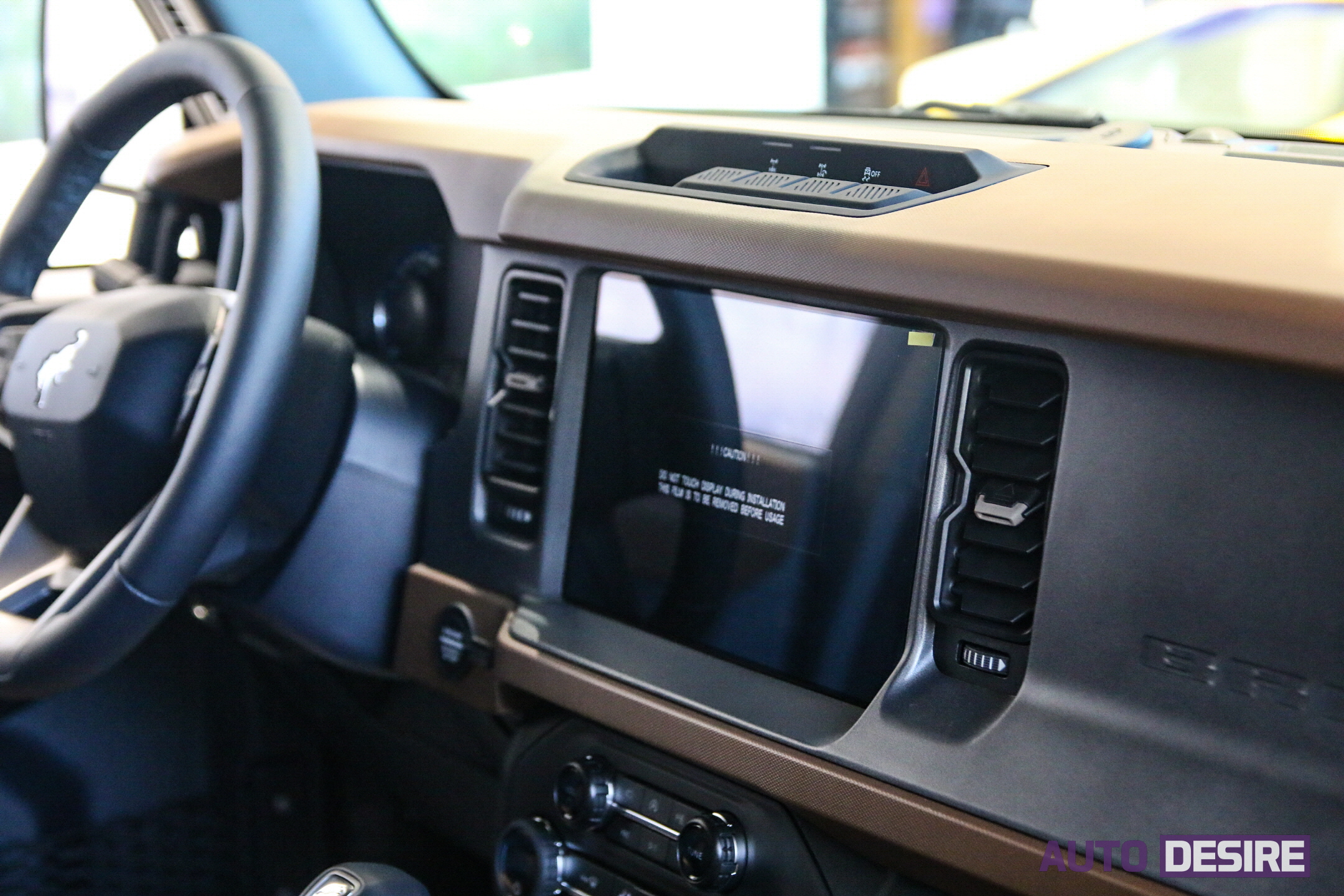 이어서 2024 포드 브롱코 2.3 에코부스트 모델의 실내에도 투톤 인테리어 컬러가 적용되며, 전시차에는 클래식하면서도 고급 진 감성의 블랙/브라운 투톤 인테리어가 적용되었다. 다만 2.7 모델에는 사이드 그립과 센터 콘솔 그립에 블루 포인트 컬러가 적용되지만, 2.3 모델에는 그레이 포인트 컬러가 적용된다.