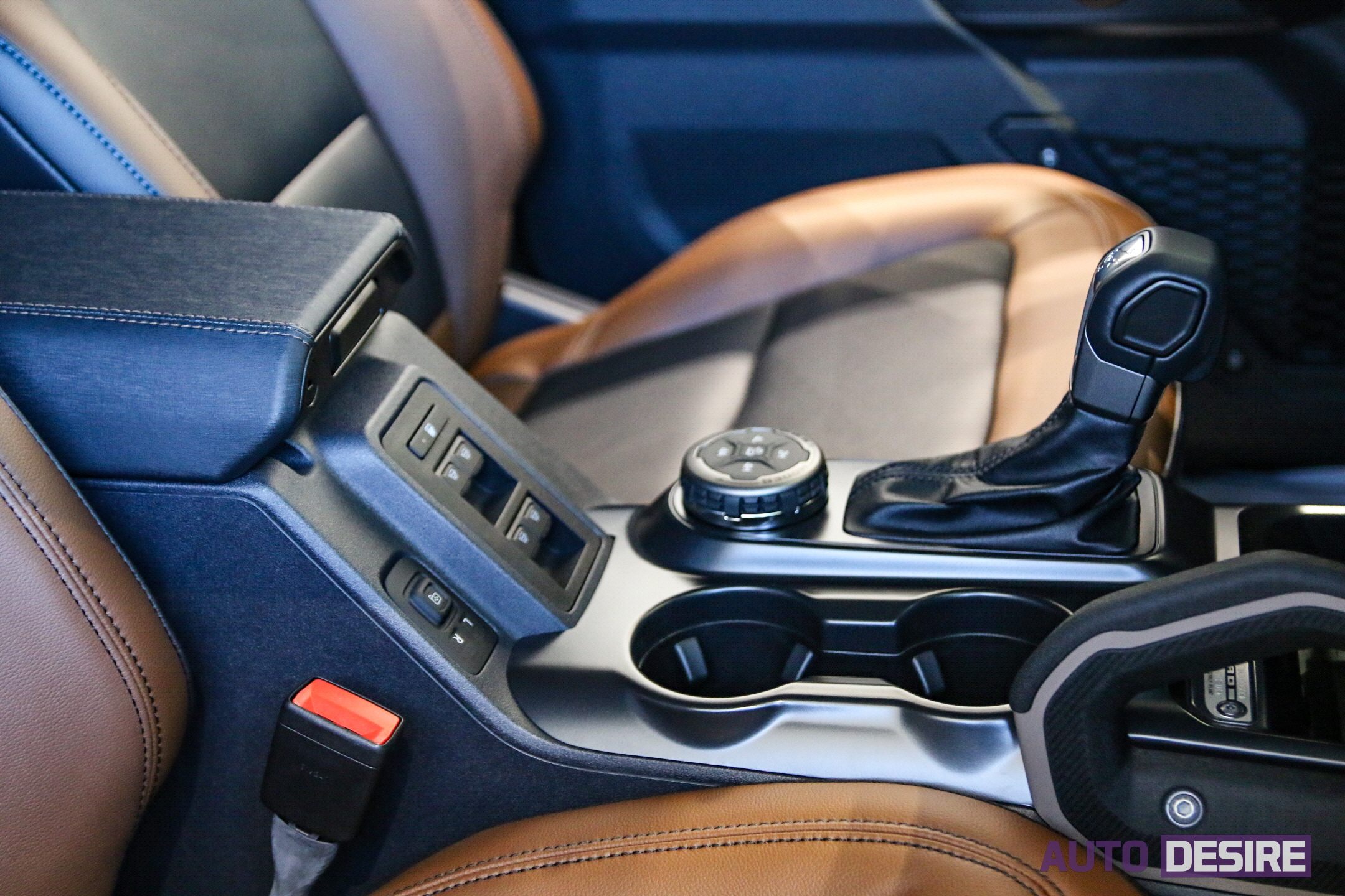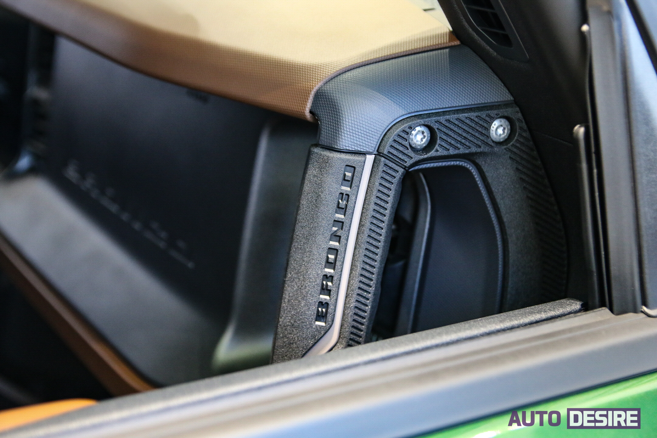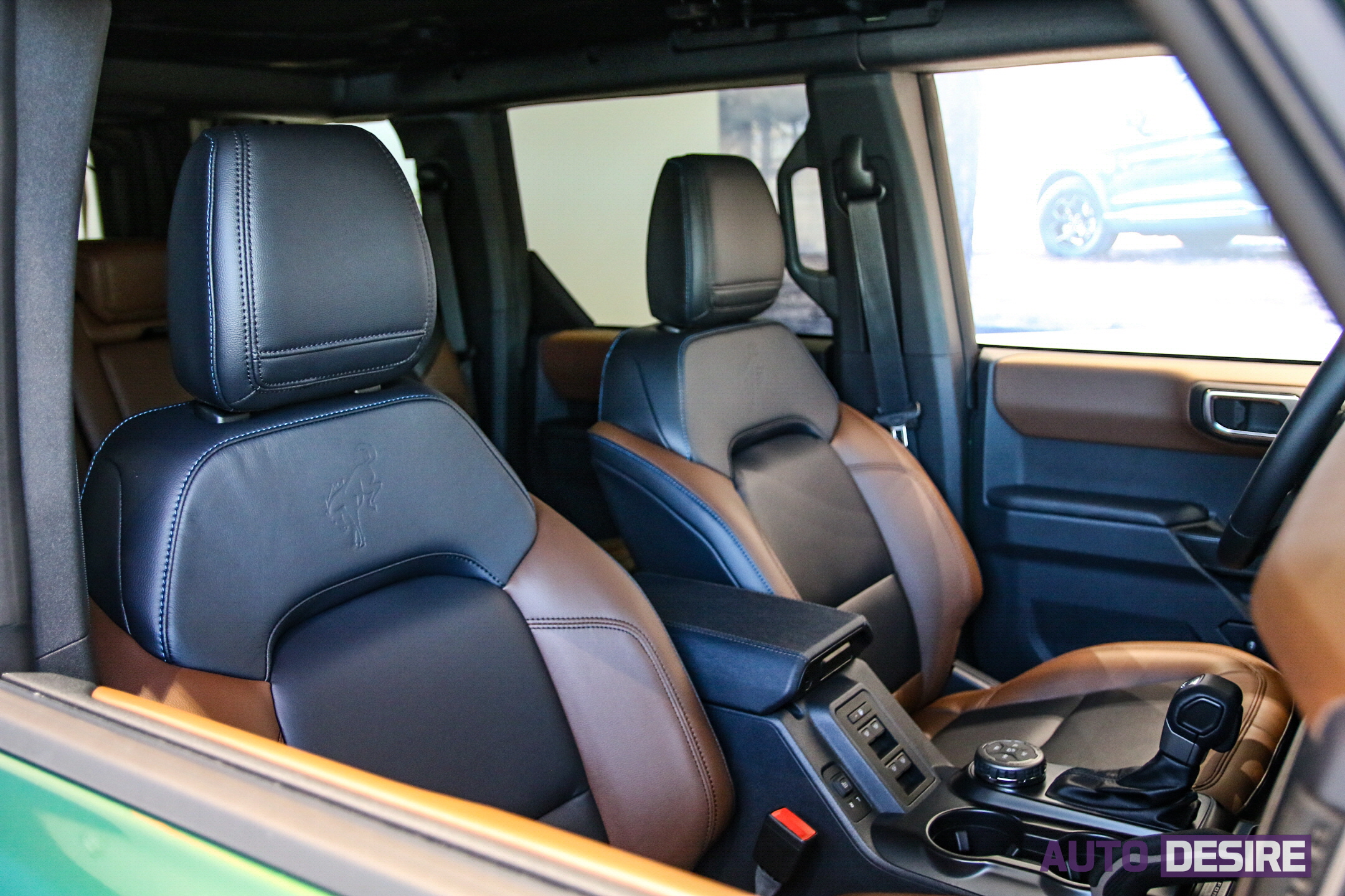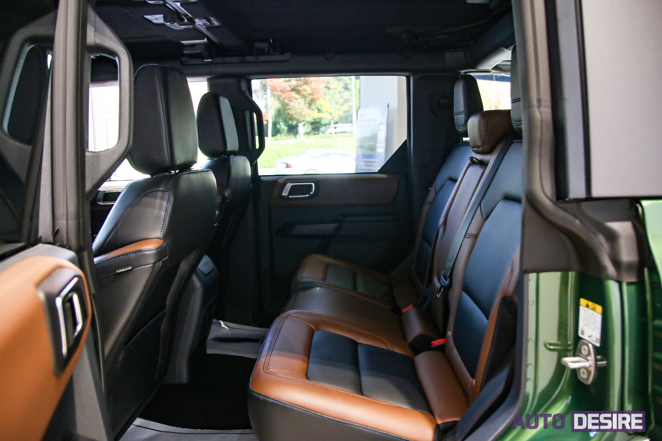 이어서 2024 포드 브롱코 2.3 에코부스트 모델의 실내에도 투톤 인테리어 컬러가 적용되며, 전시차에는 클래식하면서도 고급 진 감성의 블랙/브라운 투톤 인테리어가 적용되었다. 다만 2.7 모델에는 사이드 그립과 센터 콘솔 그립에 블루 포인트 컬러가 적용되지만, 2.3 모델에는 그레이 포인트 컬러가 적용된다.