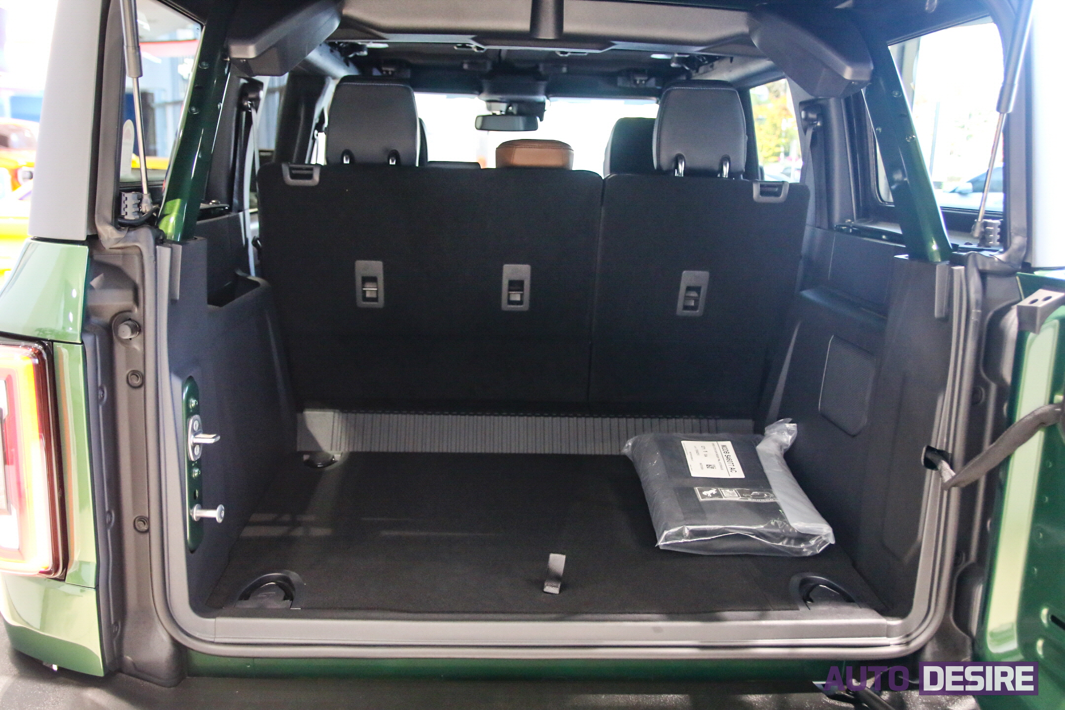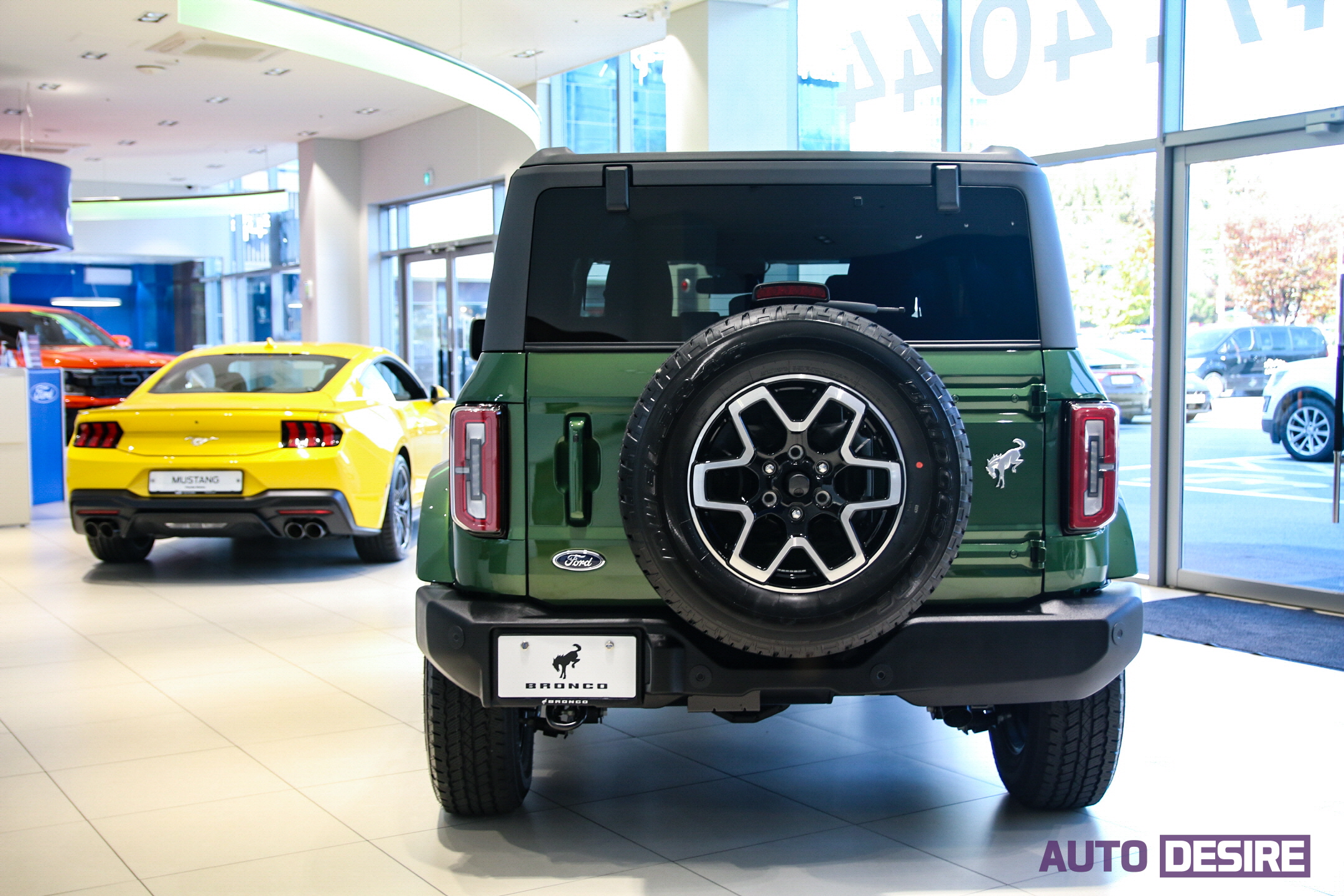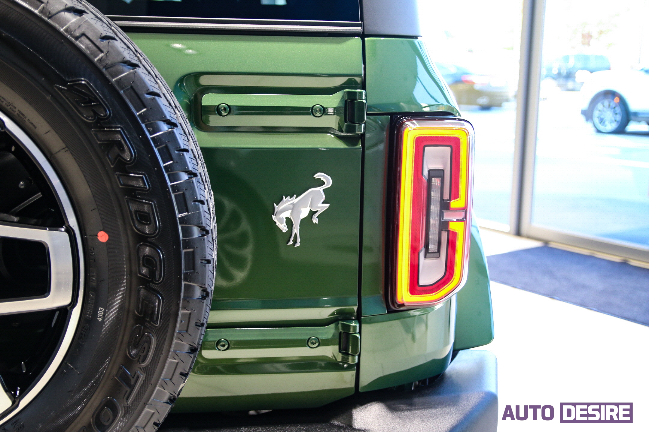 후면에서는 노출되어 있는 스페어타이어, 옆쪽으로 열리는 테일게이트, 플립 업 타입의 리어 글라스로 정통 오프로드 SUV의 특징은 유지하면서, 수직형으로 슬림한 LED 리어 램프를 적용해 세련미를 좀 더 더했다. 운전석 방향으로 테일게이트 손잡이 하단에는 포드 레터링 로고가, 조수석 방향으로 테일게이 경첩 사이에는 브롱코 전용 야생마 로고가 적용된다.