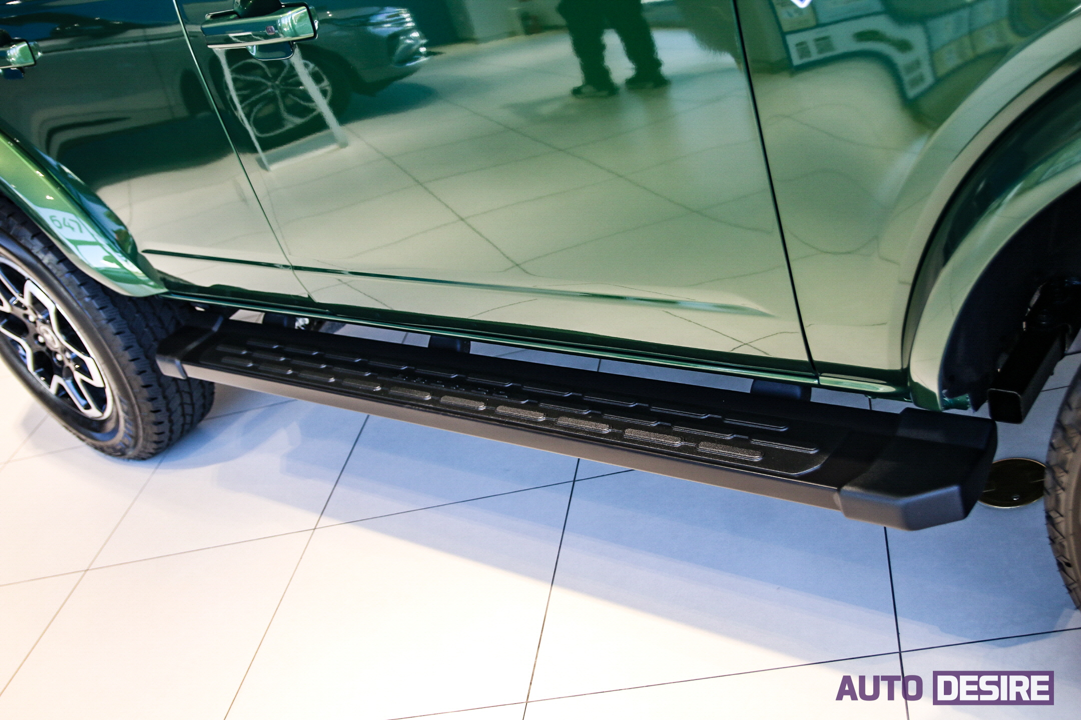 차체 측면에서는 높은 지상고에도 승하차가 불편하지 않도록 고정식 사이드스텝이 장착되었다. 2.3 모델도 2.7 에코부스트와 동일한 아우터뱅크스 트림으로 255/70/18 사이즈의 올 터레인 타이어와 트윈 6-스포크 투톤 디자인 휠, 프런트 펜더에 아우터 뱅크스 로고 데칼, 휠캡에 브롱코 전용 야생마 로고가 적용된다. 사이드미러가 도어 외부 패널이 아닌 전면 유리 하단의 카울 부분에 부착되어 있어 도어를 떼어낸 상태에서도 미러는 온전히 사용할 수 있는 것도 브롱코의 장점.