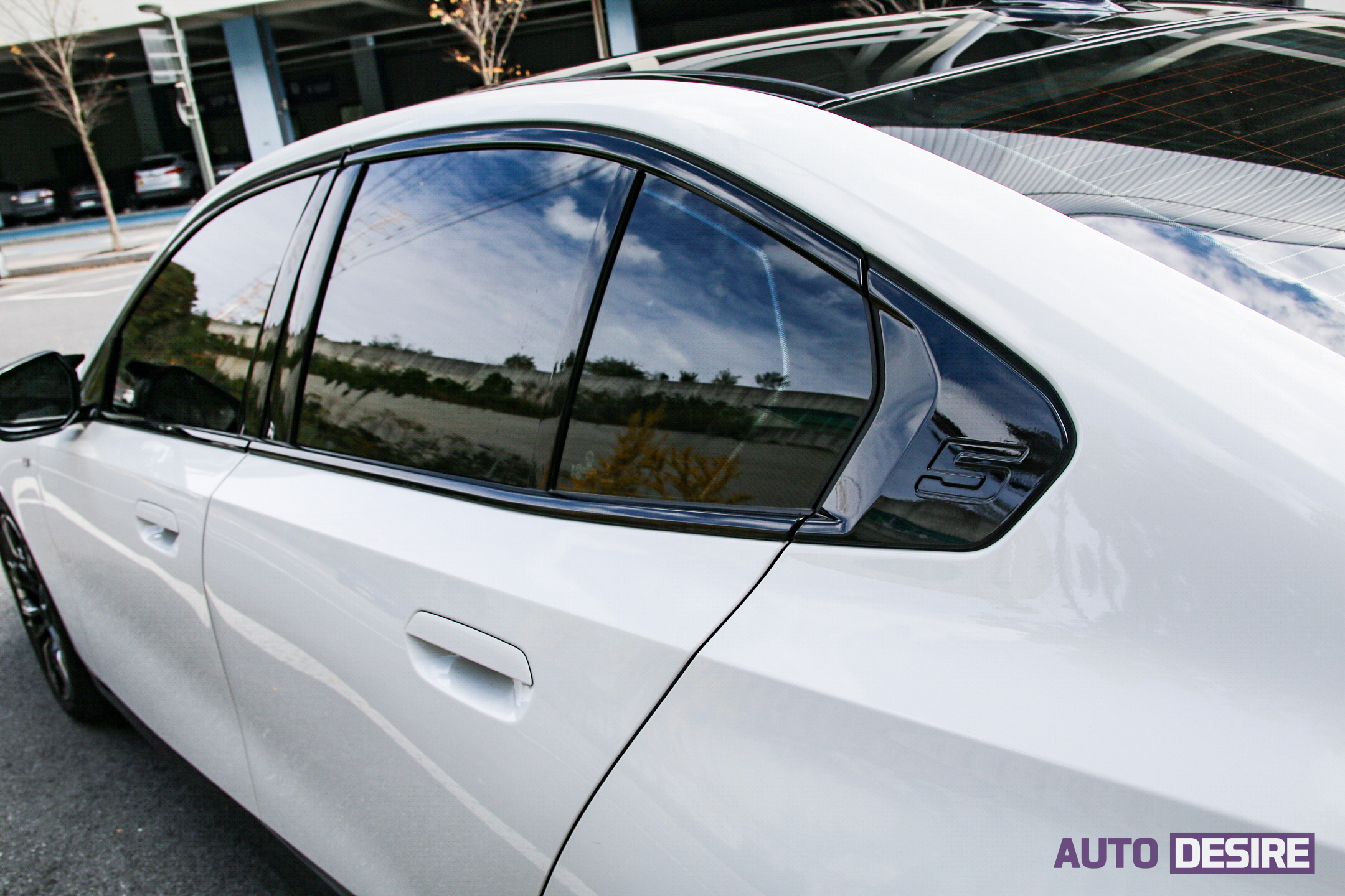 측면에서는 8세대 5시리즈의 공통 사항으로 길게 뻗어 나오는 노즈, 매끄럽게 트렁크까지 이어지는 루프라인으로 경쟁 세단들과 비교해도 가장 스포티한 비례감, 라인을 전하며 블랙 윈도우 라인과 더불어 차체 하단에도 블랙 하이글로스 클래딩을 더해 대비감과 스포티한 감성을 높였다.