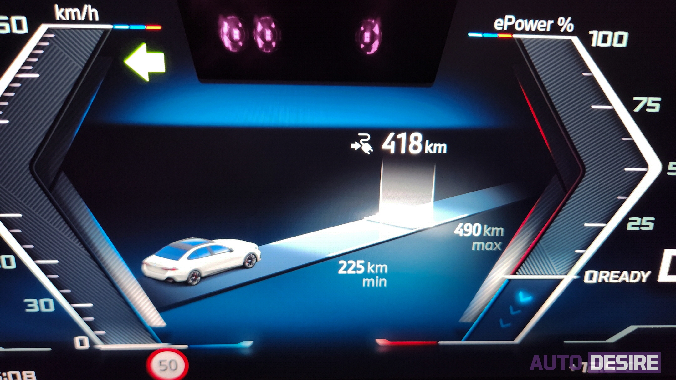 용인 신갈 IC 인근에서 배터리를 100%까지 충전한 직후 표기된 주행 가능 거리(주행모드 퍼스널)는 459km, 에어컨을 2단, 송풍강도 2단계로 작동 후 표기된 주행 가능 거리는 418km로 출발 전에 이미 공인 복합 주행 가능 거리를 상회하는 수치가 표기되었고, 이후 대구 엑스코까지 고속도로 및 약간의 도심 구간(영동고속도로, 중부내륙고속도로, 이후 북대구 IC 진출 후 엑스코까지 주행)을 포함해 258km, 3시간 10분여를 주행한 후 기록한 평균 전비는 5.7km/kWh, 남은 주행 가능 거리는 198km로 실 고속 전비가 공인 수치보다 월등히 상회하며, 같은 조건으로 계속 주행 시 450km 이상 주행이 가능한 결과를 보여줬다.
