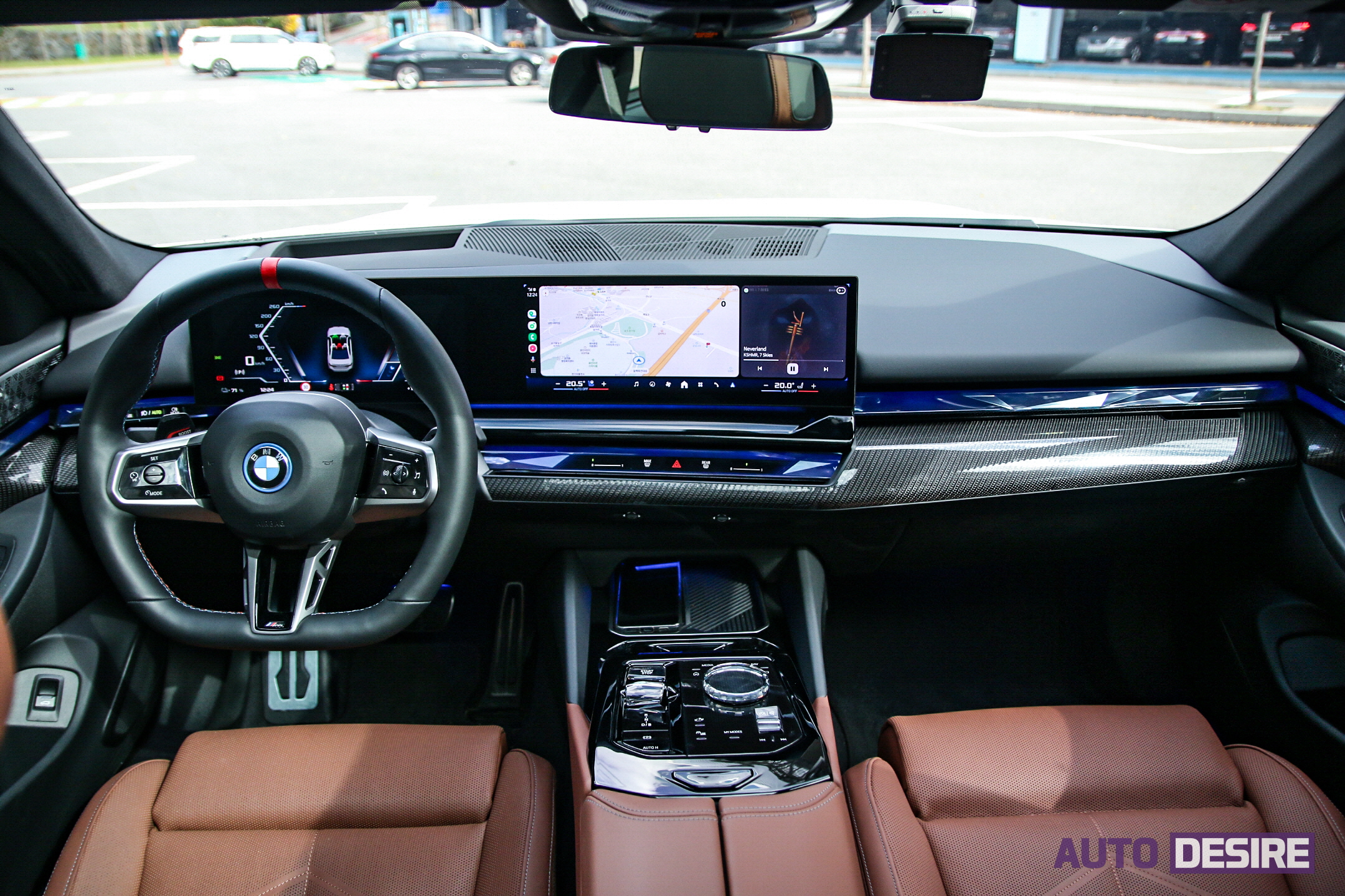실내에서도 최신 BMW 모델들과 신형 5시리즈와 공통된 사항으로 심플하면서도 입체감 있는 수평형 레이아웃과 12.3인치 디지털 클러스터와 14.9인치 대화면 센터 스크린이 하나로 이어지는 BMW 커브드 디스플레이를 적용하되, i5 M50의 고성능 감각을 살리기 위해 림 상단에 센터 레드라인이 더해진 D 컷 M 스포츠 스티어링 휠, M 카본 파이버 인테리어 트림, M 컬러 스티칭이 적용된 시트벨트가 적용되었고, 센터 콘솔에는 eDrive40 모델과 동일하게 토글 타입 기어 셀렉터와 iDrive 다이얼 컨트롤러를 크리스탈로 마감하고, 도어 트림과 크래시패드 라인을 따라 운전자 취향에 맞게 색상 선택이 가능한 인터랙션 바가 더해져 고급감을 높였다.