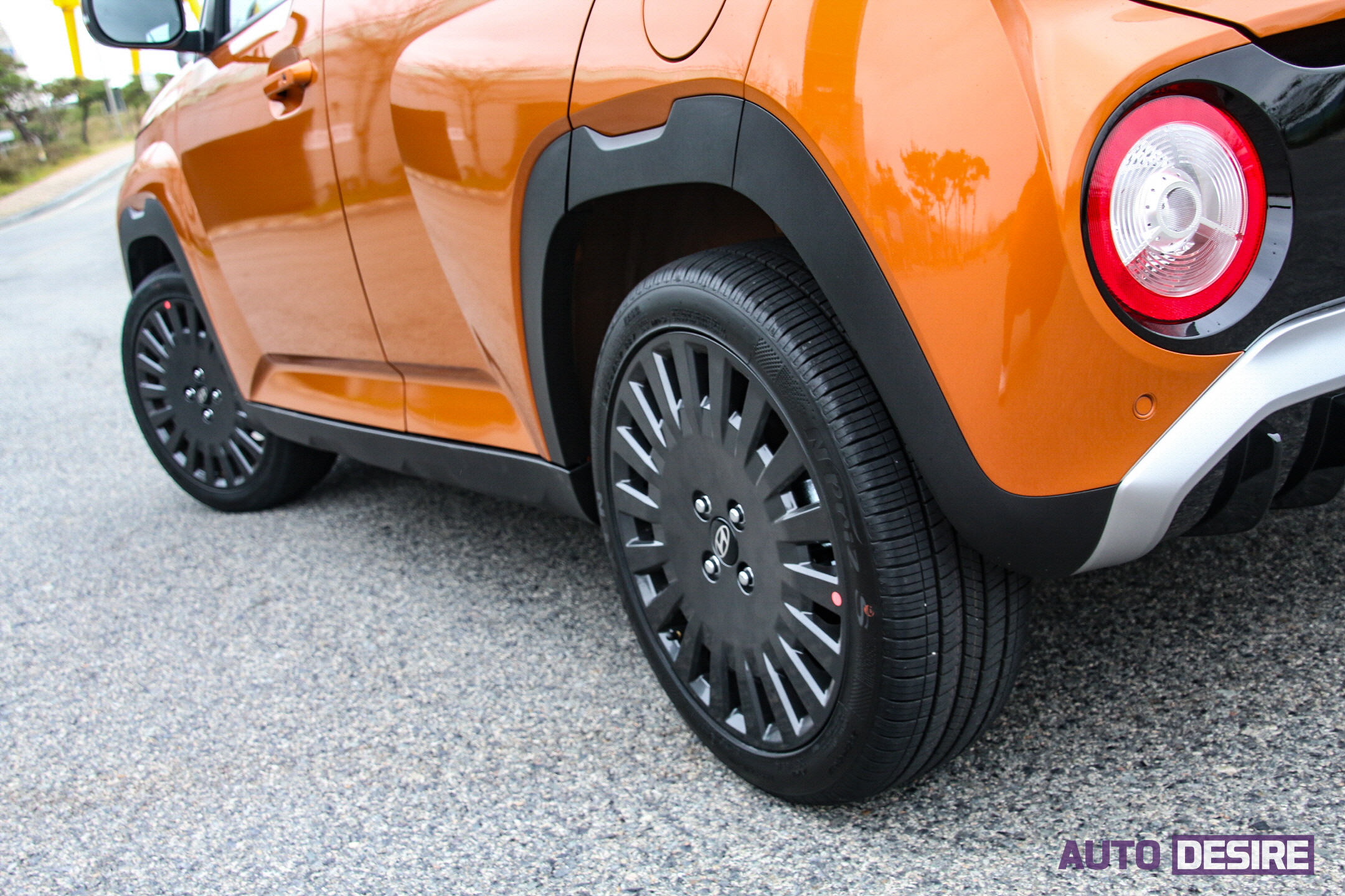 측면에서는 17인치 알로이 휠을 동그란 리볼버 타입 4-스포크 디자인으로 변경해 독특한 느낌을 주는데, 시승차의 경우 액티브 플러스 옵션이 적용되어 있어, 기존 캐스퍼 액티브 플러스와 동일한 17인치 다크 그레이 멀티 스포크 휠이 적용되고 리어 스포일러도 더 연장되어 스포티한 느낌을 준다.
