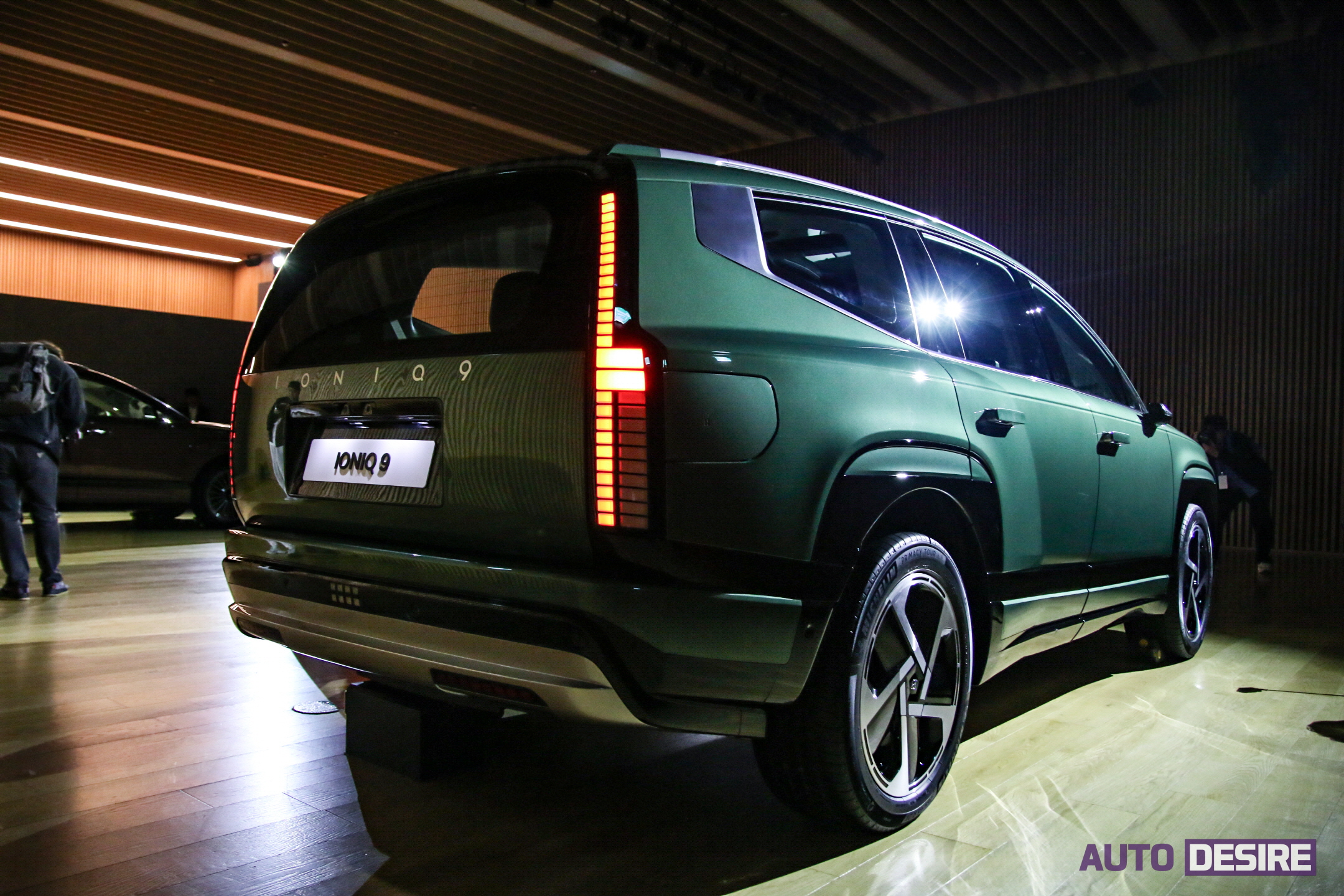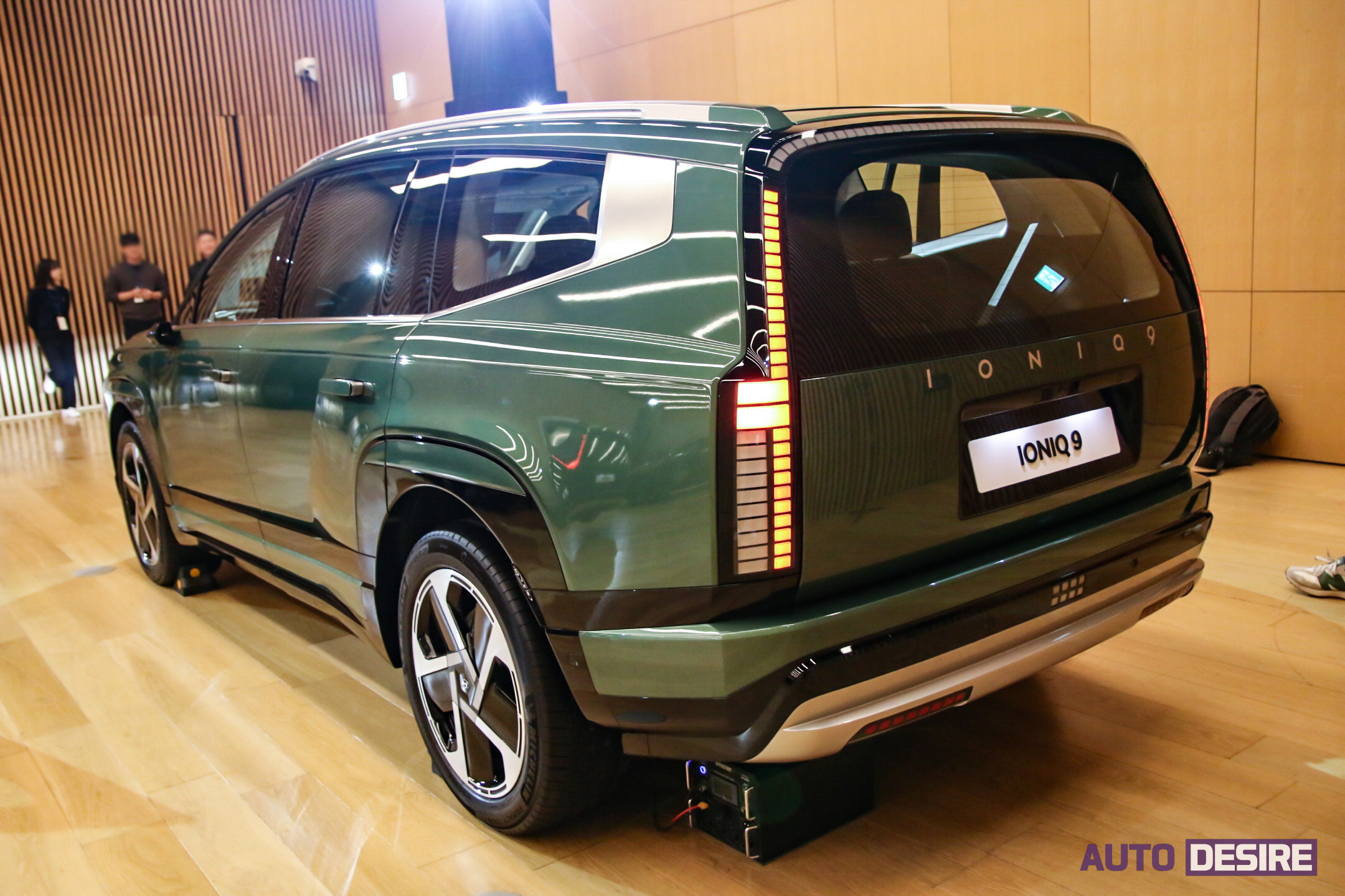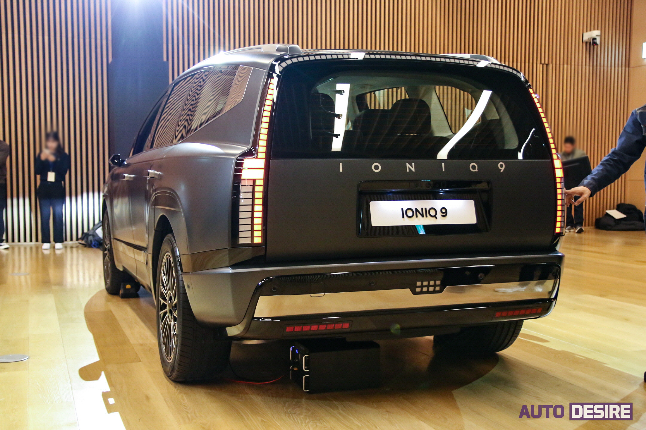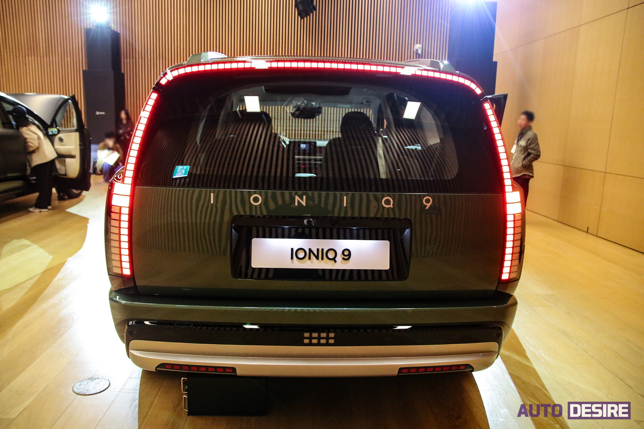 후면에서는 슬림하게 수직으로 솟은 리어 콤비네이션 램프로 대형 SUV의 웅장한 맛을 제법 잘 살렸고, 리어 글라스 위쪽까지 감싸는 형태로 세븐 콘셉트의 디자인을 최대한 충실하게 반영하고자 한 모습이다. 전면 램프와 마찬가지로 리어 램프를 비롯해 범퍼 중앙의 후진등, 하단 리어 리플렉터까지 파라메트릭 픽셀을 적용했으며 테일게이트에는 현대 H 이니셜 엠블럼 대신 IONIQ9 모델명 레터링만 남겨놓아 '아이오닉' 브랜드 차량으로써 정체성을 더 높여놨다.