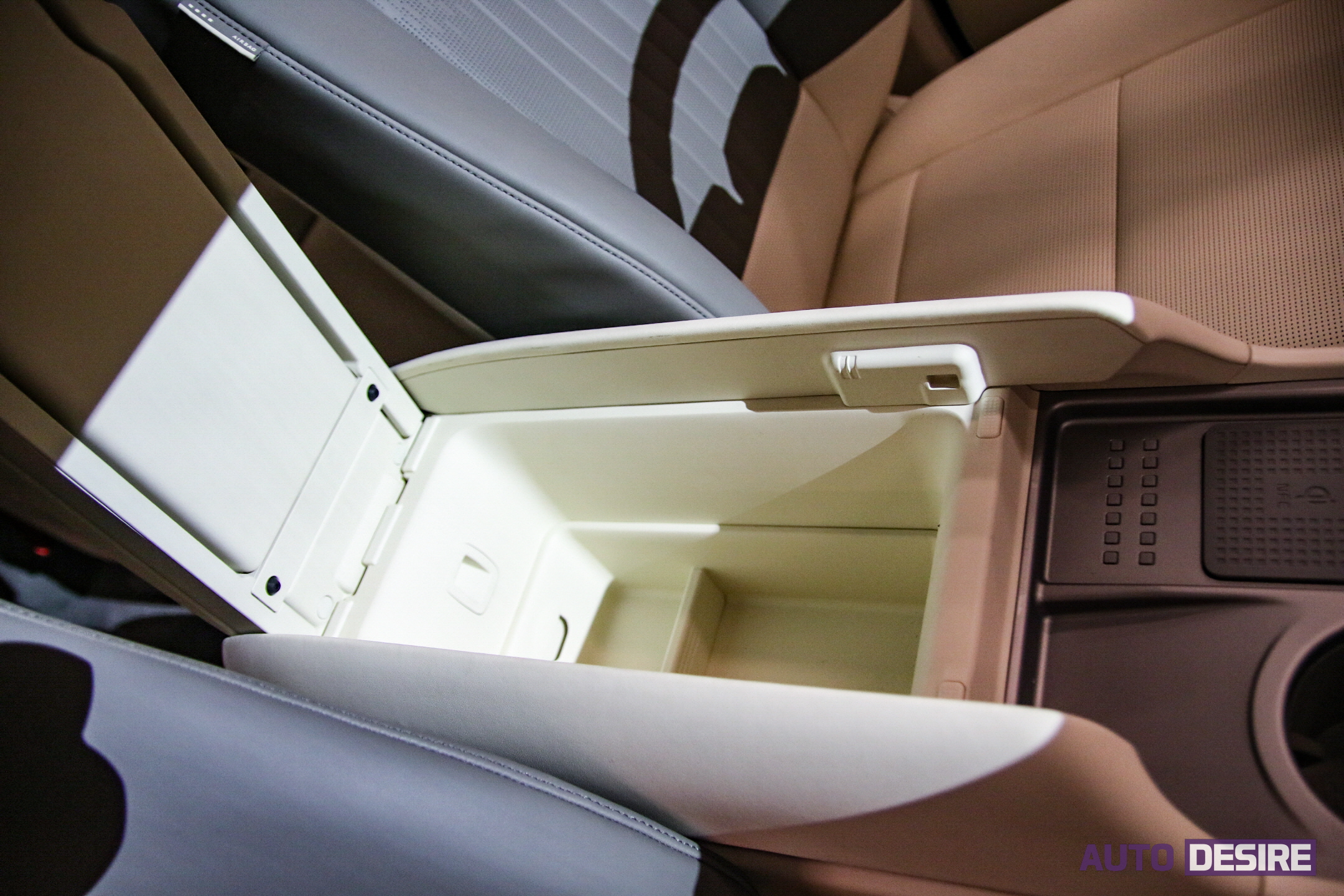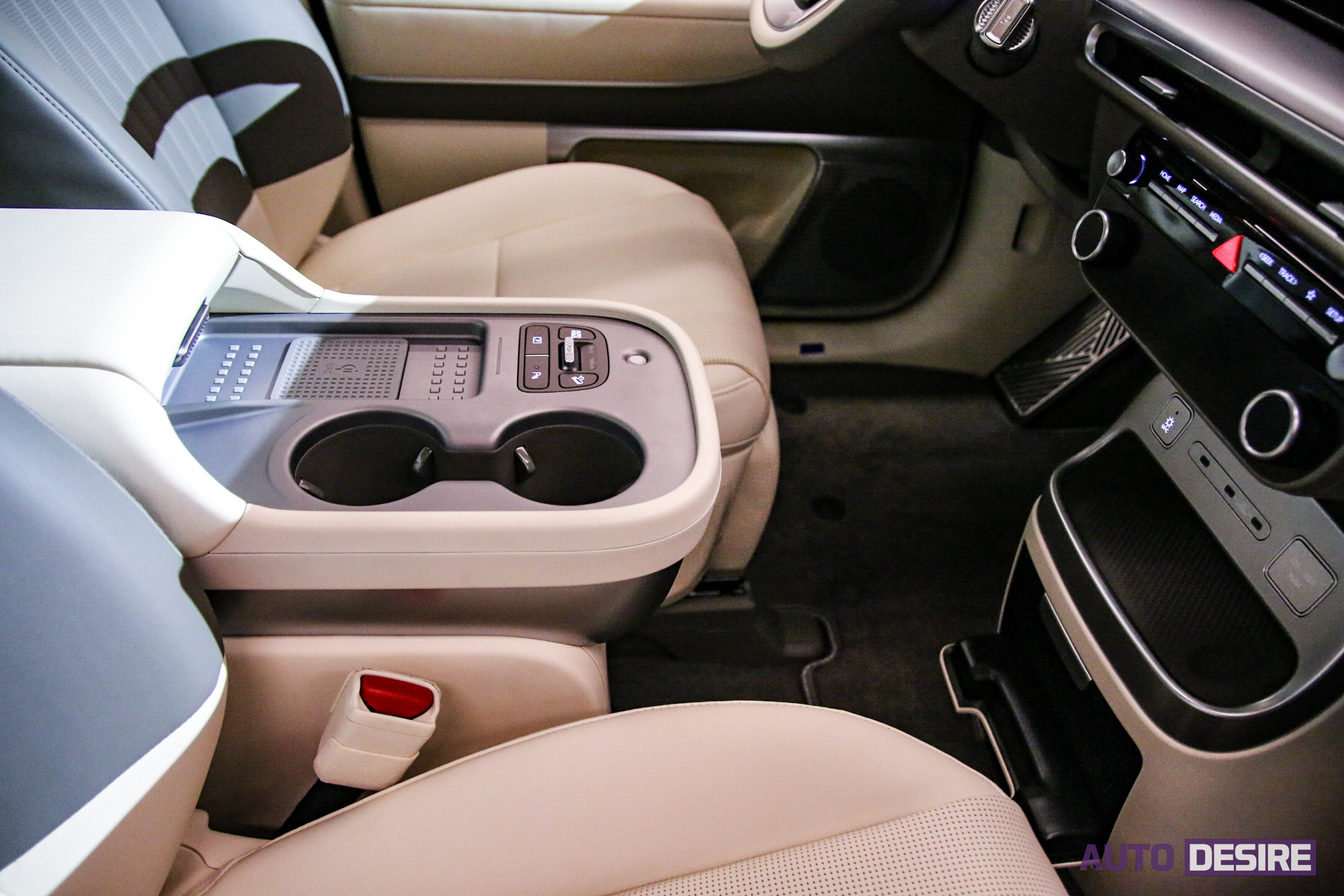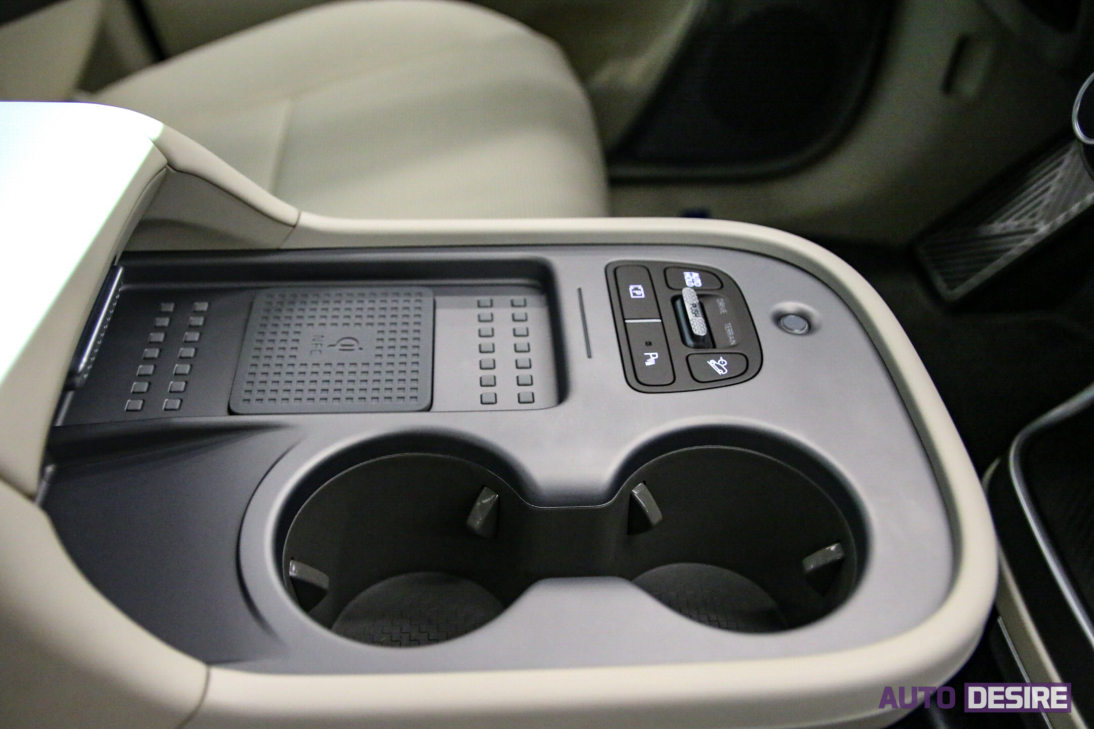 유니버셜 아일랜드 2.0 콘솔의 앞쪽에는 드라이브 모드/터레인 모드, 오토홀드, 경사로 저속 주행 장치, 서라운드 뷰 카메라, 주차 센서, 지문 인증 시스템 버튼과 함께 스마트폰 무선 충전 시스템, 컵홀더가 마련되었고, 바로 뒤에 암레스트는 앞뒤 양방향으로 개방이 가능해 콘솔박스를 1열과 2열 승객이 모두 편하게 열 수 있다.