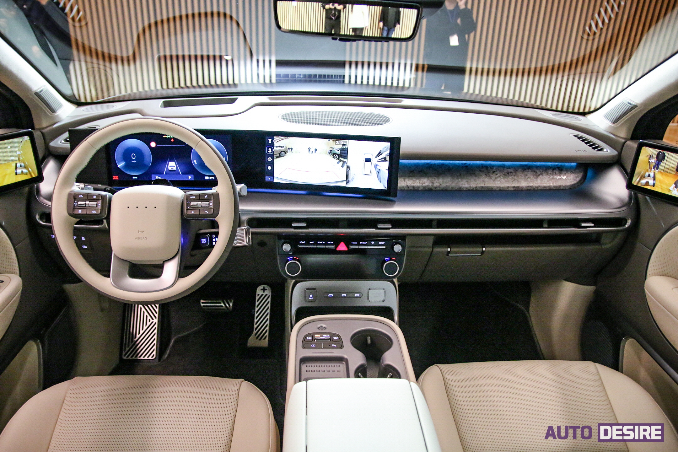 1열 공간은 최신 현대자동차 모델들의 공통된 슬림하고 와이드하게 펼쳐지는 수평형 레이아웃을 바탕으로 하되, 외관에서와 마찬가지로 타원 및 곡선 스타일을 적극 활용해 실내 전체가 감싸지는 듯한, 안락하고 편안한 분위기를 느끼게 해준다. 선반처럼 단이 나눠진 대시보드 상단으로 최신 ccNC 인포테인먼트 시스템이 탑재된 파노라믹 커브드 디스플레이(12.3인치 디지털 클러스터 및 12.3인치 인포테인먼트 시스템)가 위치하고, 센터패시아의 슬림한 송풍구 아래로 간결한 버튼과 함께 터치 타입 공조 컨트롤러가 위치한다.