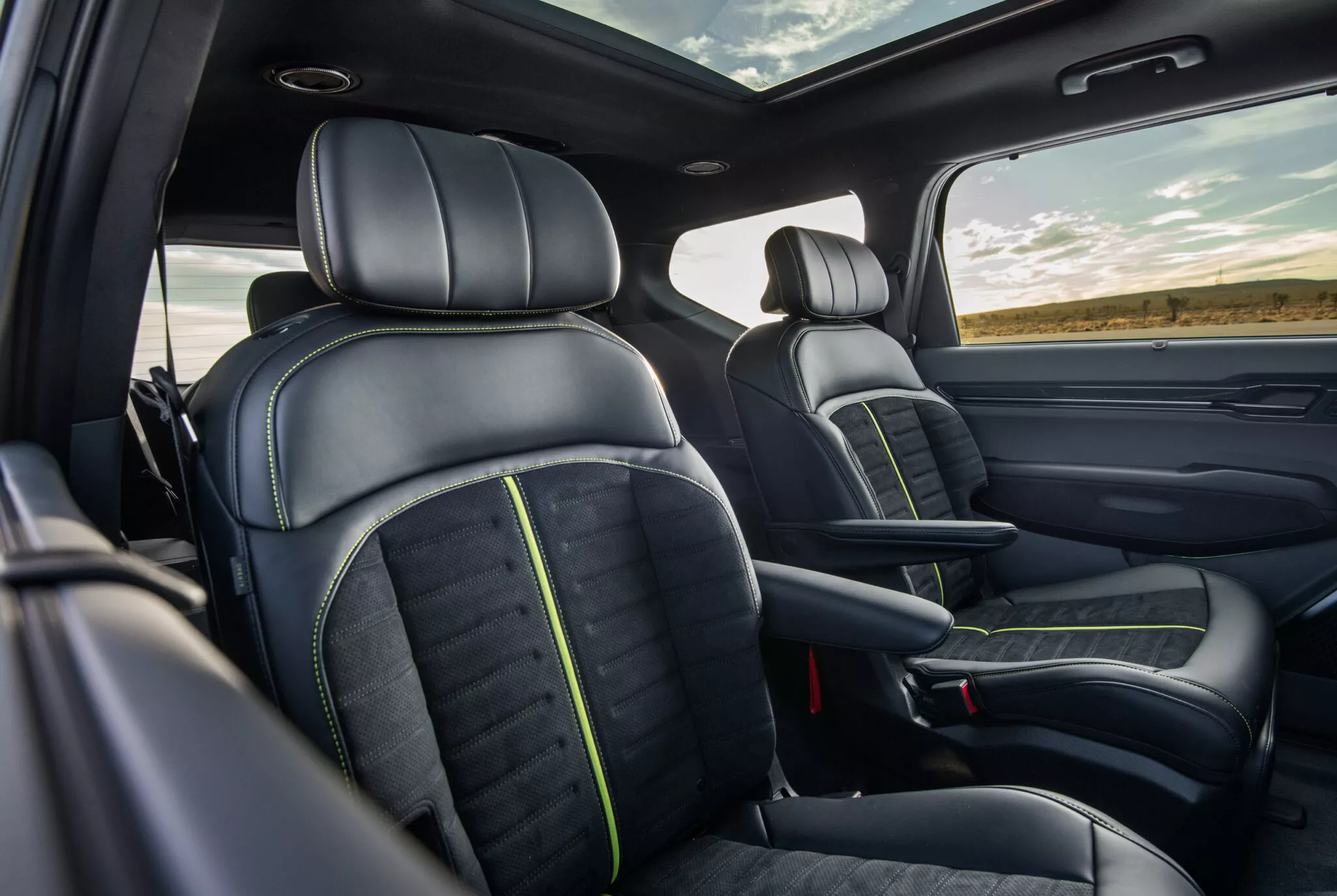 또한 1열 시트의 후면에도 스웨이드 재질 마감과 함께 시트백 앰비언트 라이트가 추가로 적용되고, 2열 독립 시트 및 3열 시트도 네온 스티칭과 센터 라인, 스웨이드 마감 등이 더해져 EV9 GT만의 특별한 실내를 완성한다.