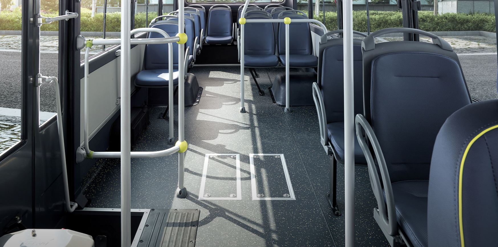 탑승객들의 승하차 시 안전확보를 위해 중문에 초음파 센서와 도어 끼임 방지 터치 센서를 기본 적용해 승객이 타고 내리는 동안 문이 닫히거나 신체가 문에 끼어 사고가 생기는 것을 방지하며, 특히 초음파 센서는 가속 페달과 연동되어 출입문 부근에서 승객 움직임이 감지되면 가속페달을 밟아도 차량이 출발하지 않는다. 또한 버스가 승강장에 진입할 때 탑승객들이 이를 인지하고 충돌하는 일이 없도록 가상 엔진 사운드 시스템과 후방 주차 보조 시스템도 기본 탑재했다. 엔진이 아닌 배터리와 전기모터 탑재로 차량 하부 공간이 더 확보되어 승객 출입도 더 쉬워졌고 개방감도 높아졌다.