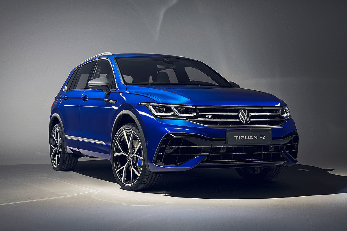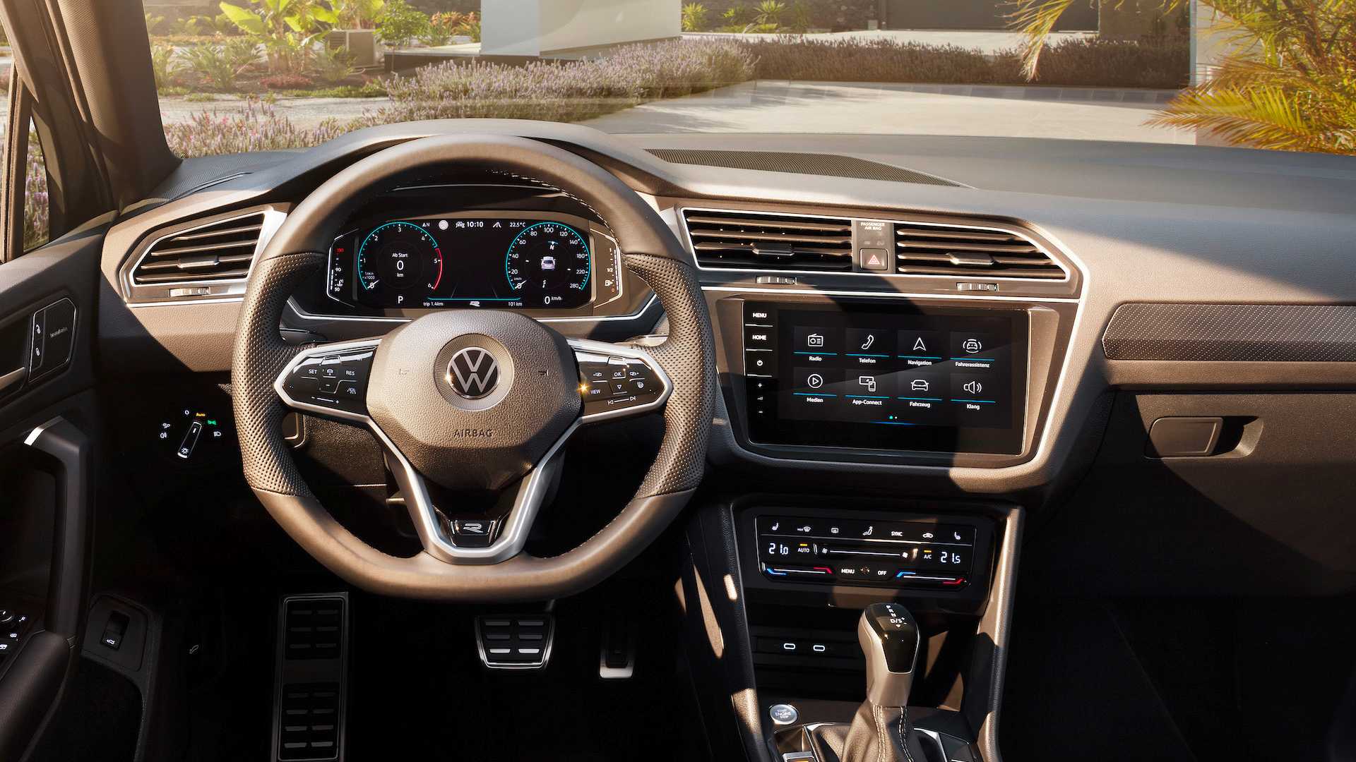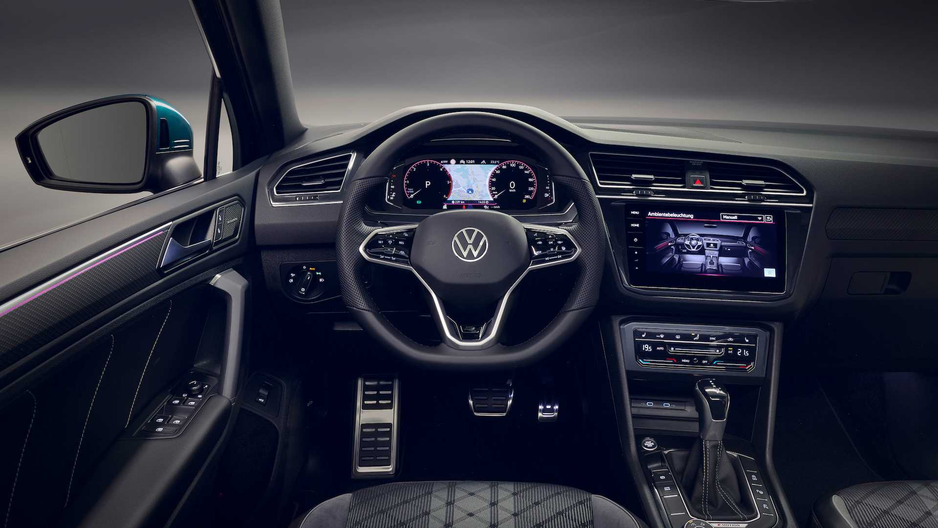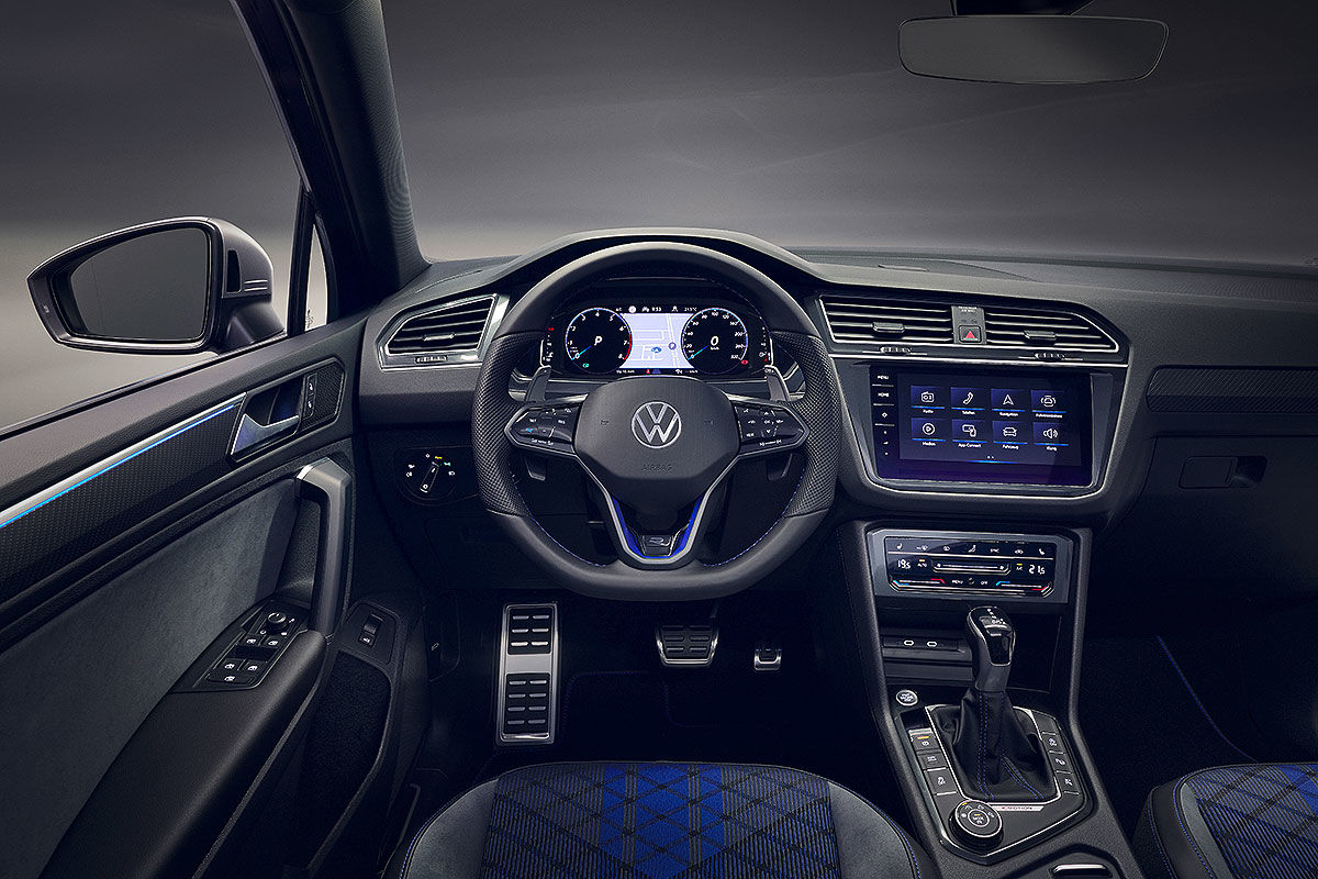 티구안 R의 실내에는 타공 가죽으로 감싼 림, 패들시프트가 더해진 스포츠 스티어링 휠, 블루 포인트 컬러와 전용 시트가 장착된다.