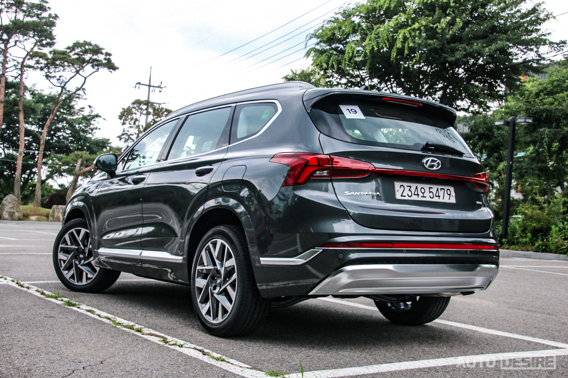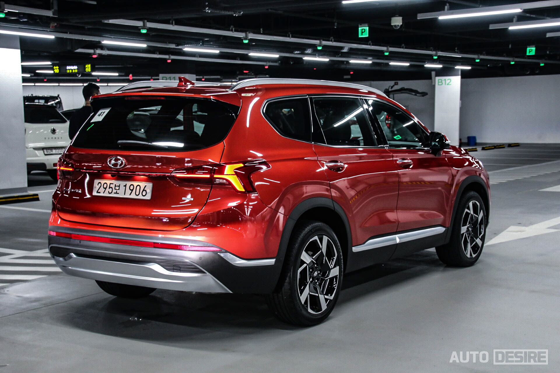 풀체인지 수준으로 확 바뀐 전면부와 다르게 후면부는 여전히 기존 4세대 싼타페의 흔적이 남을 정도의 차이지만, 신규 그래픽을 적용하고 기존의 크롬 가니시 대신 빨간 리플렉터로 좌우를 이어지게 만든 리어 콤비네이션 램프, 범퍼에서 수평형으로 쭉 길게 이은 방향지시등과 리어 리플렉터로 최신의 트렌드를 따르면서도 새로운 느낌을 주기에는 충분하다. 다만 범퍼 하단에 머플러 팁이 아예 사라져버린 건 아쉽다. 깔끔해 보이기는 하지만 진짜 듀얼 머플러 팁까진 아니더라도 머플러 팁 형태의 데코 정도는 남겨줘도 되지 않았을까?