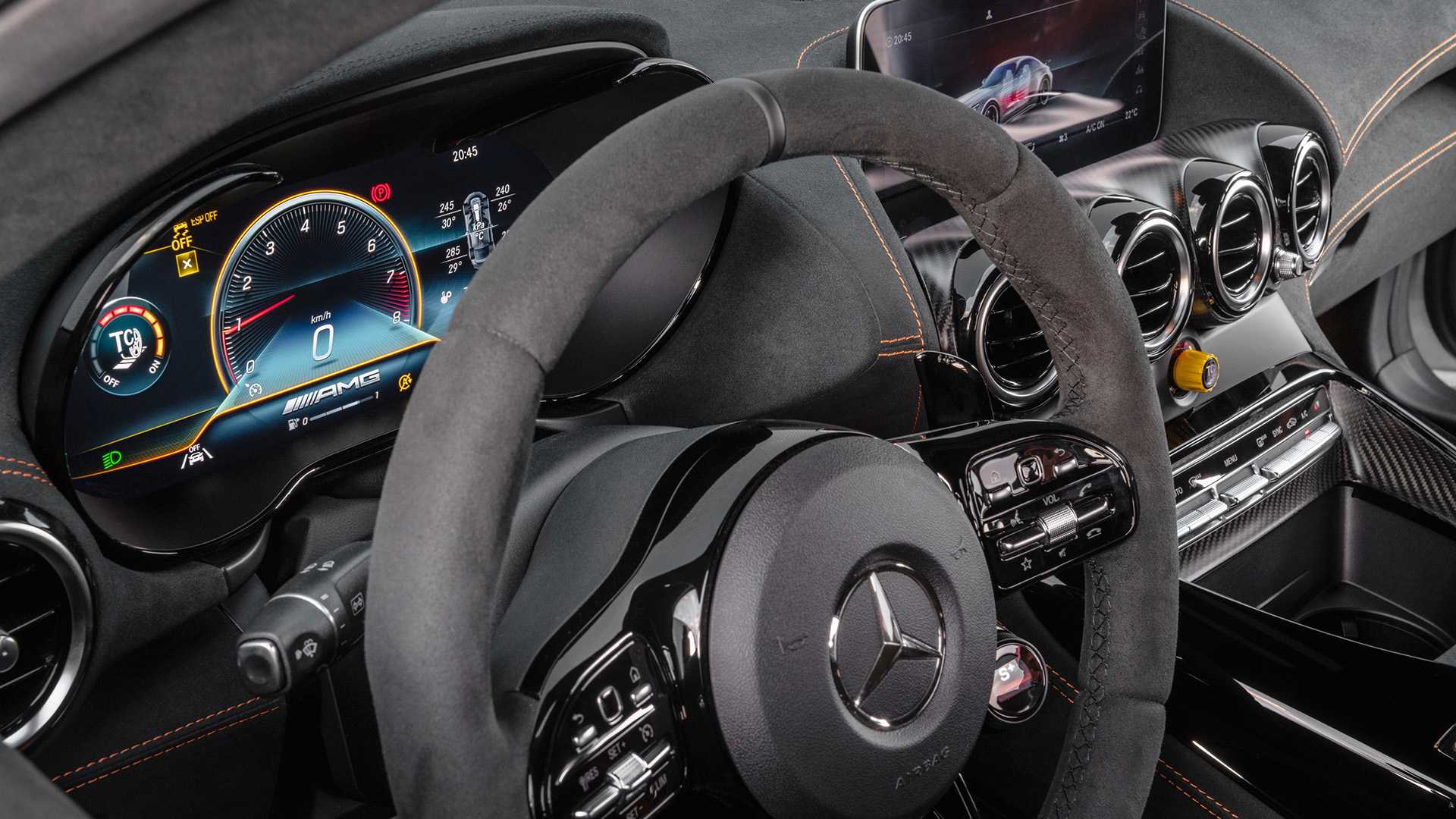 실내에는 AMG 퍼포먼스 스티어링 휠에 오렌지 스티치 포인트가 적용된 실내 마감재와 버킷 시트가 적용되고 트랙션 컨트롤도 송풍구 하단의 다이얼을 통해 단계별로 설정이 가능하다.