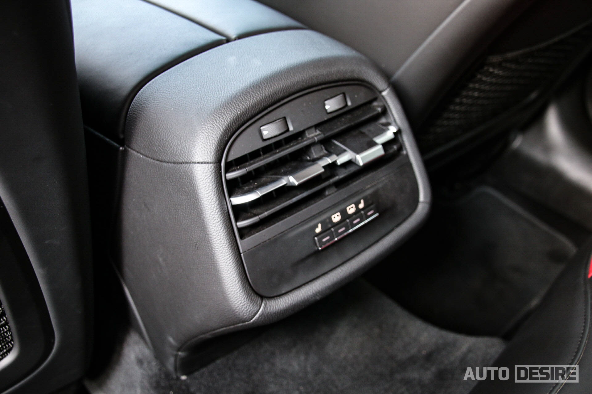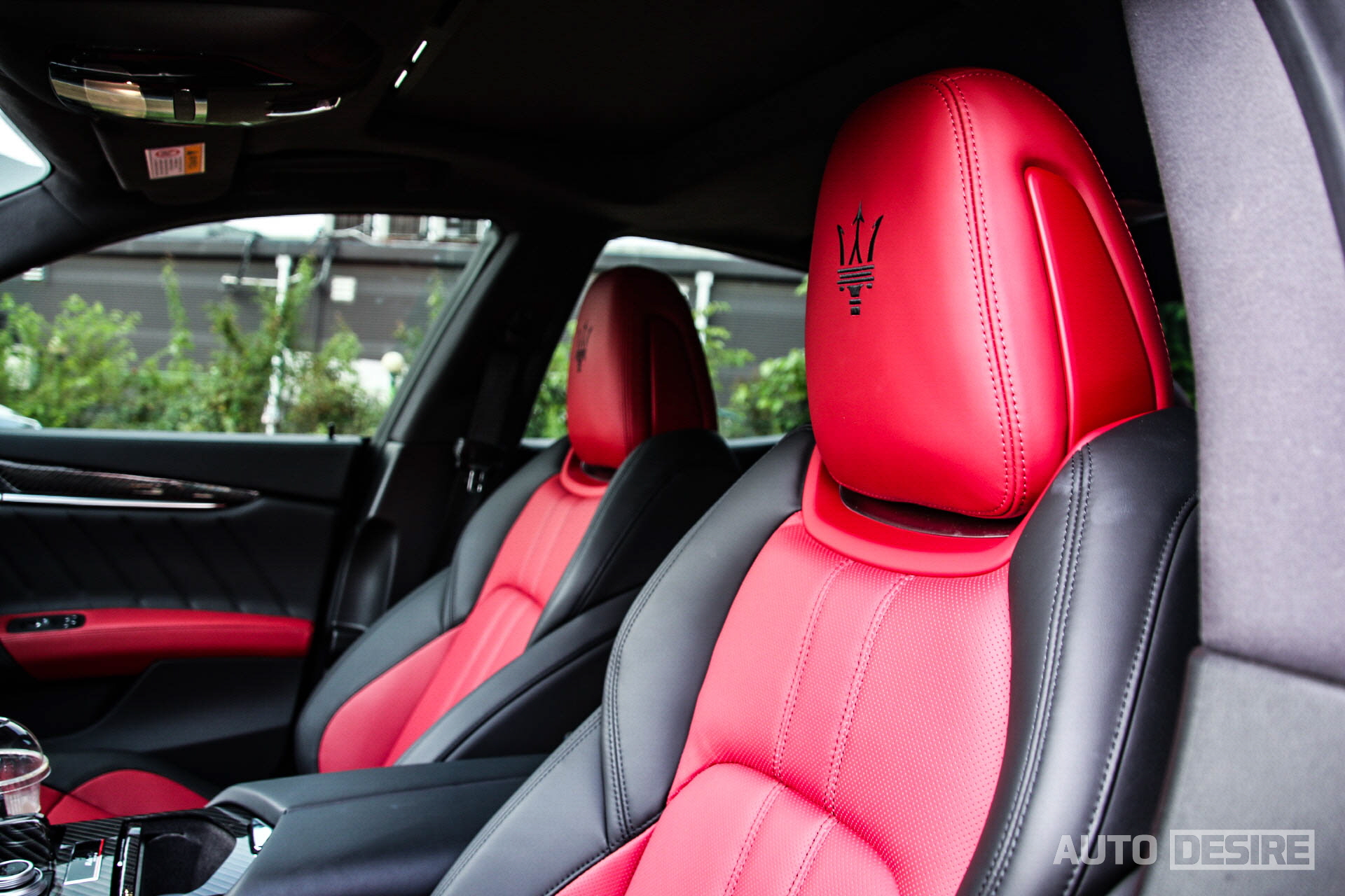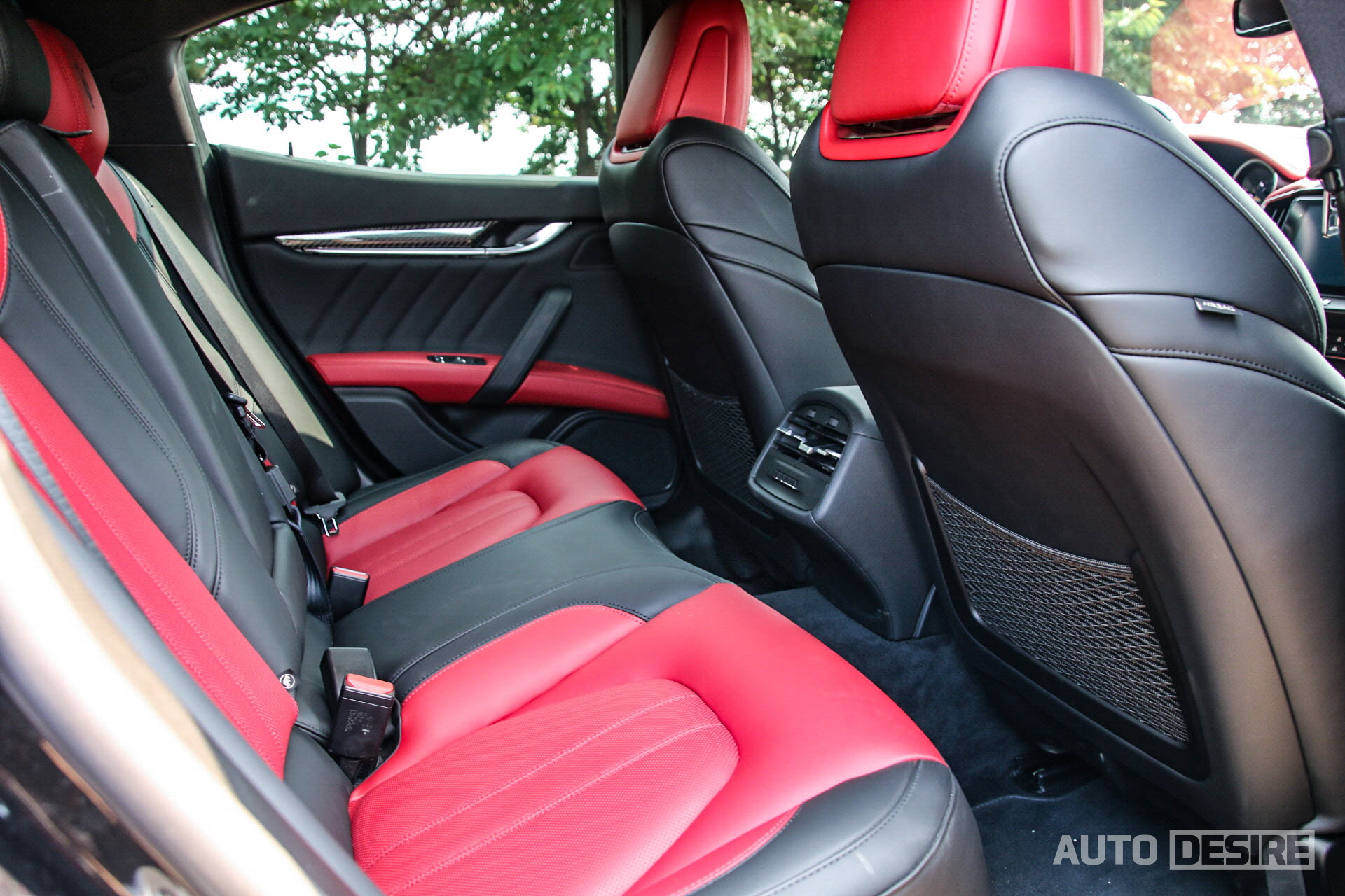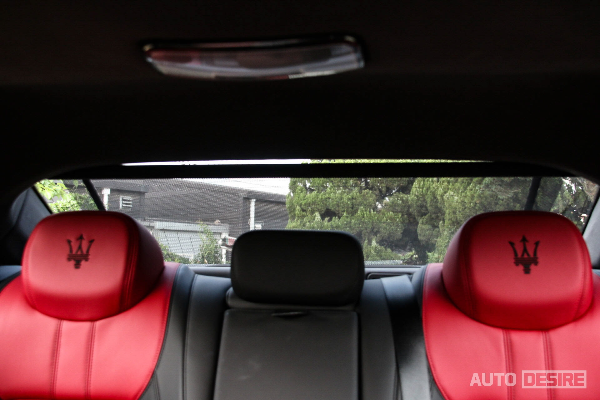 뒷자리 역시 예외는 아니어서 시트와 도어 트림에 블랙/레드 투톤과 카본 가니시를 적용, 헤드레스트에도 삼지창 자수를 박아 넣었다. 세단 모델이지만 롱노즈 숏데크 비율의 바디 때문에 E세그먼트의 다른 경쟁 차종들에 비해서 뒷좌석은 다소 협소한 편이지만 키 172cm의 필자가 앉기에는 모자라지는 않은 충분한 공간을 제공하고, 2열 승객을 위한 송풍구와 뒷유리 선커튼 등 편의사양들도 어느 정도 신경 쓴 모습이다.