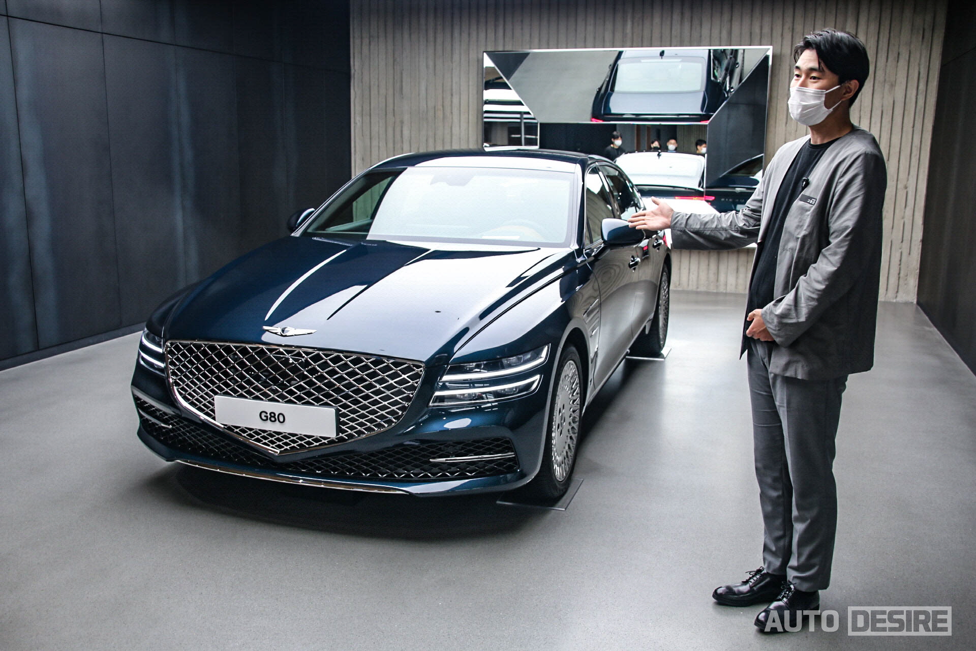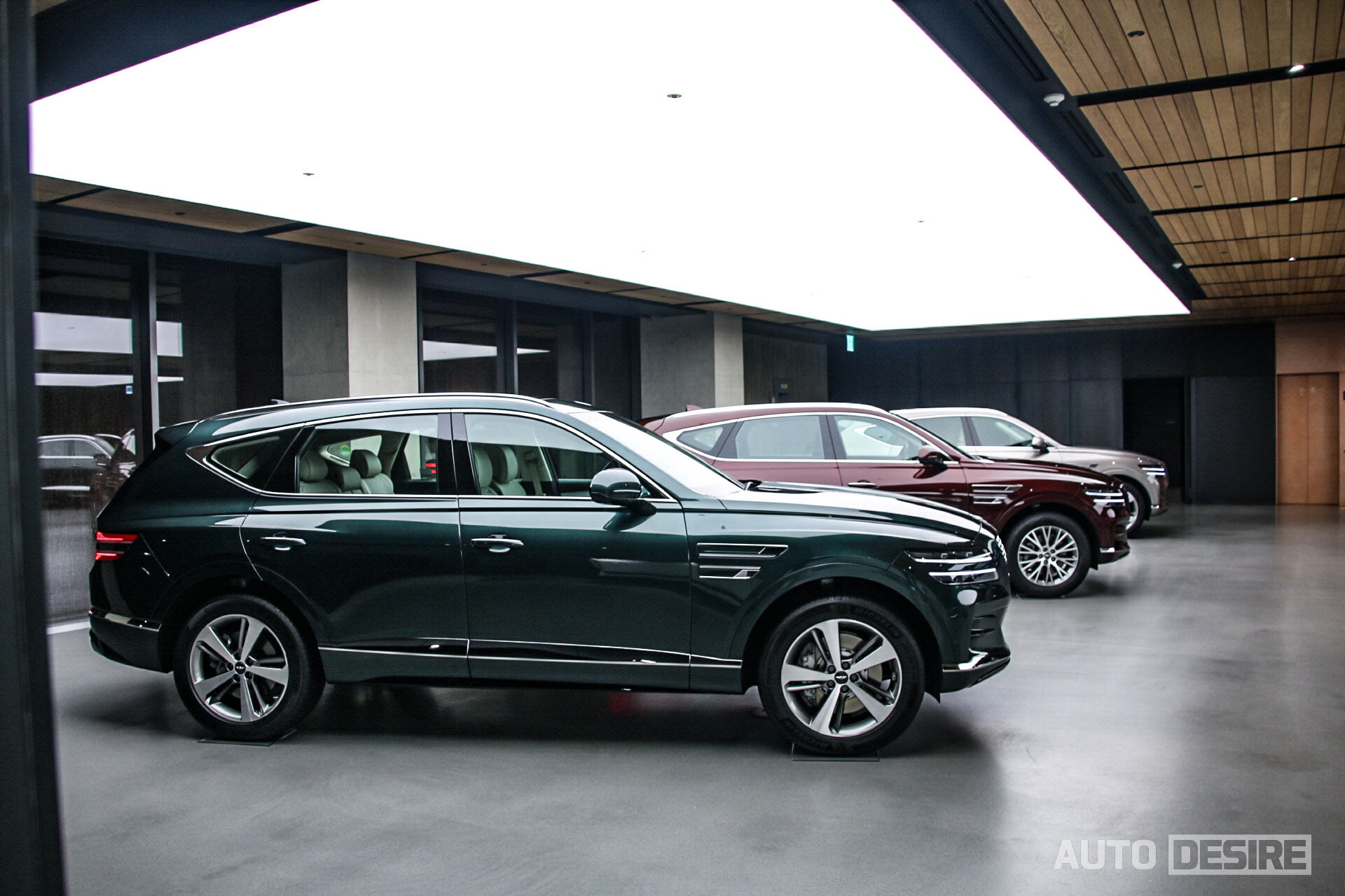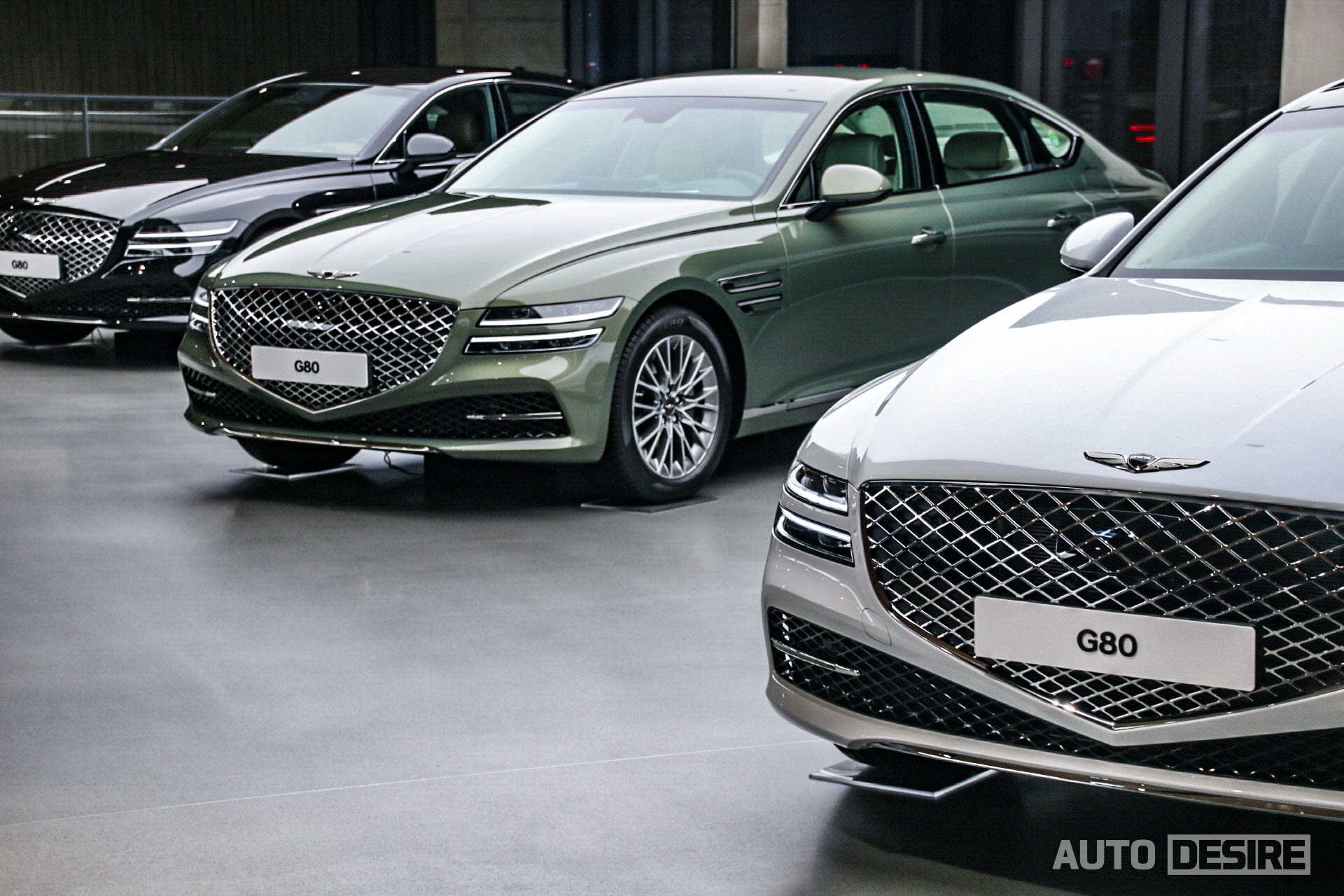 이어 3층에는 제네시스 브랜드의 시작을 알린 모델이자, 제네시스 브랜드 내 가장 큰 볼륨 모델 중 하나인 G80이 역시 각기 다른 엔진/사양들로 태즈먼 블루, 비크 블랙, 핀도스 그린, 우유니 화이트, 베르비에 화이트, 사하라 베이지, 세도나 브라운까지 총 7개가 전시되어 있으며 전시 차량을 통해서도 사이즈별로 각기 다른 디자인의 휠과 다른 가죽 색상과 우드 내장재가 적용된 것을 확인할 수 있는 것은 물론,