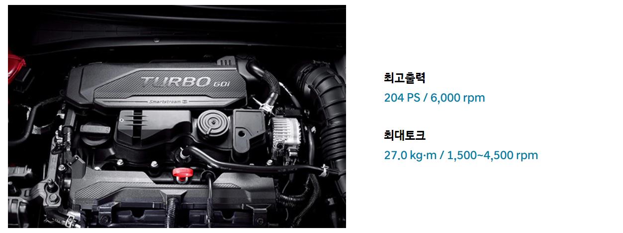 엔진은 스마트스트림 가솔린 1.6 터보 엔진으로 최고출력 204마력, 최대토크 27.0kg.m을 발휘하고 변속기는 6단 수동 변속기와 7단 듀얼 클러치 변속기를 선택할 수 있다. 수치상 출력에서는 전 세대 아반떼 스포츠와 동일한 모습인데, 실질적인 동력 효율은 좀 더 개선되어 성능 향상이 있을 것으로 기대되고 7단 DCT 모델에는 레브 매칭 기능도 적용했다. (6단 수동에 더 필요할 듯싶지만..?) 공인 복합 연비는 7단 DCT가 12.8km/L, 6단 수동이 12.3km/L이다.
