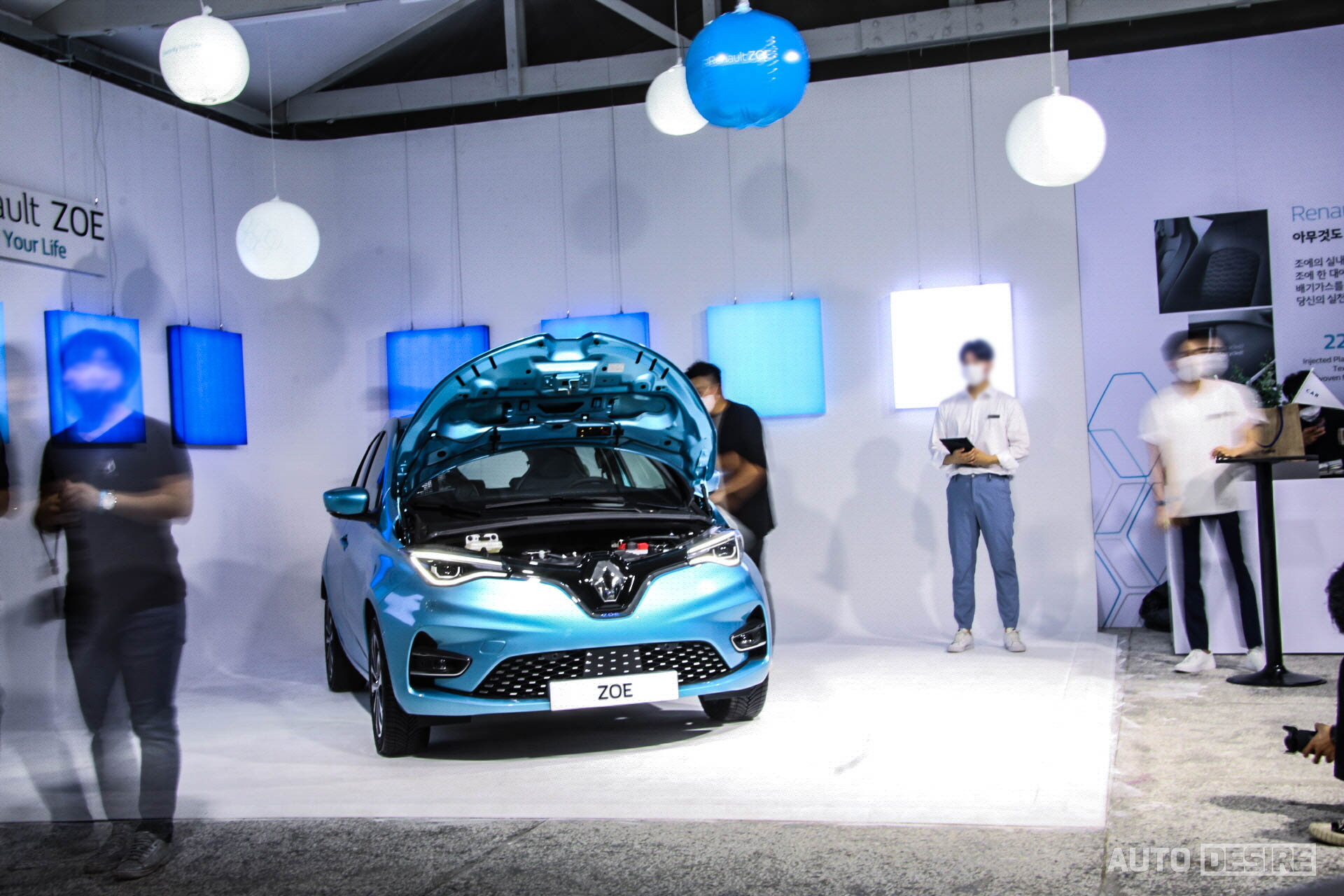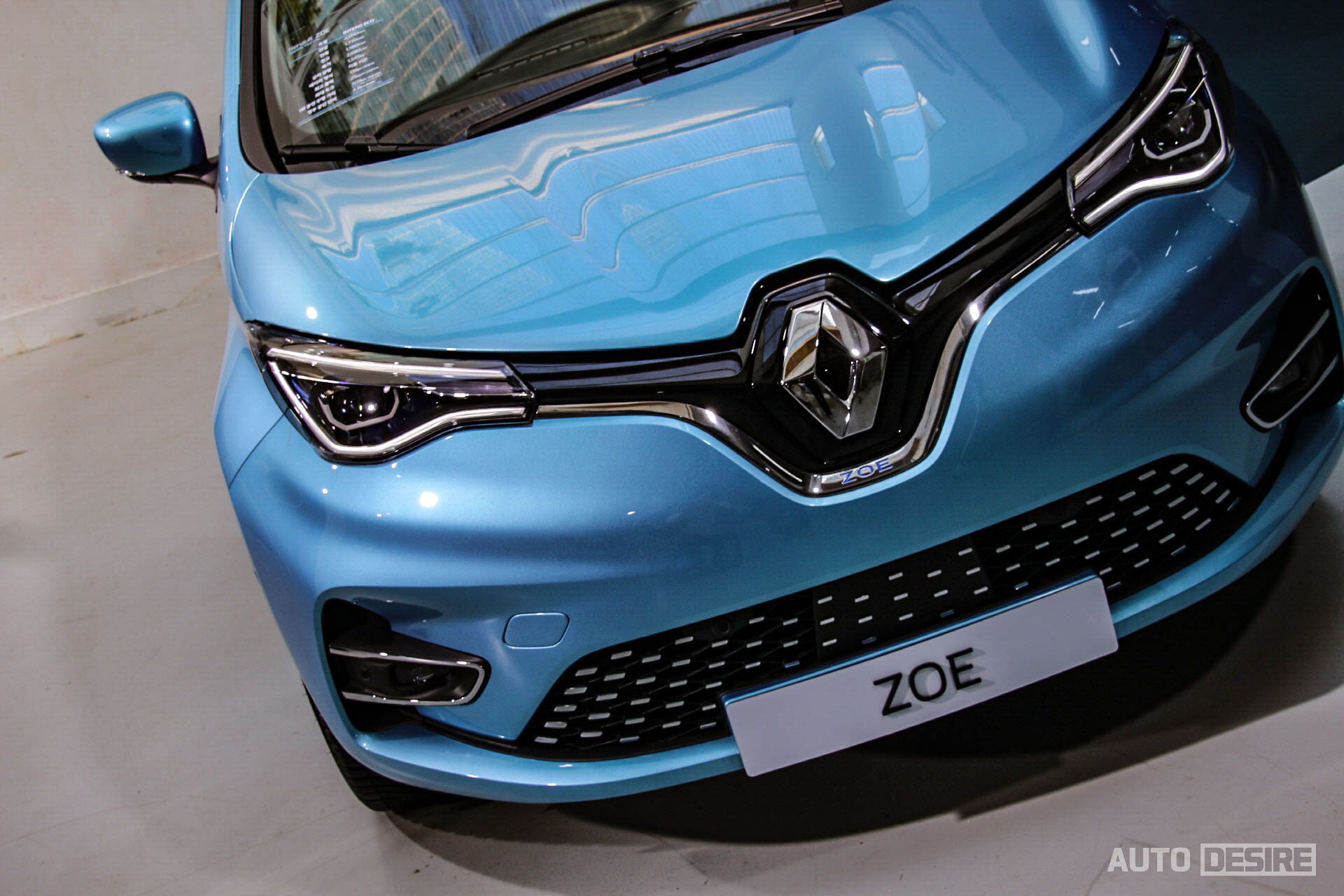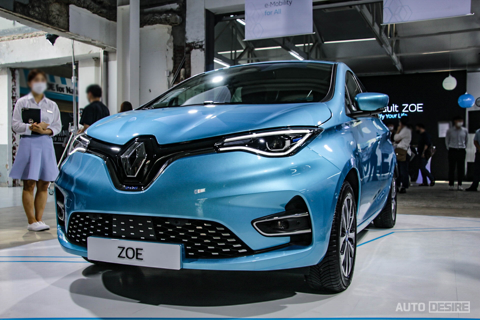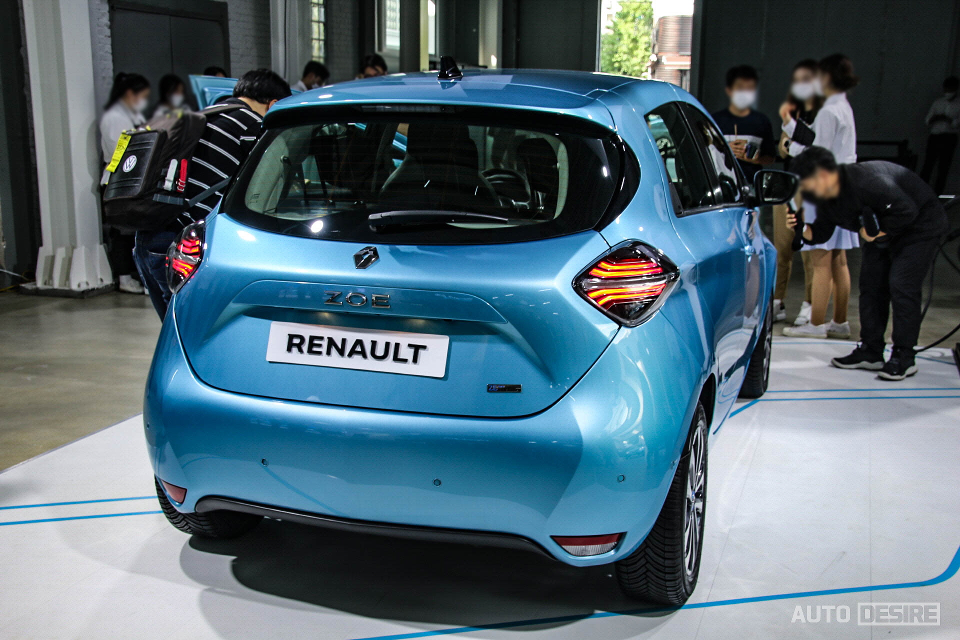 실물로는 처음으로 만나는 새로운 전기차 르노 조에, 하지만 르노만의 아이덴티티가 담긴 디자인으로 친숙함이 느껴지며 전체적으로는 앙증맞고 귀여운듯하면서도 전면부에서는 강렬하고 날렵한 인상이 느껴지기도 한다. 전시 차량들은 인텐스 에코 트림에 세라돈 블루 외장 색상이 적용되어 있는데 눈에 띄는 밝은 파란색이 친환경차에 잘 어울리며 청량감을 느끼게 해주는 것 같다.