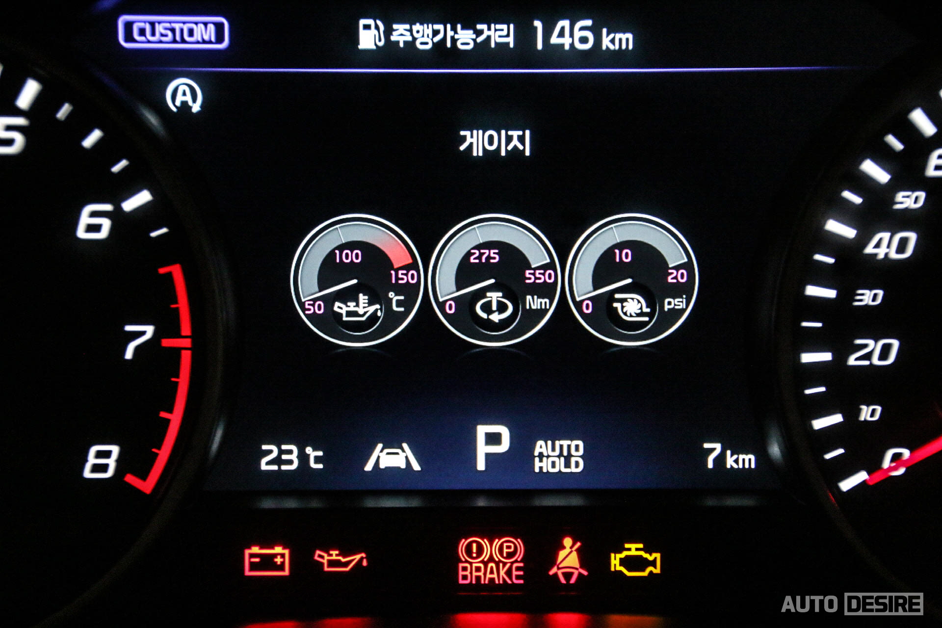 계기판이 제네시스 G70처럼 풀 디지털 클러스터가 적용되지 않는 것은 좀 섭섭하게 느껴지기도 하지만 스팅어 계기판의 스타일 역시 나쁘지 않으며 차량 성격에 맞게 오일 온도, 토크, 터보 부스트 게이지도 제공을 하며 중앙 7인치 TFT LCD 창의 그래픽도 인포 시스템과 함께 맞춰서 변경되었다. 방향지시등을 작동하면 이제 후측방 모니터로 사이드 미러로 보이지 않는 부분까지 후측면 확인이 가능해졌다. 슈퍼비전 클러스터와 후측방 모니터를 모니터링 패키지를 선택하면 적용된다.