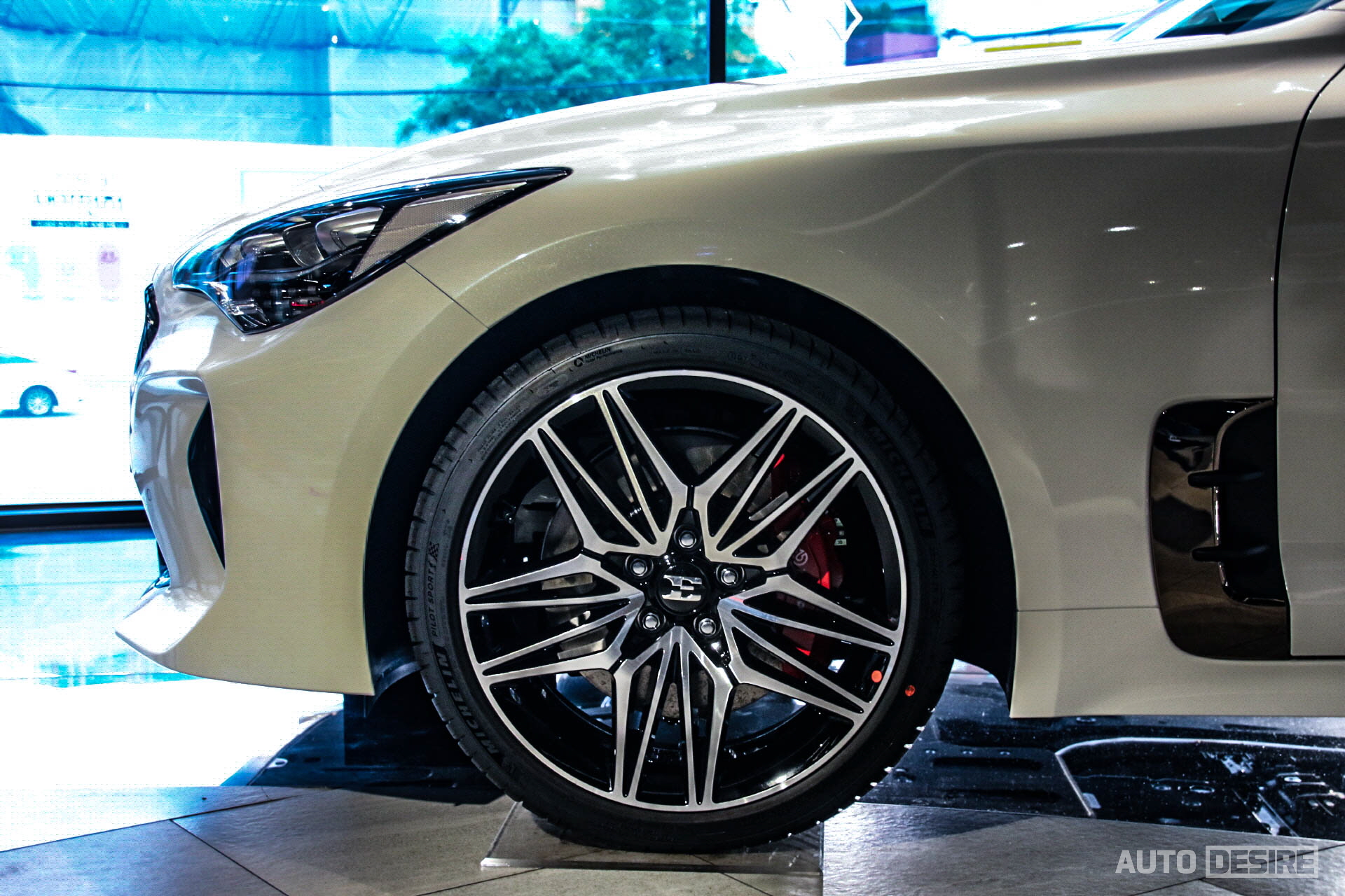측면에서도 차체 내에서 변화는 없지만, 대신 휠의 디자인을 변경했다. 18인치 휠과 19인치 휠 모두 디자인이 새롭게 달라졌고, 3.3 가솔린 터보 GT에는 듀얼 스포크 타입에 스포크가 한층 더 날카로워진 형상, 별 모양의 5-트윈 스포크 휠이 적용되었다. 개인적으로는 기존의 19인치 휠보다 지루해 보이지 않고 스팅어에 좀 더 잘 어울리는 듯하다. 전시차의 휠 안쪽으로 레드 캘리퍼 브렘보 브레이크를 볼 수 있는데, 전자제어 서스펜션과 함께 '퍼포먼스' 패키지를 선택하면 2.5 터보 모델에서도 적용할 수 있다.