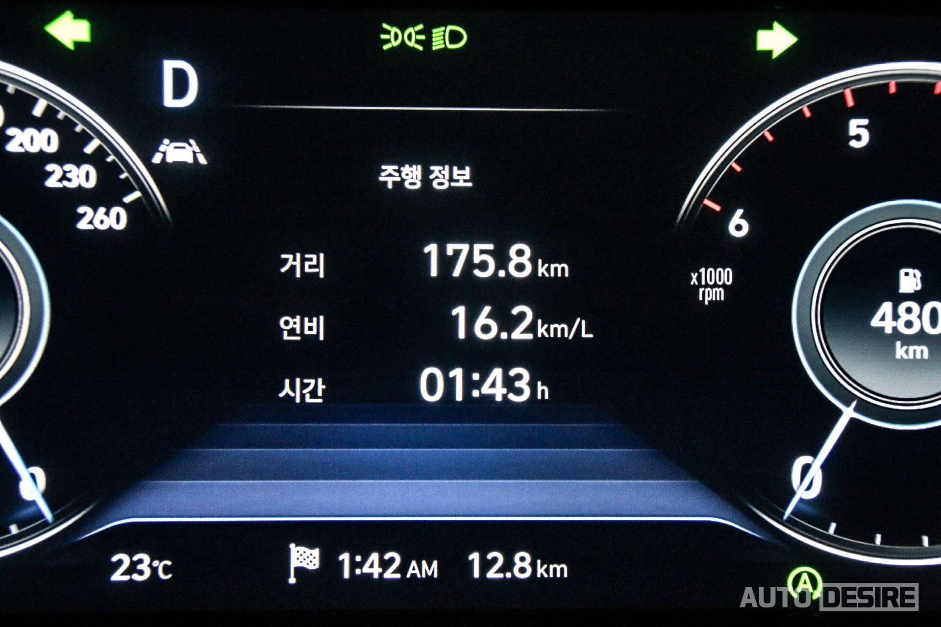 8단 자동 변속기 역시 필자가 주행 중에는 크게 거슬림 없이 부드럽고 준수하게 차를 끌어주는 느낌, 여기에 H트랙까지 적용되었음에도 2.2 디젤 엔진과 변속기의 조합이 보여주는 연비가 대형 SUV 맞나 싶을 정도로 기대 이상인 점이 만족스러웠다. 2020 팰리세이드 캘리그래피 2.2 디젤이 서울-전주 구간 고속도로에서 기록한 연비는 16.2km/L. 공인 고속도로 연비가 12.6km/L이니 실연비에서 3.6km/L 더 좋은 결과가 나타났다. (물론 운전습관과 도로 환경, 기온에 따른 차이가 발생할 수 있다.)