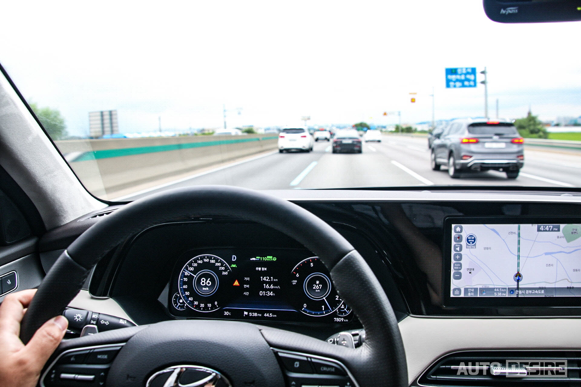 휠 사이즈나 하체의 세팅, 타이어(미쉐린 프라이머시 투어 AS) 등도 기존과 동일하기 때문에 승차감에서는 큰 차이를 느끼기 어려웠고, 전에 시승했던 것과 마찬가지로 높은 요철이나 방지턱을 넘은 다음에도 출렁거림이 심하지 않고, 차량의 특성상, 그리고 무겁고 높은 차체 때문에 코너에서 롤은 어느 정도 생기지만 불편하지 않은 승차감을 유지하는 내에서 안정감을 지키기 위해 탄탄함을 유지한 느낌을 준다. 더불어 생각보다 코너에서 조금 빨리 돌아봐도 차의 밸런스가 나쁘지 않은 건지, H트랙이 제 역할을 하는 덕분인지 차 자체의 안정감은 대형 SUV 치고 나쁘지 않은 모습이다.