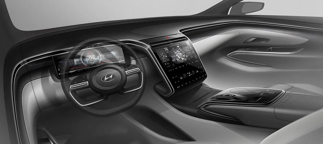 렌더링 이미지로 보여주는 신형 투싼의 인테리어도 심리스 타입으로 혁신적이고 개방감이 높아진 모습이다. 운전석 계기판은 클러스터 하우징을 없앤 개방형 클러스터를 적용해 운전석 개방감을 높이고 디지털 클러스터의 그래픽도 아반떼, 싼타페 혹은 쏘나타, 그랜저 등과는 다른 그래픽을 사용하는 것으로 보인다. 센터 디스플레이는 플로팅 타입에서 다시 센터패시아와 통합된 형태로 변경, 사이즈가 상당히 크게 증대된 것으로 보이며 하단의 공조 컨트롤러도 터치 디스플레이 혹은 터치 패널을 적용하는 것으로 보인다. 센터패시아 측면으로부터 대시보드, 도어트림을 지나 후석 트림까지 이어지는 실버 가니시를 적용해 전체적으로 실내 공간이 넓어 보이는 효과도 주었다. 변속기도 전자식 변속 버튼을 적용한다.
