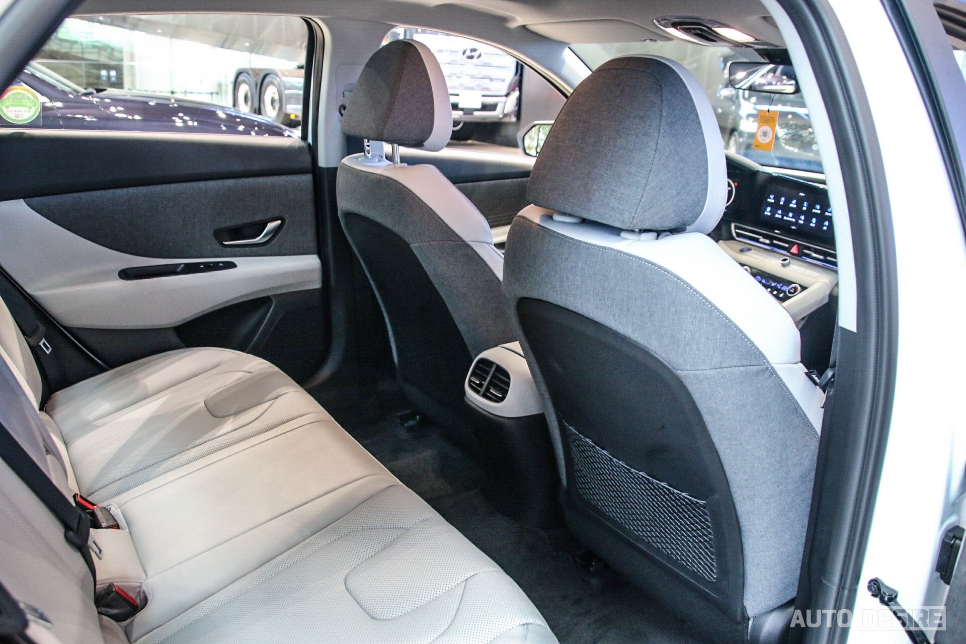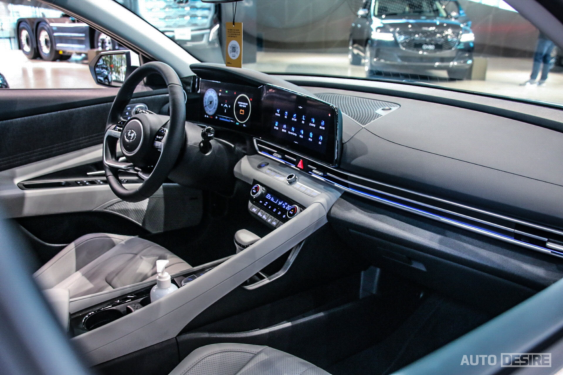 현대 모터스튜디오 고양에 있는 아반떼 하이브리드의 인테리어는 모던 그레이 인테리어가 적용되어 있는데 이 역시 기존 가솔린 모델과 완전히 동일한 구성. 도어 트림 부분과 시트 뒤편에 패브릭 재질을 사용한 것 역시 동일하다. 그 외 10.25인치 디지털 클러스터와 10.25인치 내비게이션이 이어진 파노라마 디스플레이, 실내 앰비언트 무드 램프 등 전반적인 사양 구성 역시 동일한 모습.