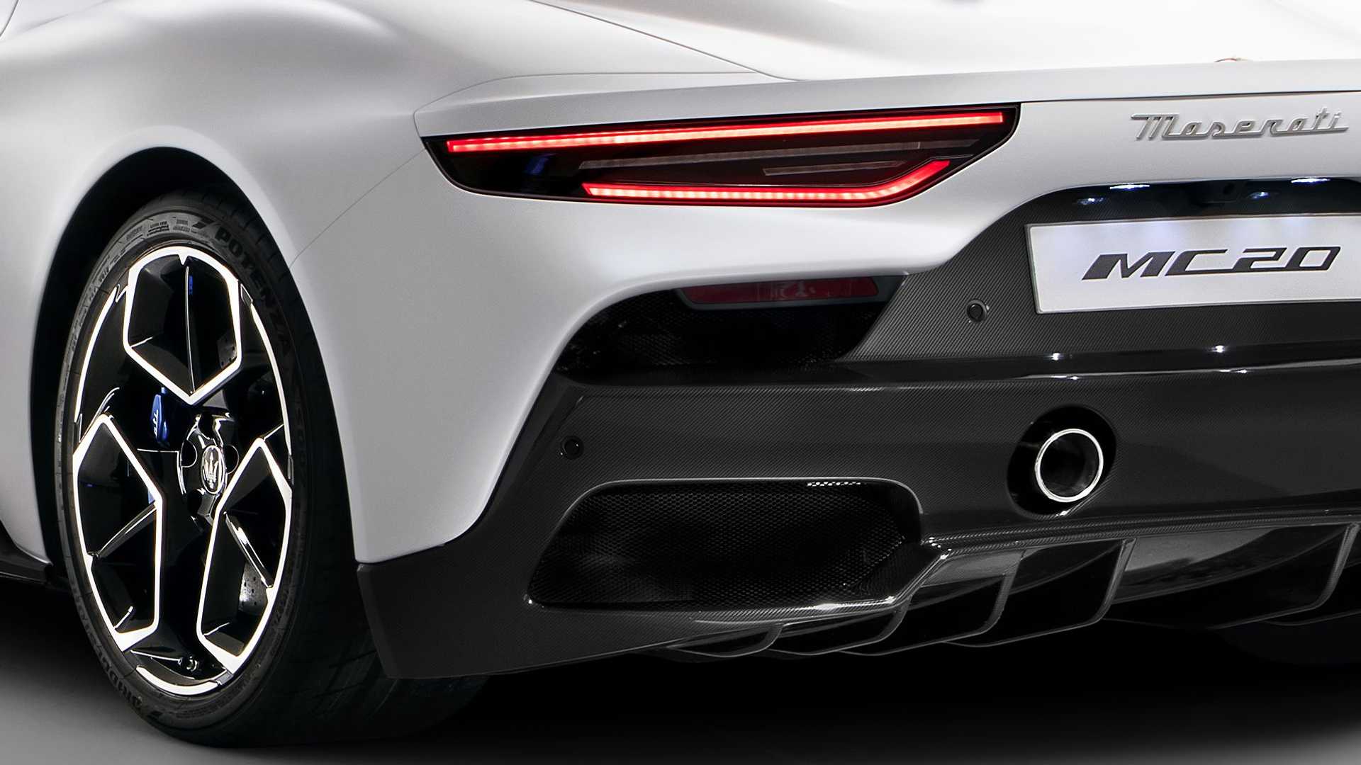 후면에서는 수평형으로 길게 뻗은 LED 테일램프 사이로 마세라티 레터링 로고를 넣고, 하단에는 중앙 부분으로 모은 듀얼 머플러 팁과 리어 디퓨저를 적용, 엔진룸은 투명 커버로 덮었다. 외장 색상은 Bianco Audace(화이트), Giallo Genio(옐로우), Rosso Vincente(레드), Blu Infinito(블루), Nero Enigma(블랙), Grigio Mistero(그레이)로 총 6가지로 제공된다.