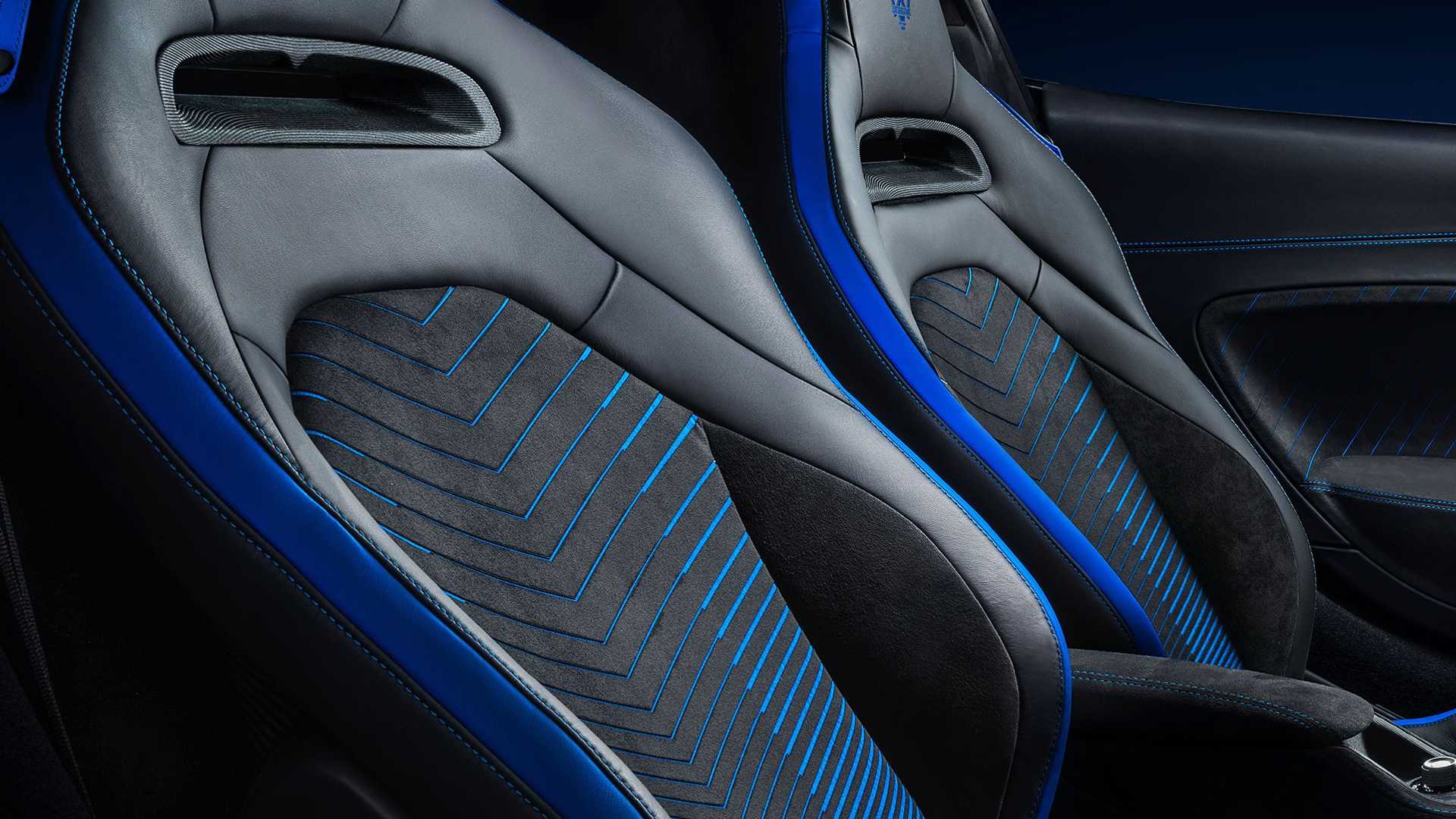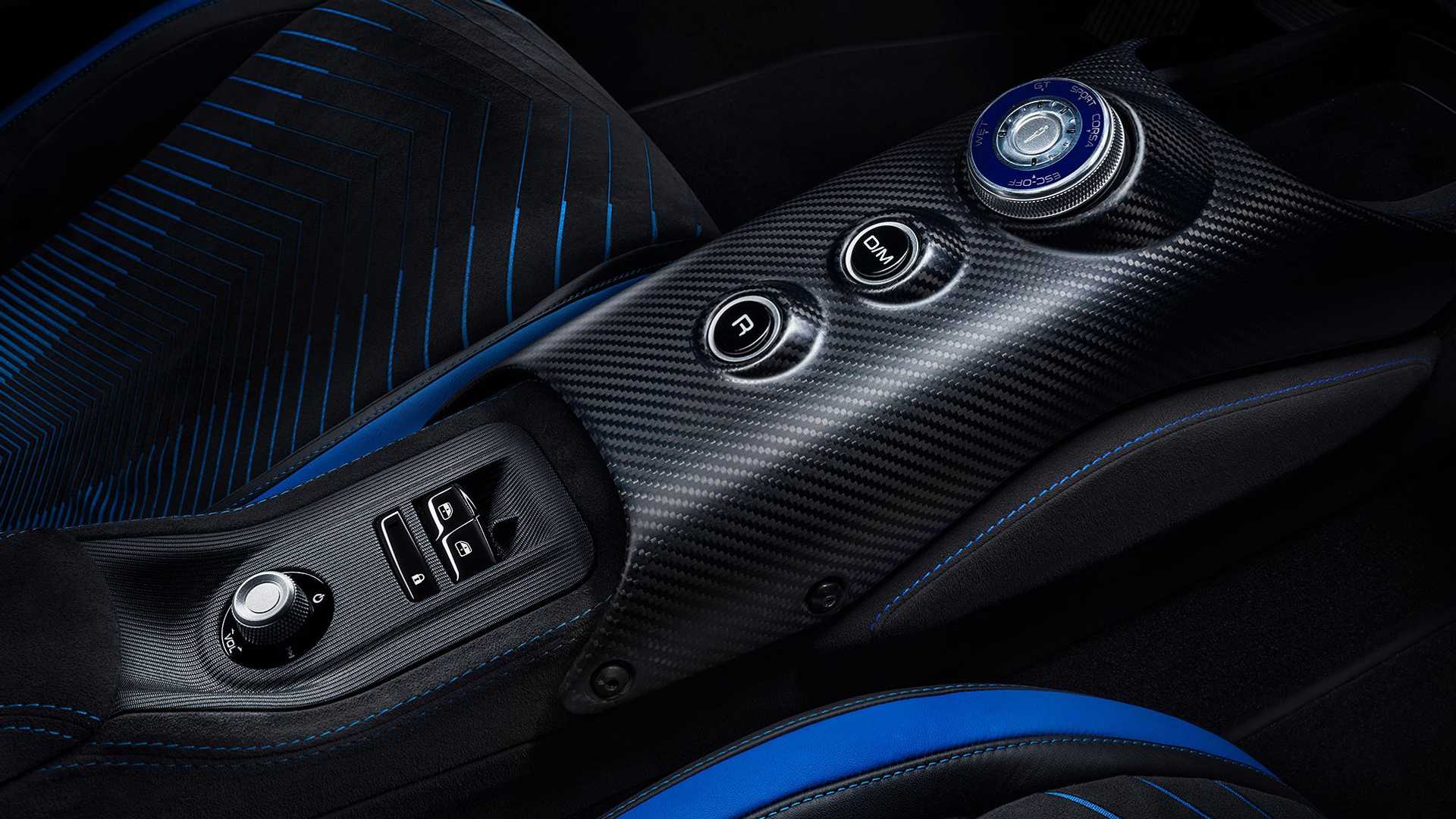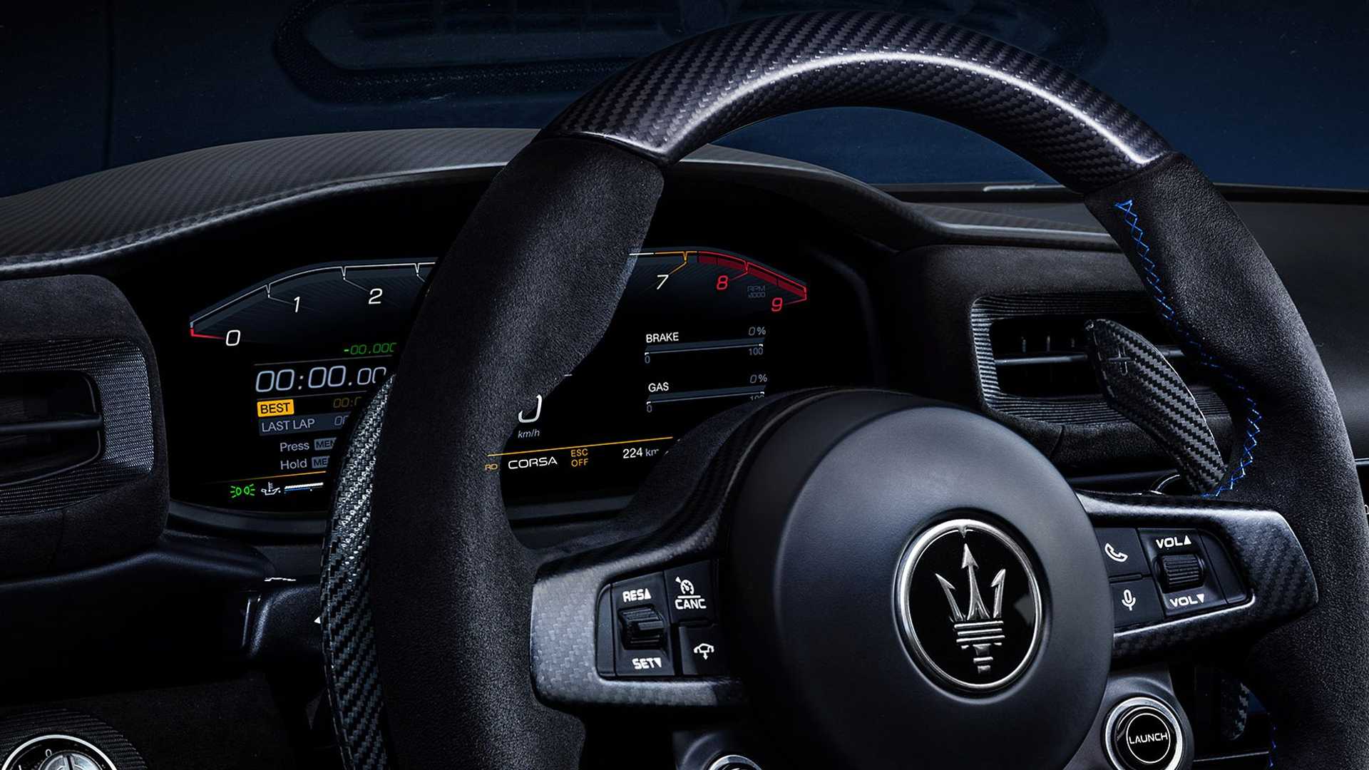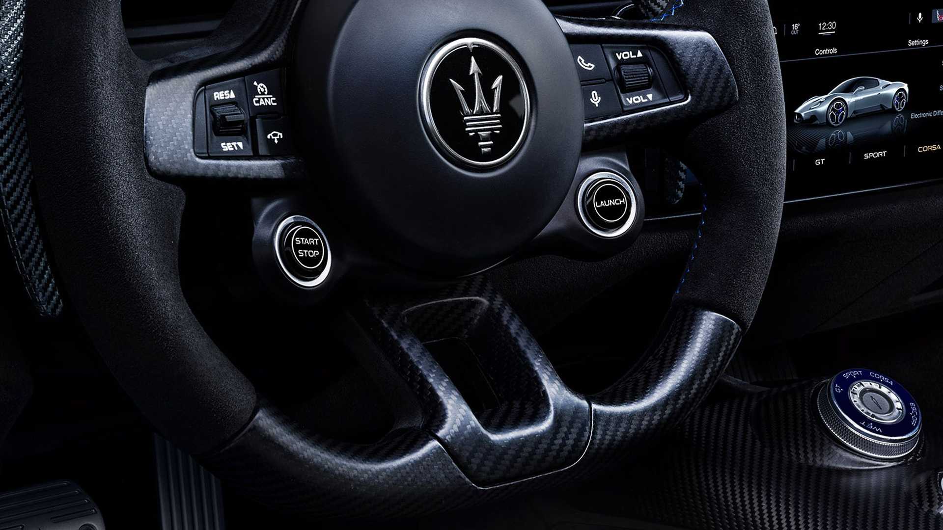 실내에서는 스티어링 휠과 시프트 패들, 센터 콘솔을 비롯한 곳곳에 카본 섬유를, 시트와 대시보드 패널, 도어 패널에는 알칸타라로 마감하고 파란색 포인트 컬러, 삼지창 자수를 넣어 포인트를 주었다. 엔진 시동 버튼과 런치 컨트롤 버튼도 스티어링 휠 스포크 하단으로 넣고, 스포크에는 크루즈 컨트롤과 멀티미디어 컨트롤 버튼으로 편의성을 챙겨둔 모습.
