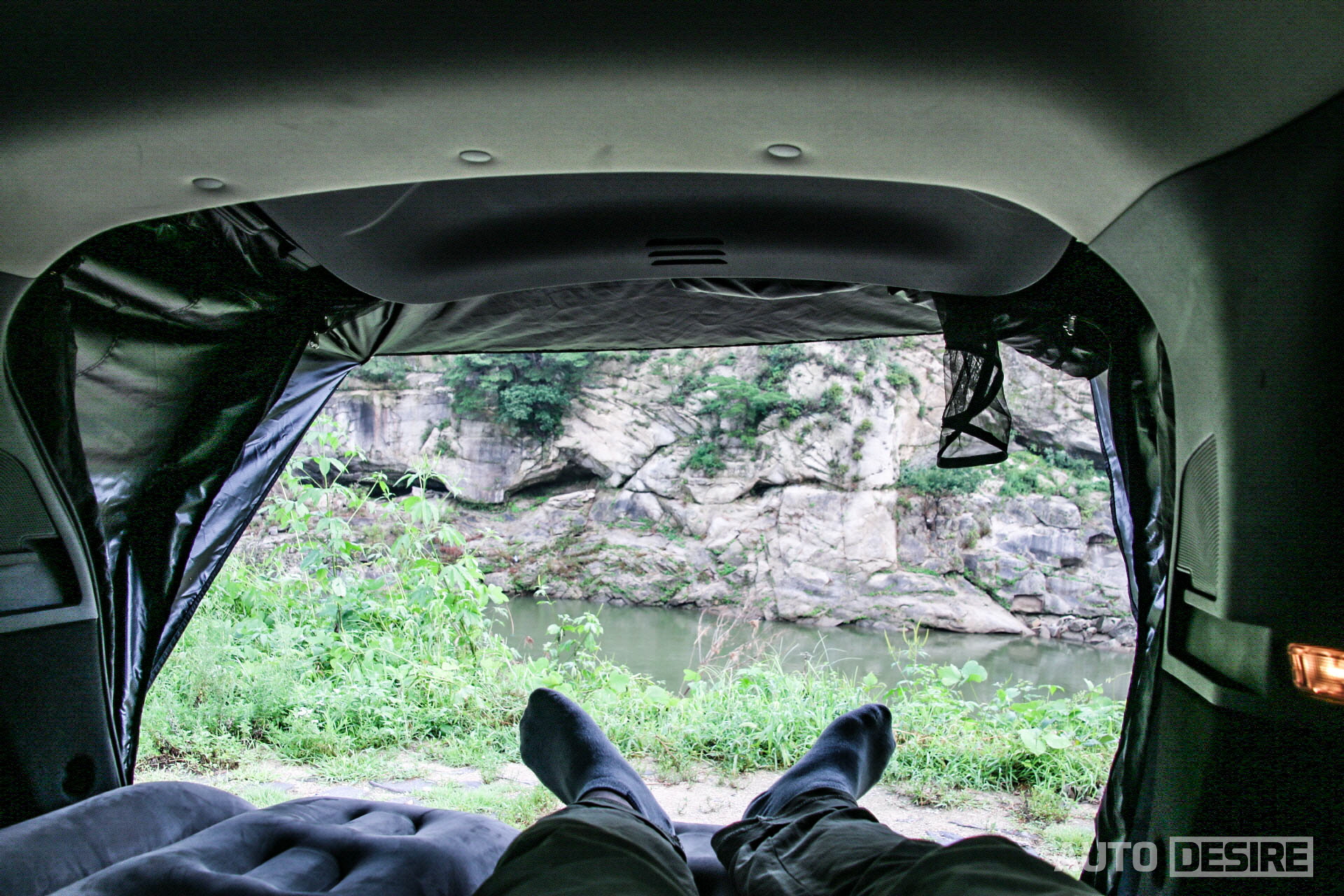 2열 시트까지 폴딩 하면 성인 2명은 충분히 누울 수 있는 공간에, 푹신푹신한 에어매트까지 설치하고 나니 그냥 맨바닥에 눕는 것보다는 훨씬 편하게 누워서 쉬고 잘 수 있었는데 정말로 여기에 캠핑용 의자와 테이블, 타프 등 몇 가지 용품들만 더 추가해도 제대로 차박'캠핑'을 즐길 수 있을 것 같다. (이번엔 그럴 수가 없었지만..ㅠㅠ)