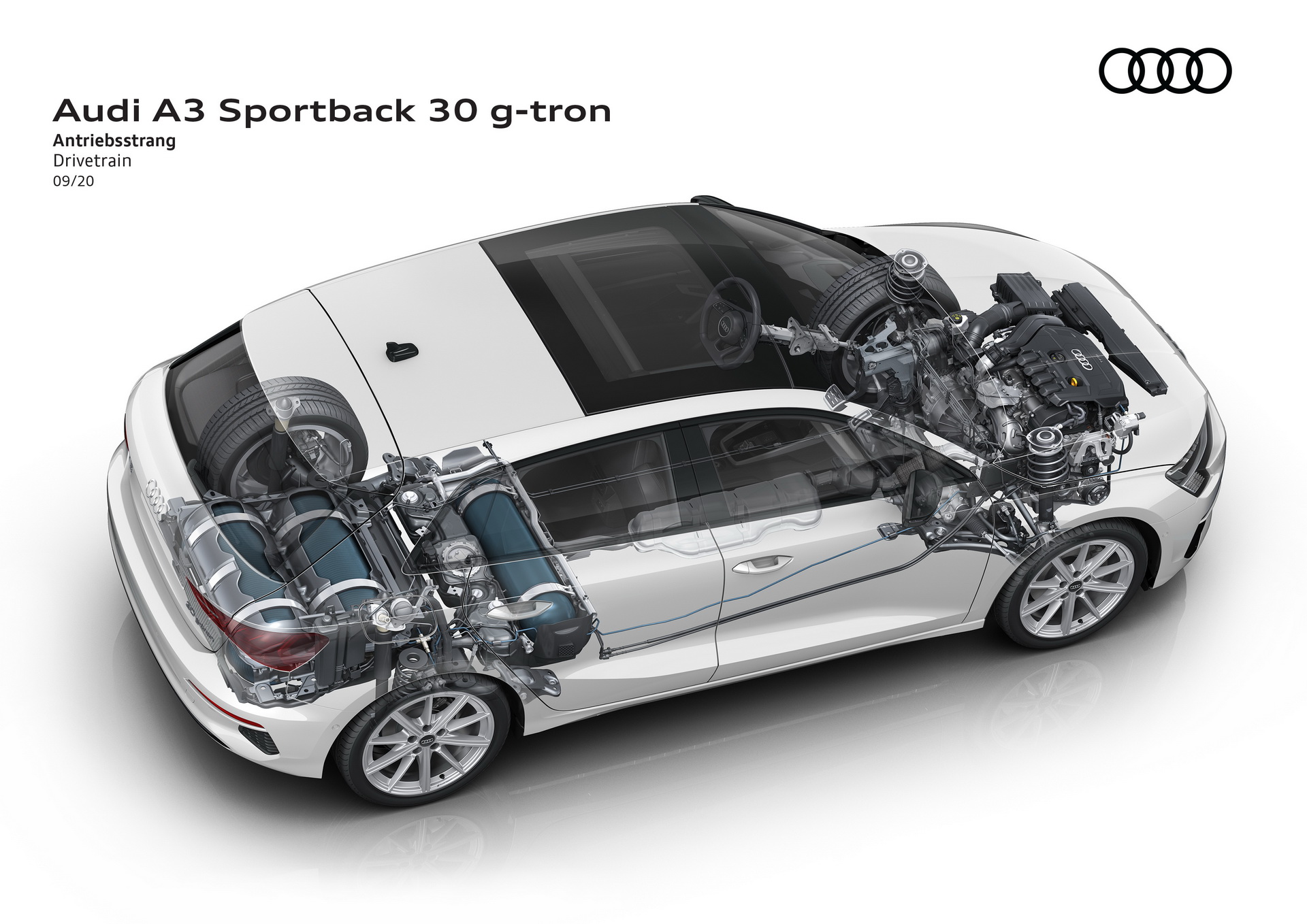 외관상으로는 일반형 A3와 크게 다를 바 없어 보이지만, 압축 천연가스(CNG)와 바이오메탄도 연료로 사용할 수 있는 1.5리터 TFSI 엔진을 장착, 최고출력 131마력, 최대토크 20.4kg.m을 발휘하고 7단 S 트로닉 변속기가 적용된다. 콰트로 4륜 구동 시스템은 별도로 추가되지 않고, 정지 상태에서 100km/h까지 가속하는데 9.7초, 최고 속도 211km/h로 특별히 모자람 없이 엔진 성능도 준수한 편. 연비는 유럽 측정(NEDC) 기준으로 100km 주행하는데 3.6kg 소모로 환산하면 27.7km/kg이며 CO2 배출량은 99g/km로 가솔린 TFSI 엔진에 비해 확연히 적은 모습이다.