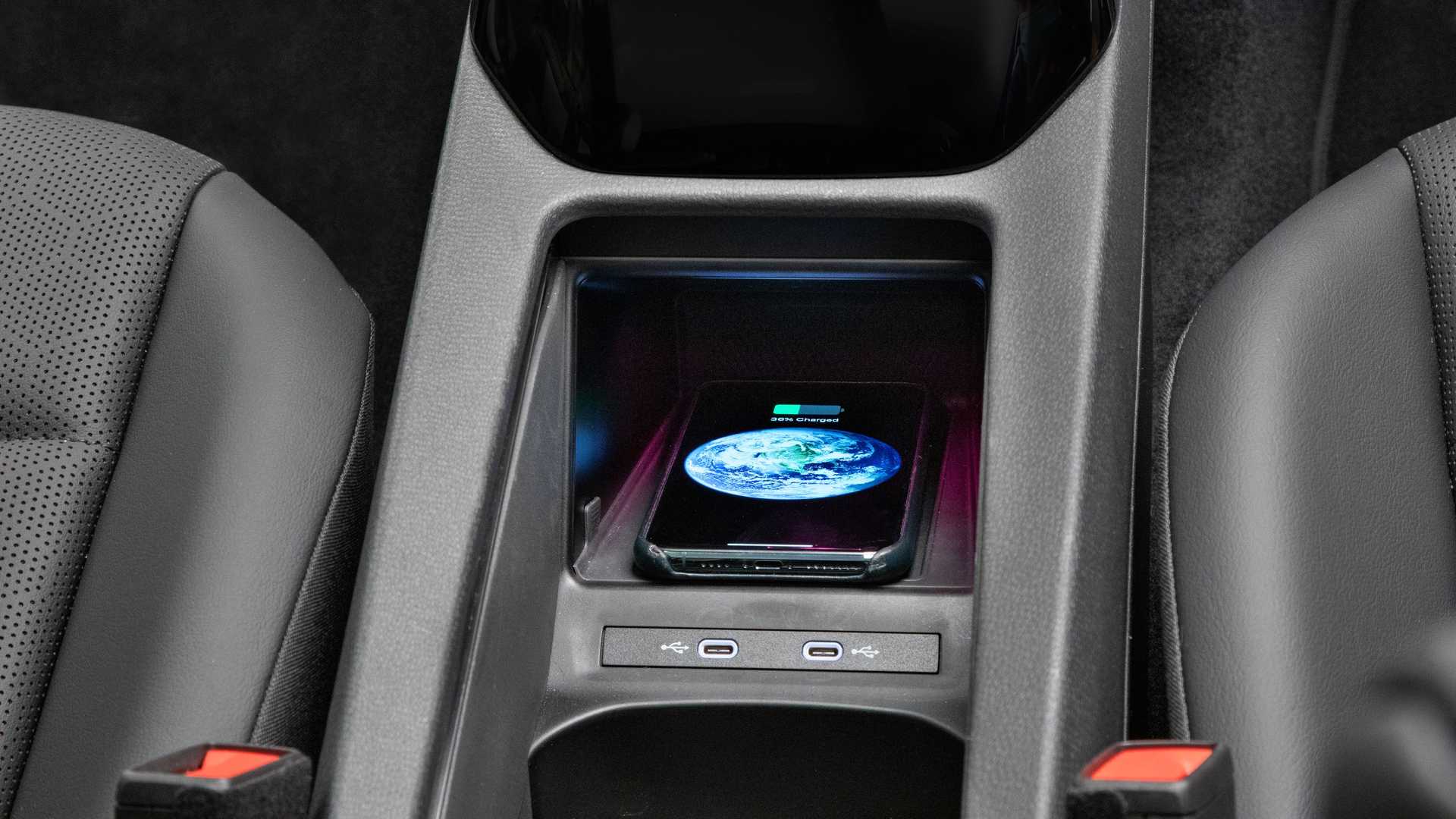 버튼들을 모두 터치스크린으로 통합시키고, 변속 셀렉터도 스티어링휠 칼럼으로 옮기면서 간결해진 센터 콘솔 부분에는 스마트폰 무선 충전 패드와 C타입 USB 포트, 컵홀더와 여유로운 수납공간 정도만 남게 되었다.