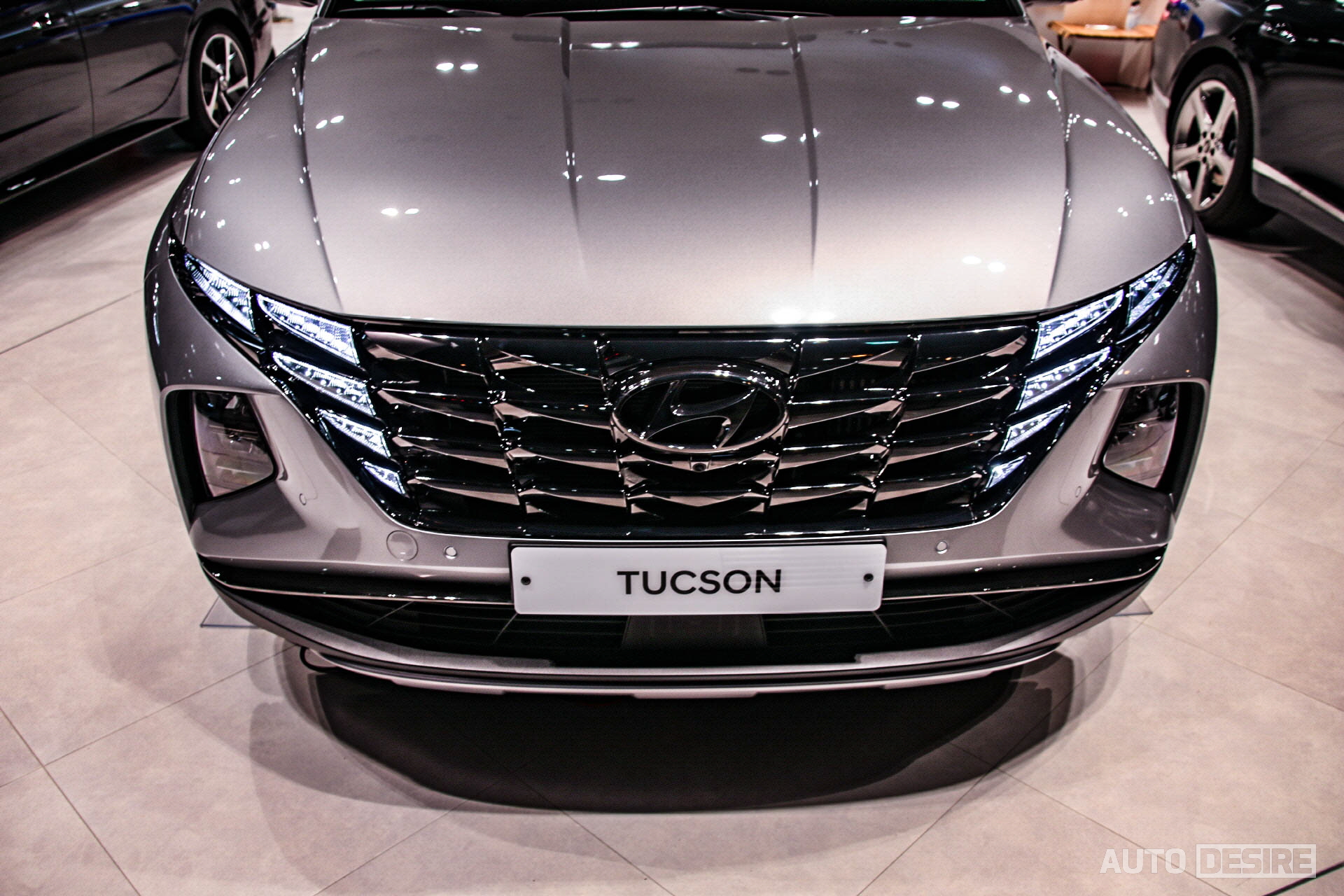 미사 오토스퀘어에 전시 중이었던 4세대 투싼은 1.6 가솔린 터보 인스퍼레이션 트림 모델, 외장 색상은 쉬머링 실버. 다만 2.0 디젤, 1.6 터보 하이브리드 모델(하이브리드는 17인치 공력 휠 정도의 차이) 간에 외관의 모습은 차이가 없기 때문에 내외관 모습을 참고하는데 큰 문제는 없을 것이다.
