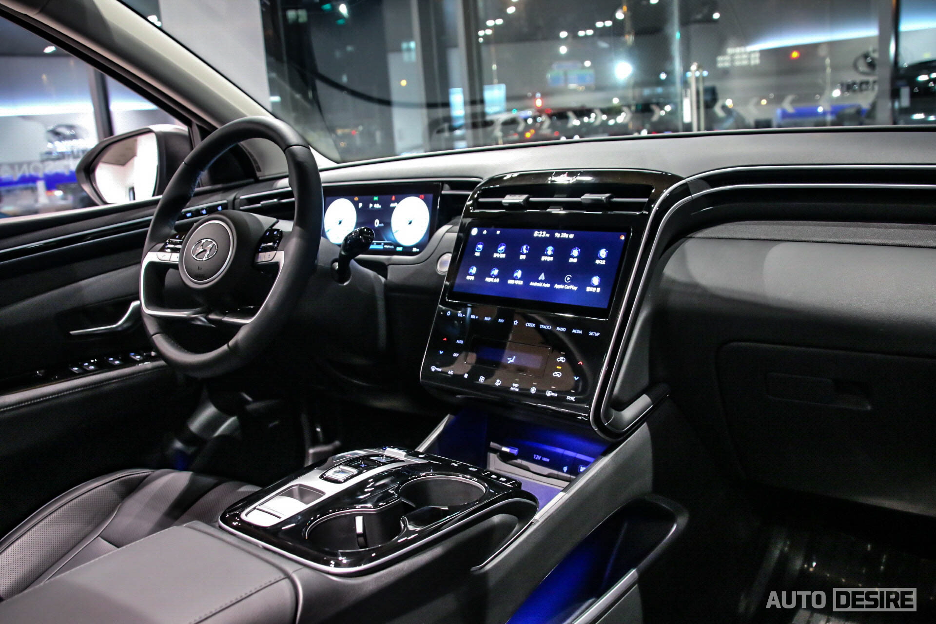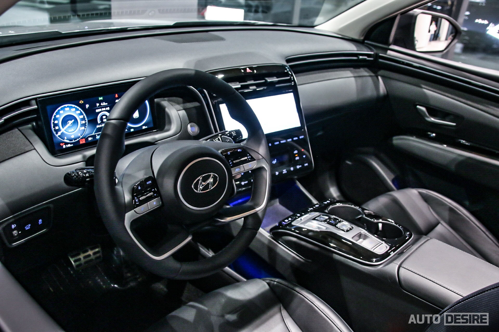남들에게 더 많이 보여주게 될 외관은 강렬한 느낌이라면, 실내는 그와 대비되게 깔끔하고 단정하며, 안정적인 느낌을 전해준다. 센터콘솔-센터패시아에서 크래시패드를 지나 측면 도어까지 이어지면서 승객석을 감싸는 구조는 더 뉴 싼타페와 흡사하면서도 터치 패널의 센터패시아와 클러스터 하우징을 없앤 디지털 클러스터, 새로운 배열의 센터 콘솔은 투싼 만의 새로운 느낌을 주면서 마감재의 소재, 색상, 세부적인 디테일에서는 올 뉴 아반떼가 떠오르기도 한다.