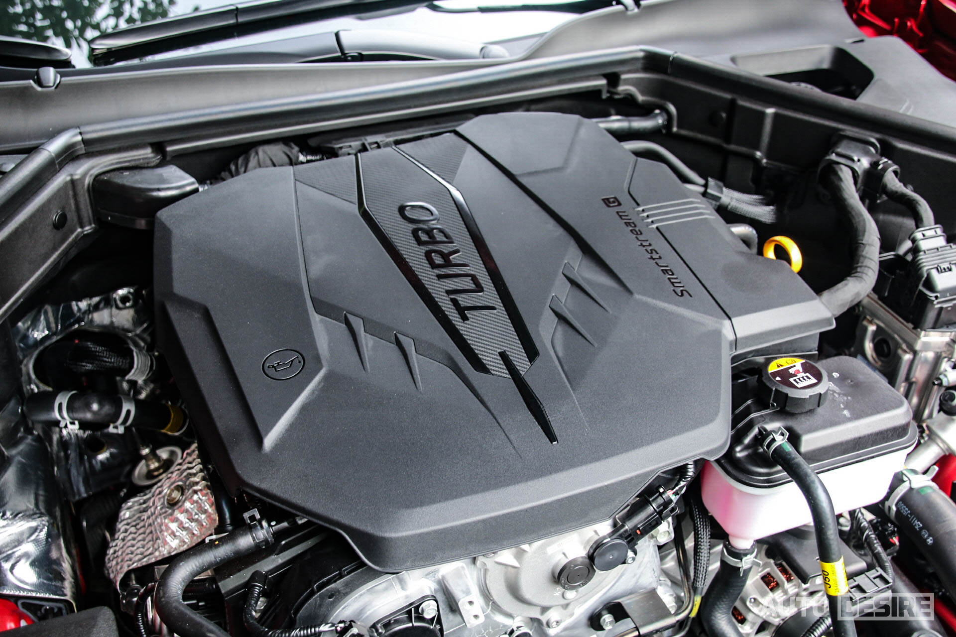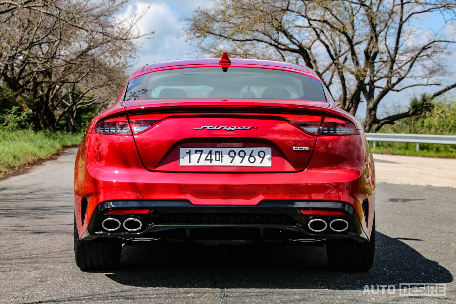 필자가 시승한 모델은 빨간 바디 컬러가 매혹적인 2.5 터보 AWD 모델로 전면부에서는 새로운 디자인의 주간주행등이 적용된 LED 헤드램프가 기존 스팅어와 다른 부분. 후드에 있던 에어벤트 가니시가 2.5 터보에서는 삭제되었지만 전체적인 디자인상 크게 신경 쓰일 정도는 아니다. 그나마 2.5 터보에서도 퍼포먼스 플러스 패키지를 추가하는 경우나 3.3 GT에서는 프로젝션 LED 헤드램프와 후드 가니시까지 기존 스팅어와 동일하며, 범퍼의 에어벤트 그릴이 무광 재질에서 유광으로 바뀐 정도의 차이가 있다. 날카로운 형상으로 디자인이 변경된 19인치 휠도 기존 휠보다 스팅어와 더 잘 어울린다.