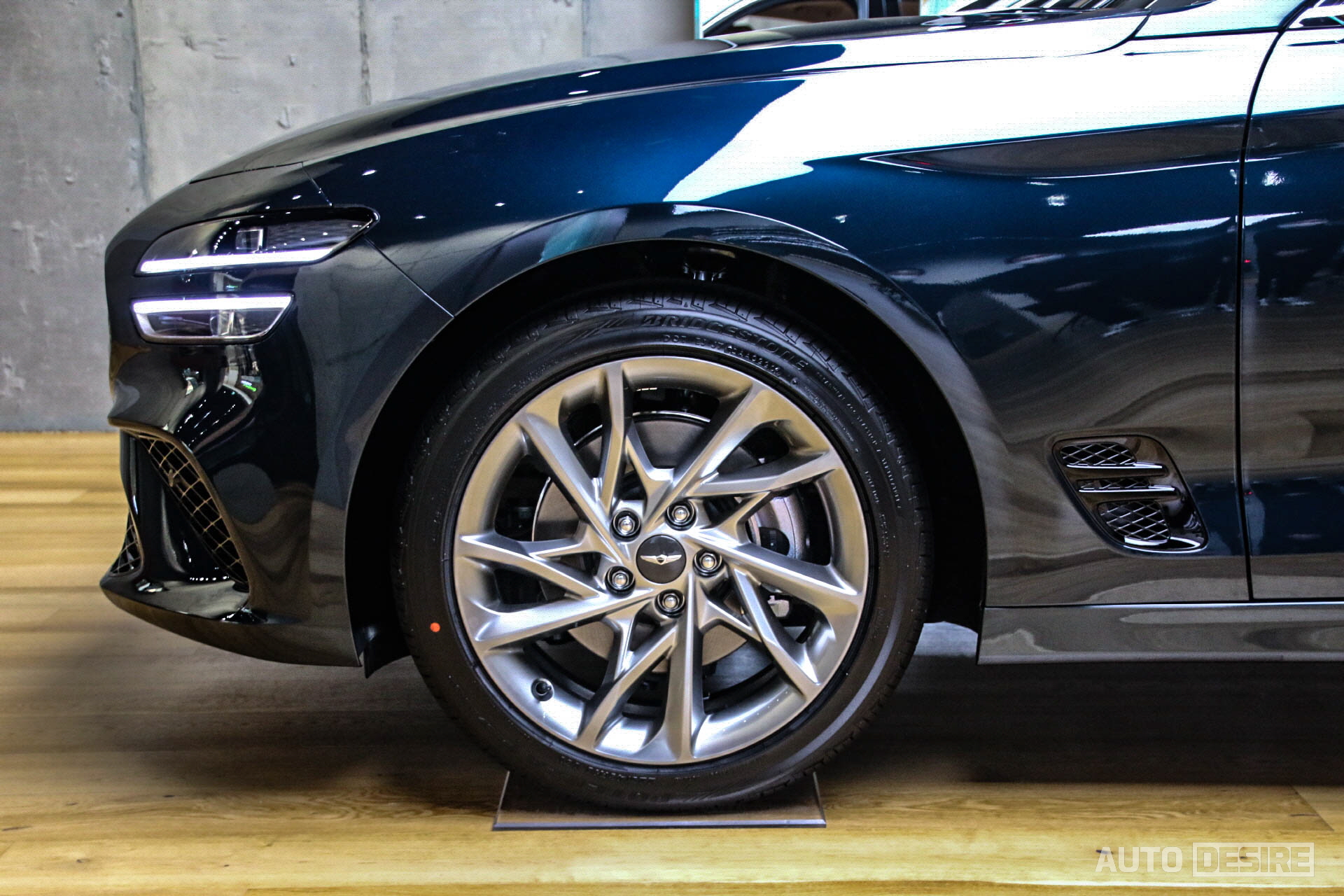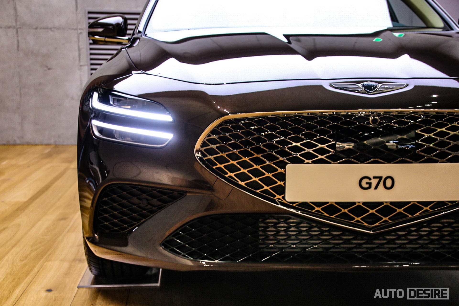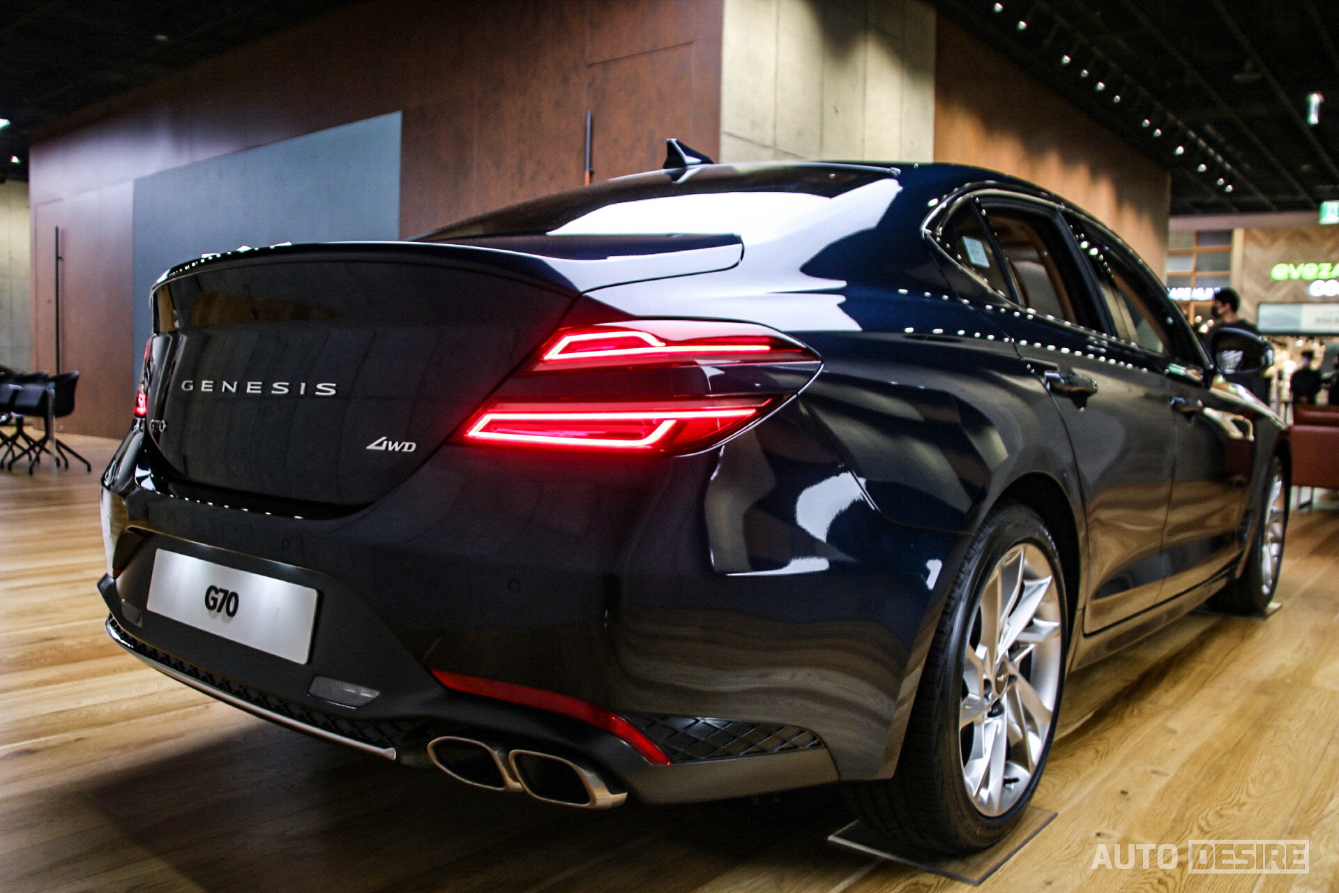 마지막 전시 차량은 세도나 브라운 컬러의 2.2 디젤 기본 모델로 사실 외관에서는 스포츠 패키지와 다크 크롬 그릴과 도어 프레임 몰딩, 듀얼 머플러, 휠 등을 제외하고 전체적인 큰 디자인은 동일하기에 색상에 따라 더 뉴 G70의 외관 분위기가 또 어떻게 달라지는지 살펴보기 좋을듯한데, 개인적으로는 이번 G70에는 블레이징 레드나 래피스 그레이처럼 쨍하고 선명한 색상, 혹은 멜버른 그레이같이 무게감 있으면서 고성능 차량의 분위기에 어울리는 색상들이 잘 맞는 것 같다.