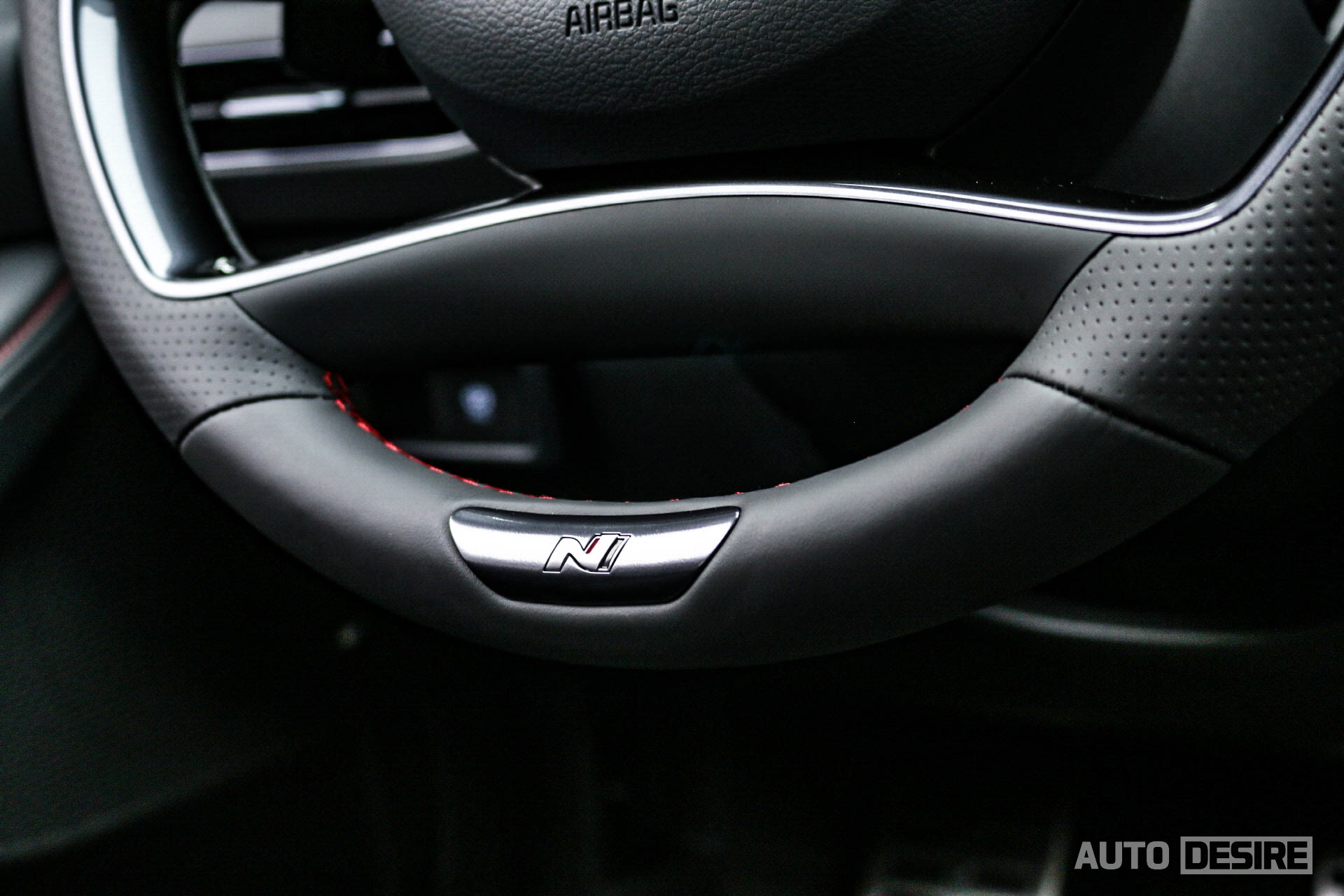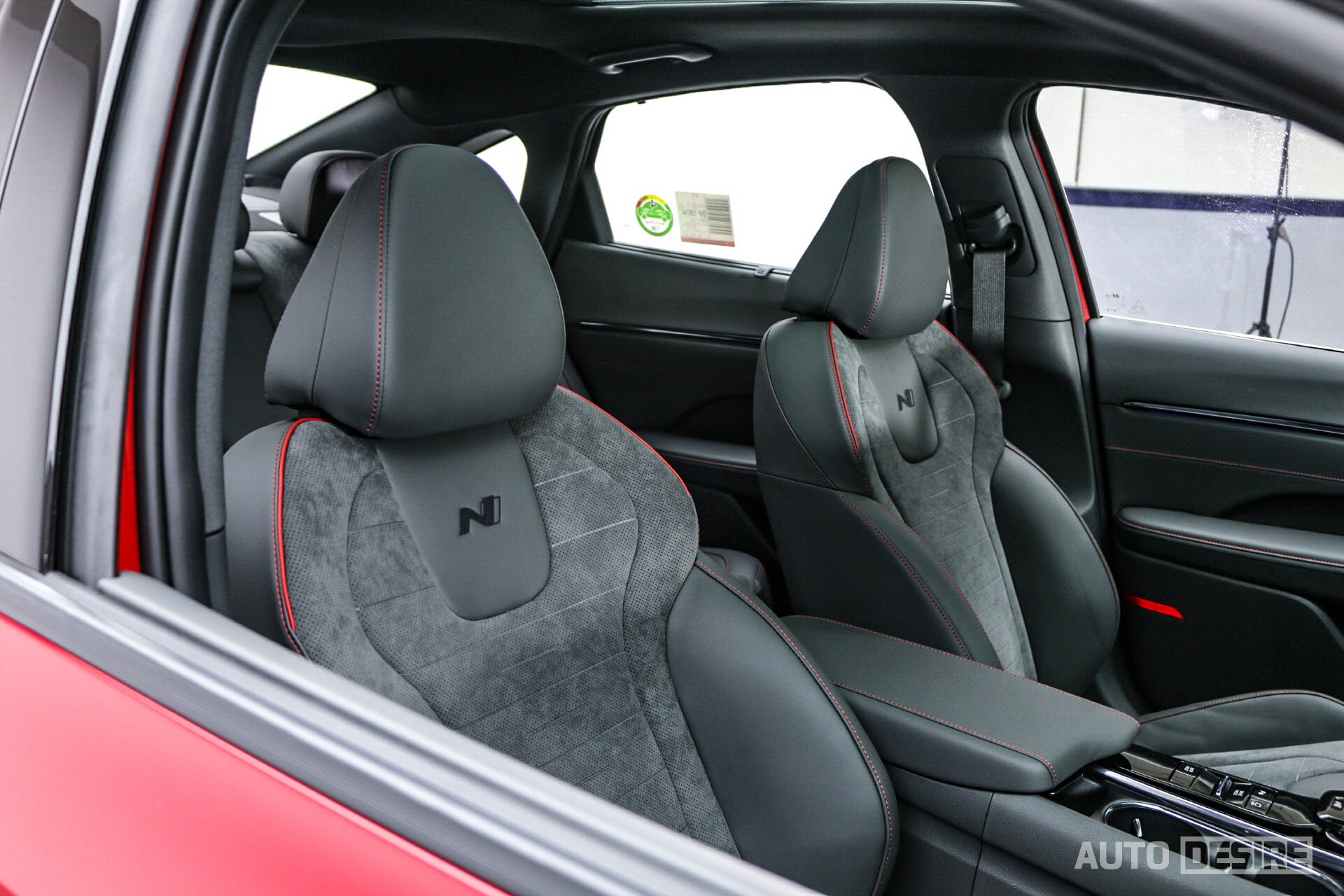 인테리어의 색상도 다크 그레이/레드 투톤으로 강렬한 대비감, 스포티한 분위기를 전해주고 N 로고 자수를 더한 1열 시트는 스포츠 버킷 형태로 사이드 볼스터를 더 크게, 단단하게 만드는 한편 헤드레스트와 사이드볼스터는 나파 가죽으로, 등받이와 쿠션에 사람 몸이 직접 닿는 부분은 스웨이드를 적용해 몸을 더 탄탄하게 지지해 주고 촉감도 더 부드러워 고급스러운 느낌을 준다.