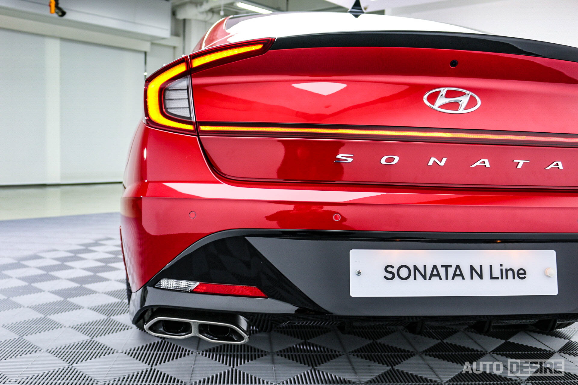 현대자동차의 디자인 철학, '센슈어스 스포티니스'를 기반으로 굉장히 파격적으로 변화를 시도한 8세대 쏘나타의 디자인에 N 라인의 고성능 감성, 공격적이고 스포티한 디자인이 더해져 외관의 전체적인 디자인 완성도는 더 높아진 느낌. 먼저 출시했던 쏘나타 센슈어스와 흡사해 보이기도 하나 더 커진 사이즈의 범퍼 에어벤트/에어커튼 디자인과 N 라인 전용 디자인의 파라메트릭 주얼 패턴 그릴, N line 배지까지 더해지면서 전체적인 디자인의 조화도 좋고, 비로소 날렵한 바디 라인을 가진 8세대 쏘나타의 스타일이 완성되어 보인다.