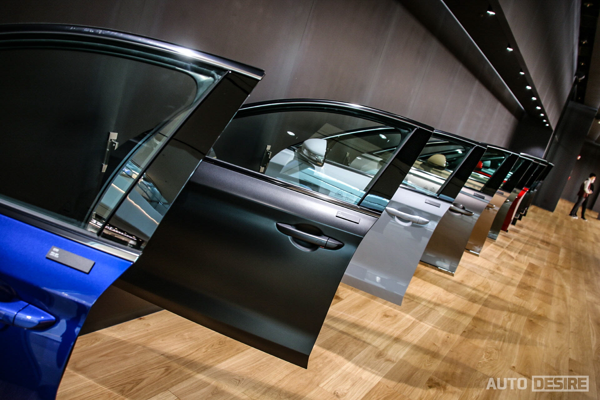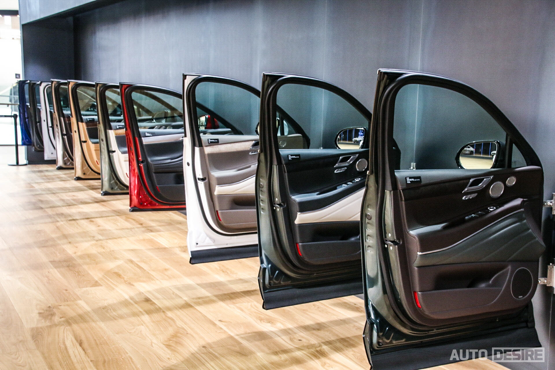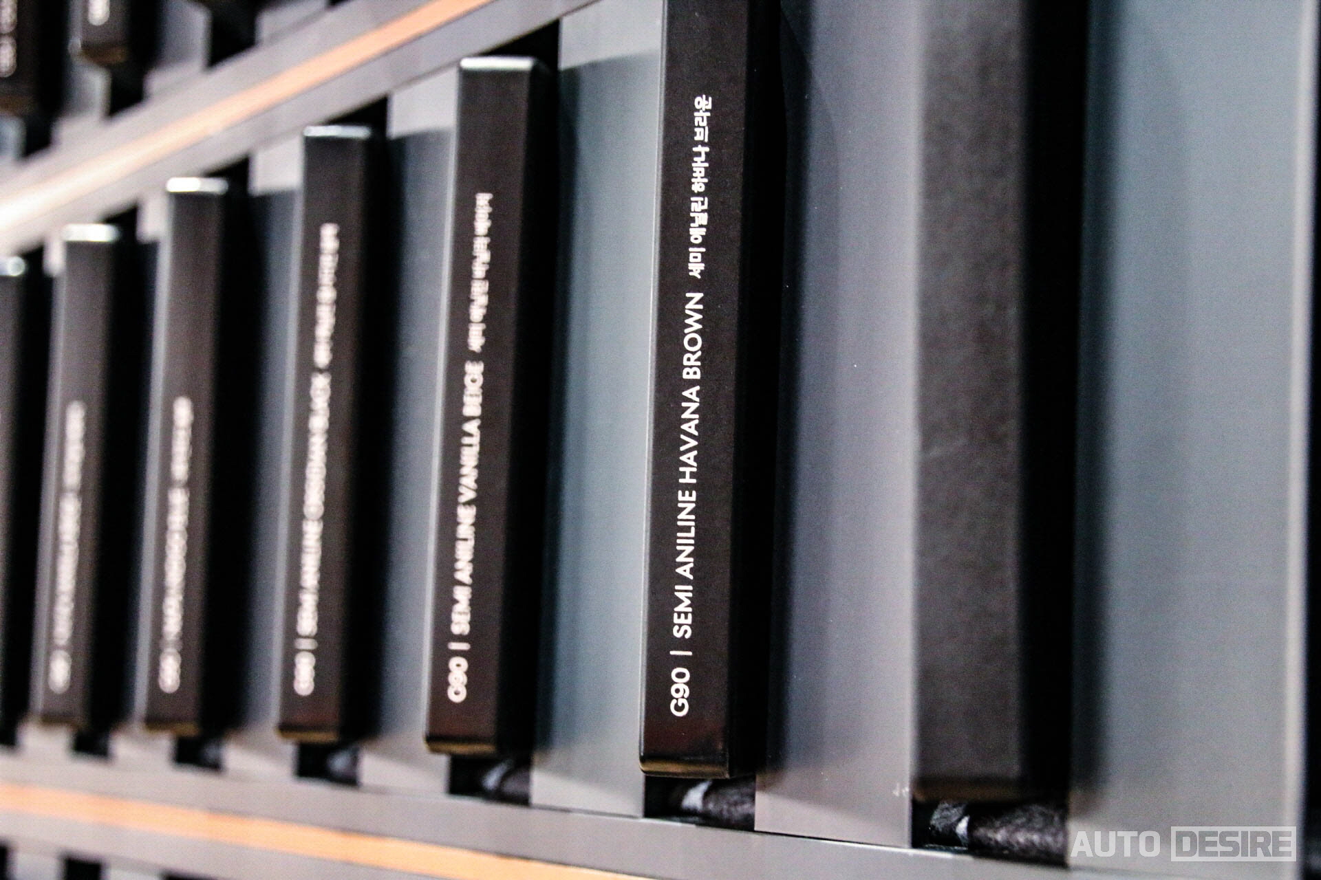 또 다른 제네시스 전시관과 마찬가지로 출입구 쪽 벽면에는 제네시스의 차종별 외장 컬러와 실내 내장재를 살펴볼 수 있는 내/외장 체험존의 도어 샘플들이 마련되어 있어 전시 차량 외 다른 실내외 색상을 살펴볼 수 있고,