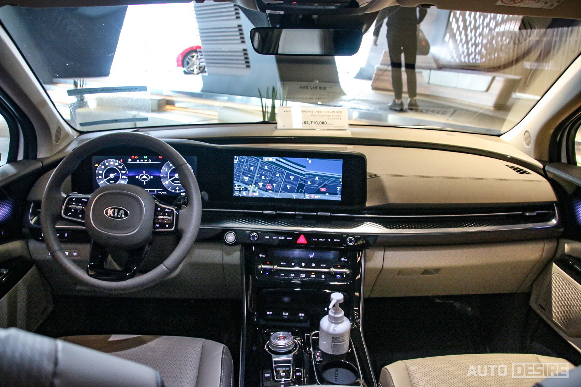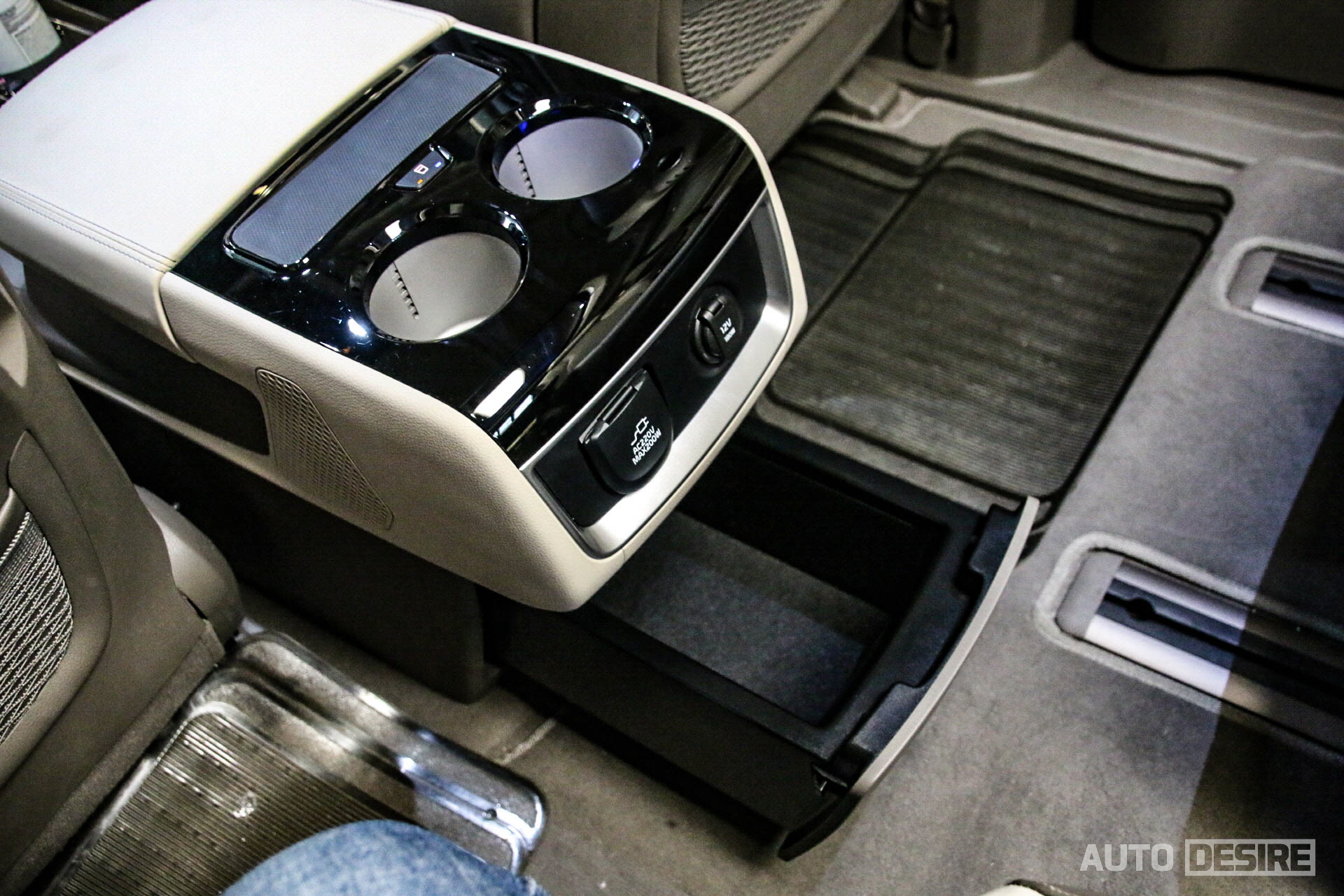 승객 공간이 메인인 차량이기에 1열의 모습은 기본형 카니발과 거의 차이가 없어 보이지만, 에어컨 송풍구 하단의 가니시를 기존 우드에서 입체 패턴의 크롬 가니시로 적용해 더 화려한 분위기를 전하고, 1열 컵홀더에도 냉온장 기능을 더했다.