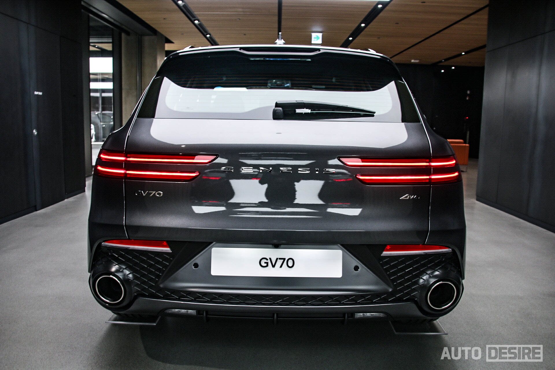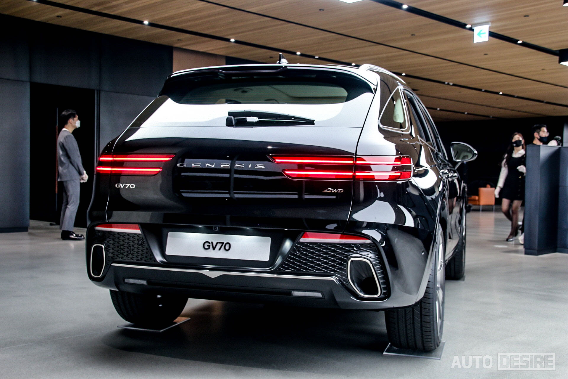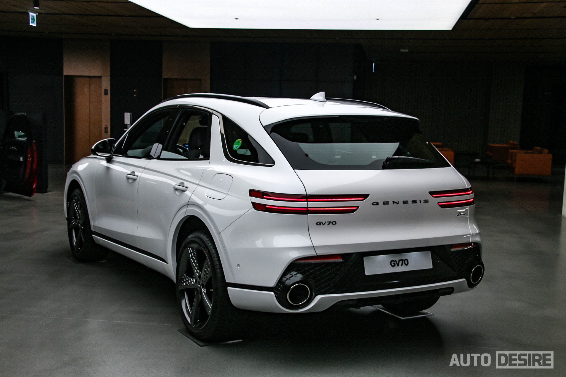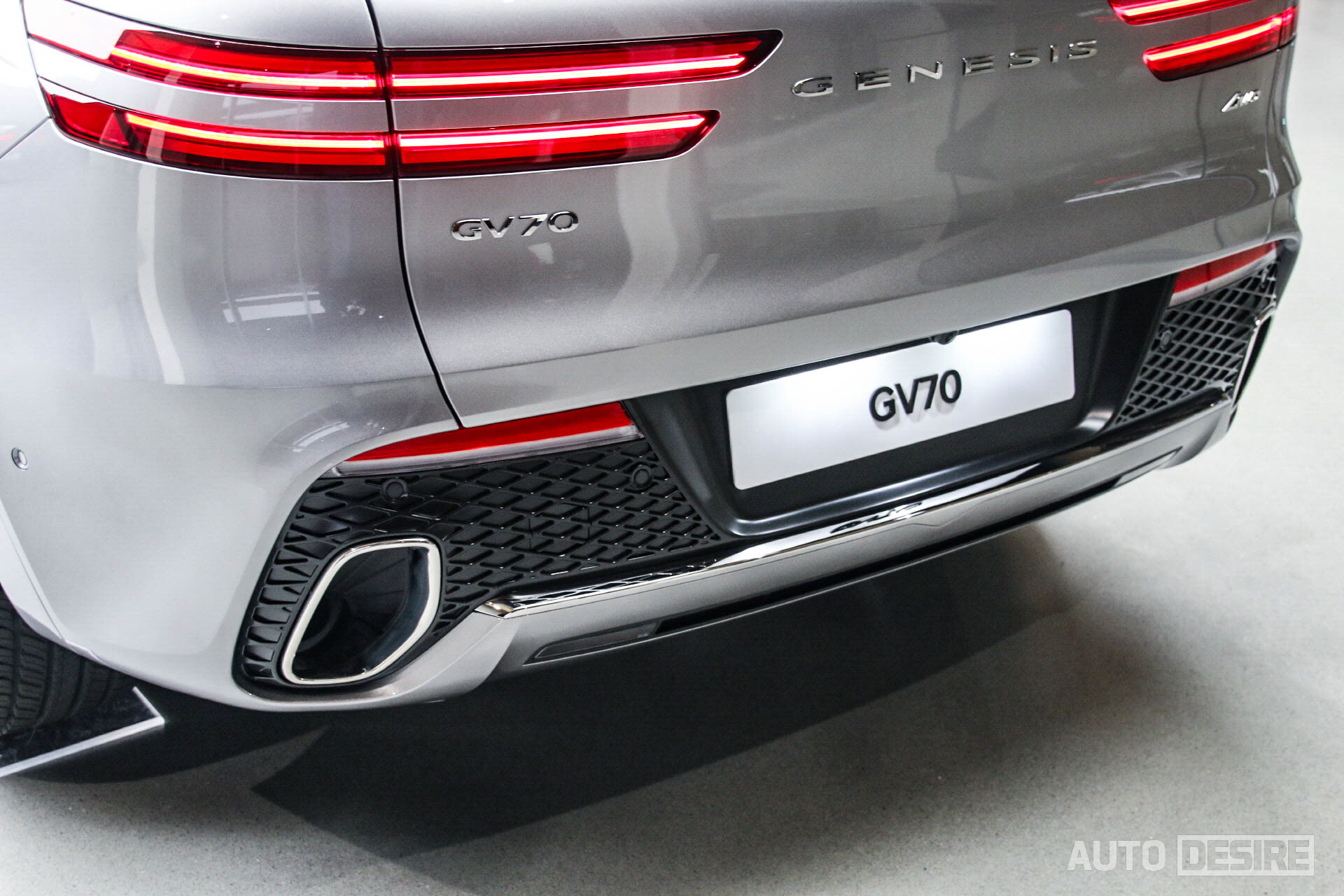 정식 공개보다 좀 이른 시기인 10월 말에 이미 실내외 디자인이 공개되었고, 차량 외관을 공개한 상태로 도로 주행 테스트도 진행한지라 이제 디자인은 꽤 익숙, 친숙한 편이지만 호불호 크게 없이 매력적이고 잘 생긴 디자인이라는 점, 그리고 실물로 볼 때 그 만족감이 더 크다는 점은 변하지 않는다. 또한 제네시스의 디자인 아이덴티티, 두 줄 쿼드램프와 크레스트 그릴, G-매트릭스 패턴, 파라볼릭 라인, 크레스트 그릴 형태의 머플러 팁을 그대로 담고 있어 첫인상 자체는 다른 제네시스 라인업들과 흡사하지만 차의 비례감, 볼륨감, 전체적인 실루엣에서는 GV70만의 역동적인 느낌을 느끼게 한다.