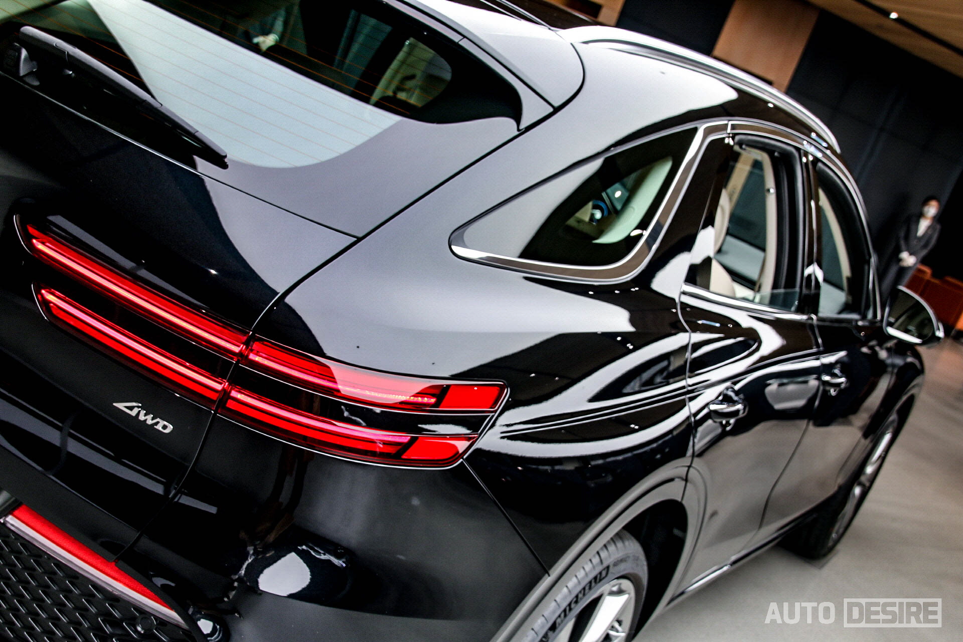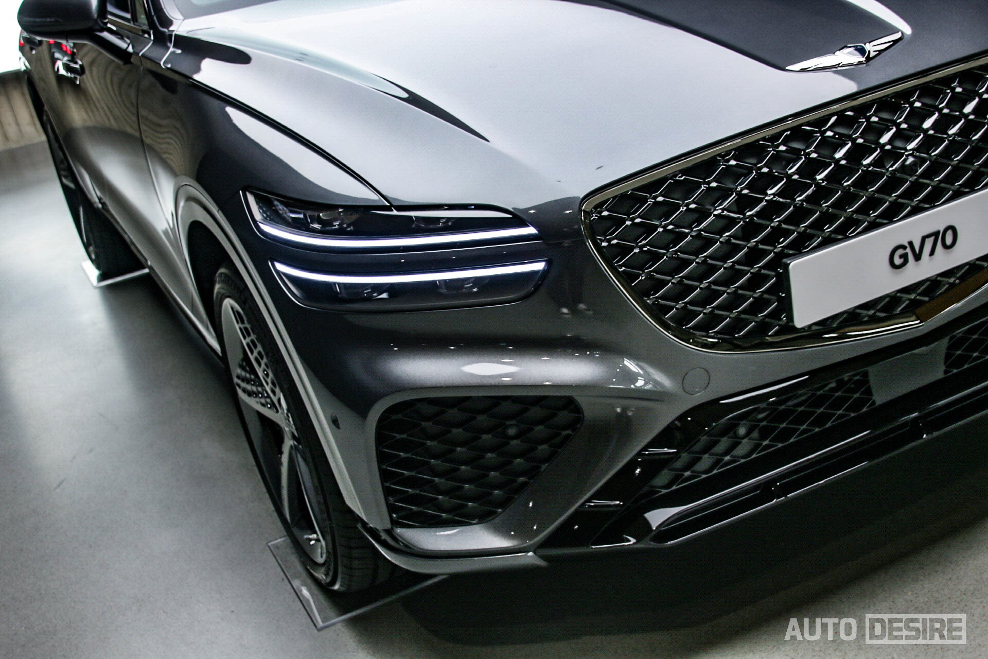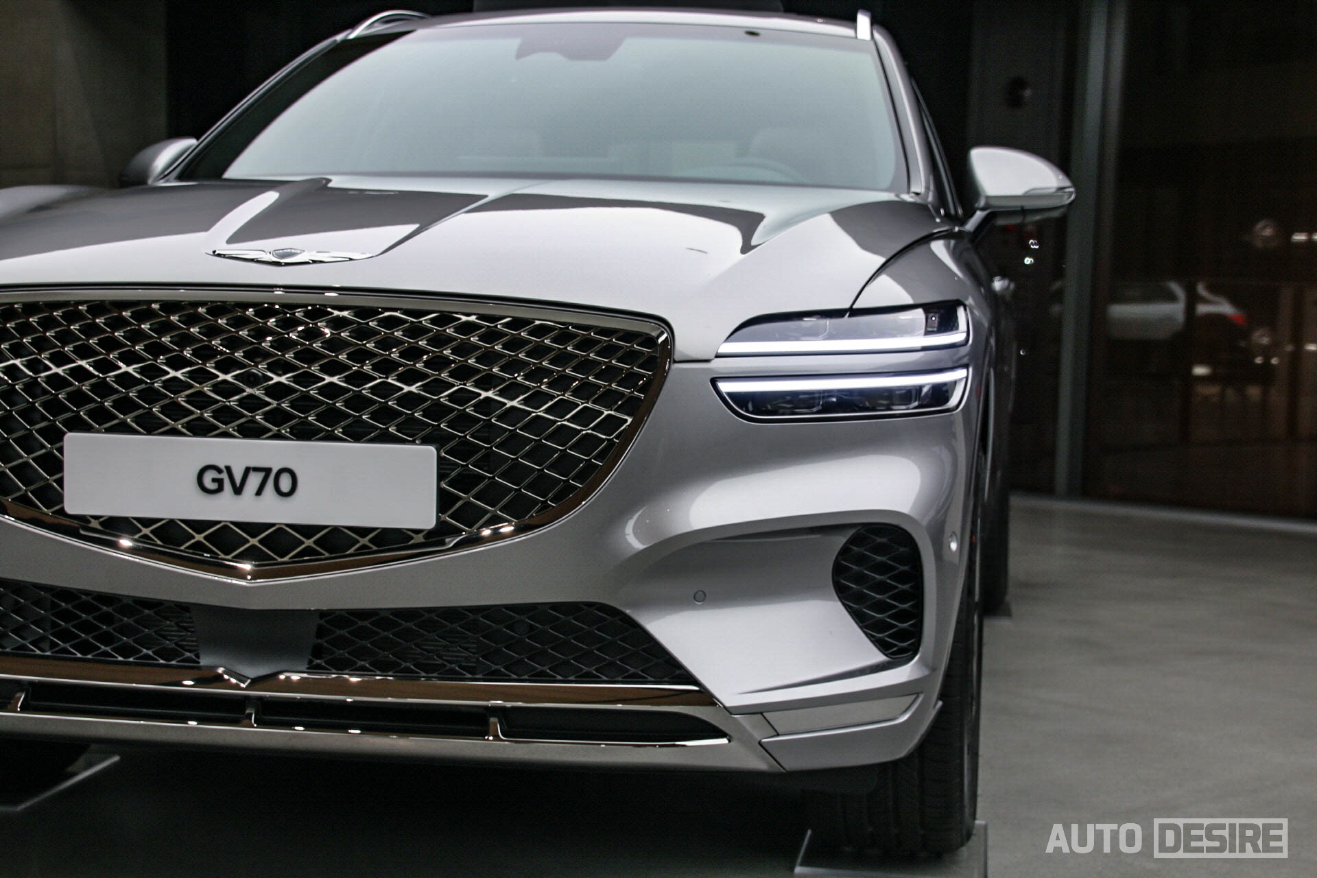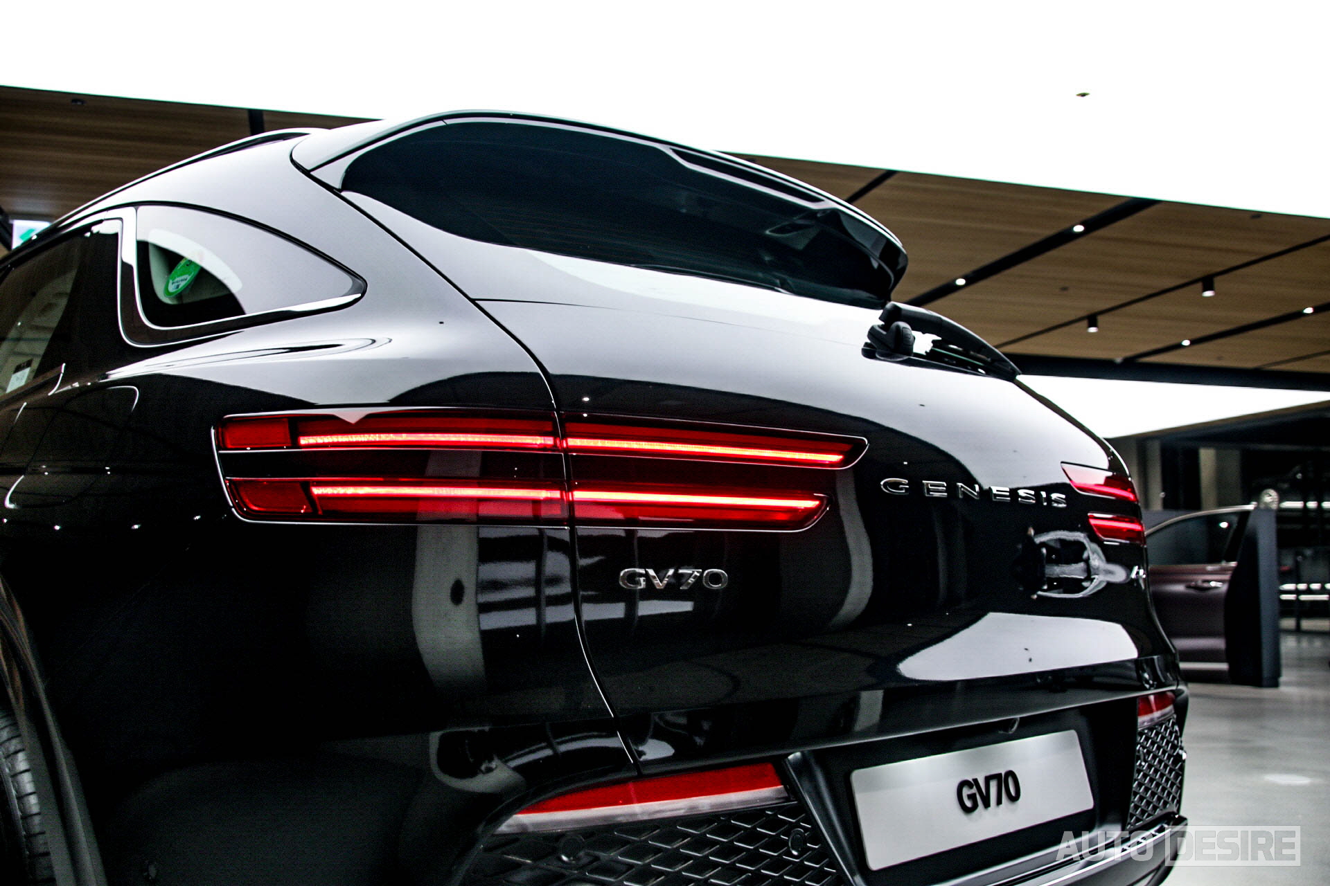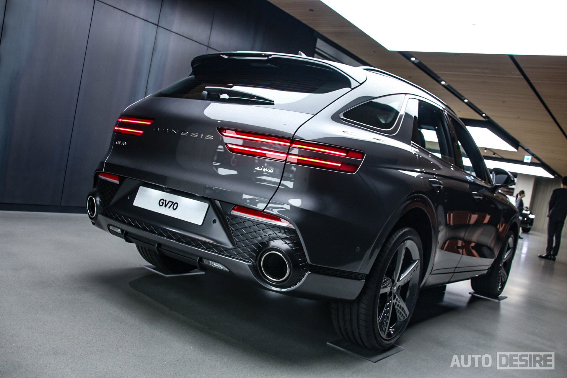 정식 공개보다 좀 이른 시기인 10월 말에 이미 실내외 디자인이 공개되었고, 차량 외관을 공개한 상태로 도로 주행 테스트도 진행한지라 이제 디자인은 꽤 익숙, 친숙한 편이지만 호불호 크게 없이 매력적이고 잘 생긴 디자인이라는 점, 그리고 실물로 볼 때 그 만족감이 더 크다는 점은 변하지 않는다. 또한 제네시스의 디자인 아이덴티티, 두 줄 쿼드램프와 크레스트 그릴, G-매트릭스 패턴, 파라볼릭 라인, 크레스트 그릴 형태의 머플러 팁을 그대로 담고 있어 첫인상 자체는 다른 제네시스 라인업들과 흡사하지만 차의 비례감, 볼륨감, 전체적인 실루엣에서는 GV70만의 역동적인 느낌을 느끼게 한다.