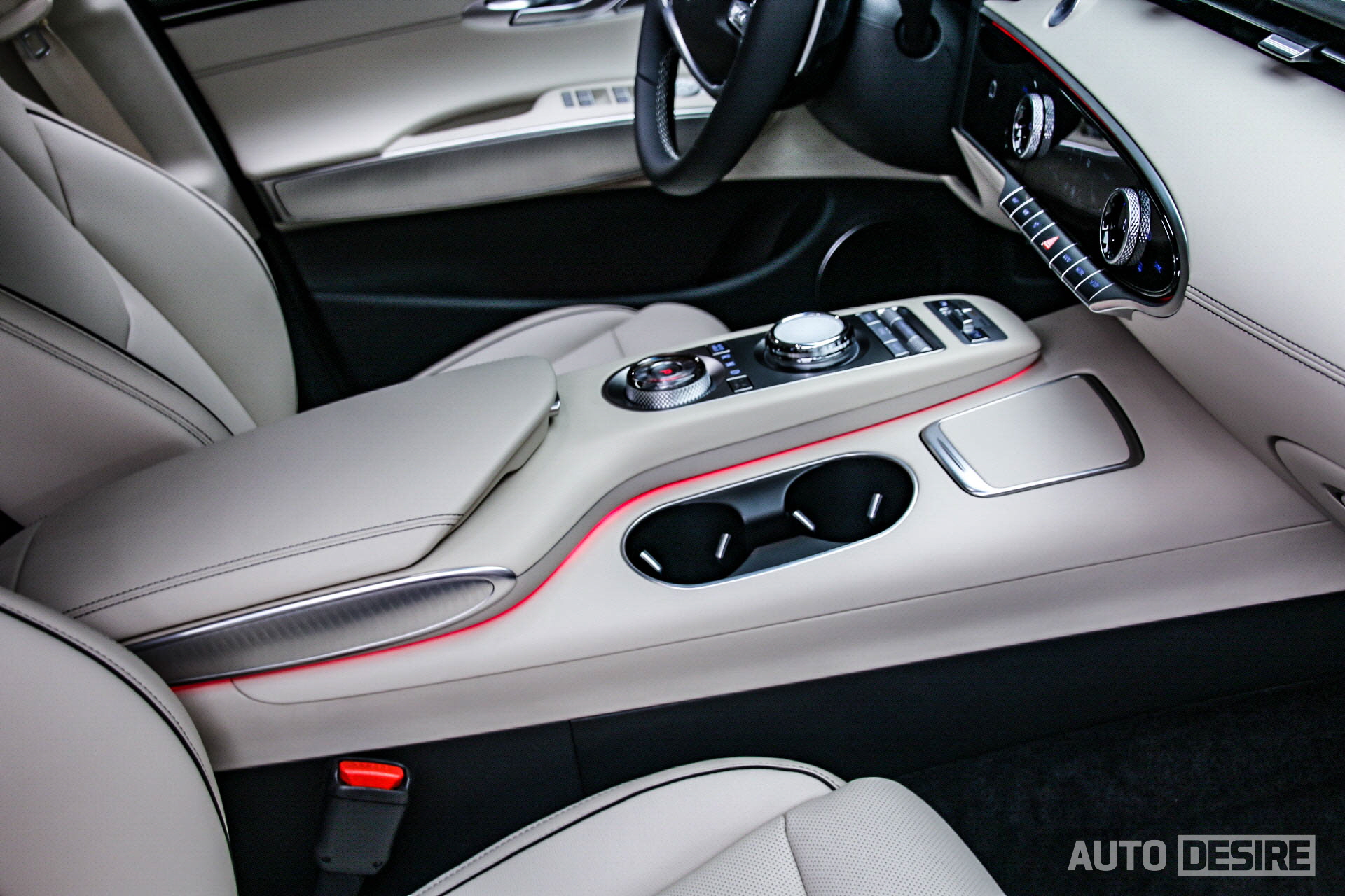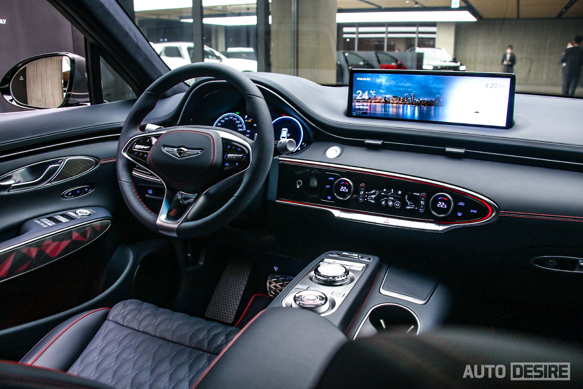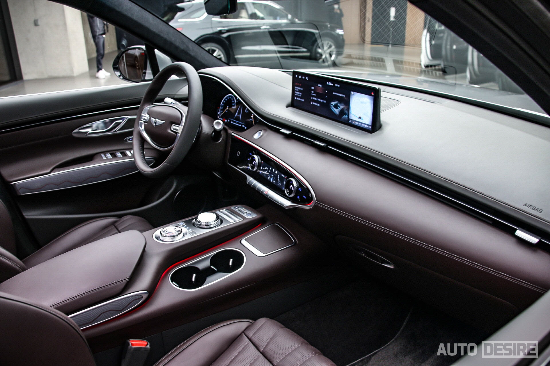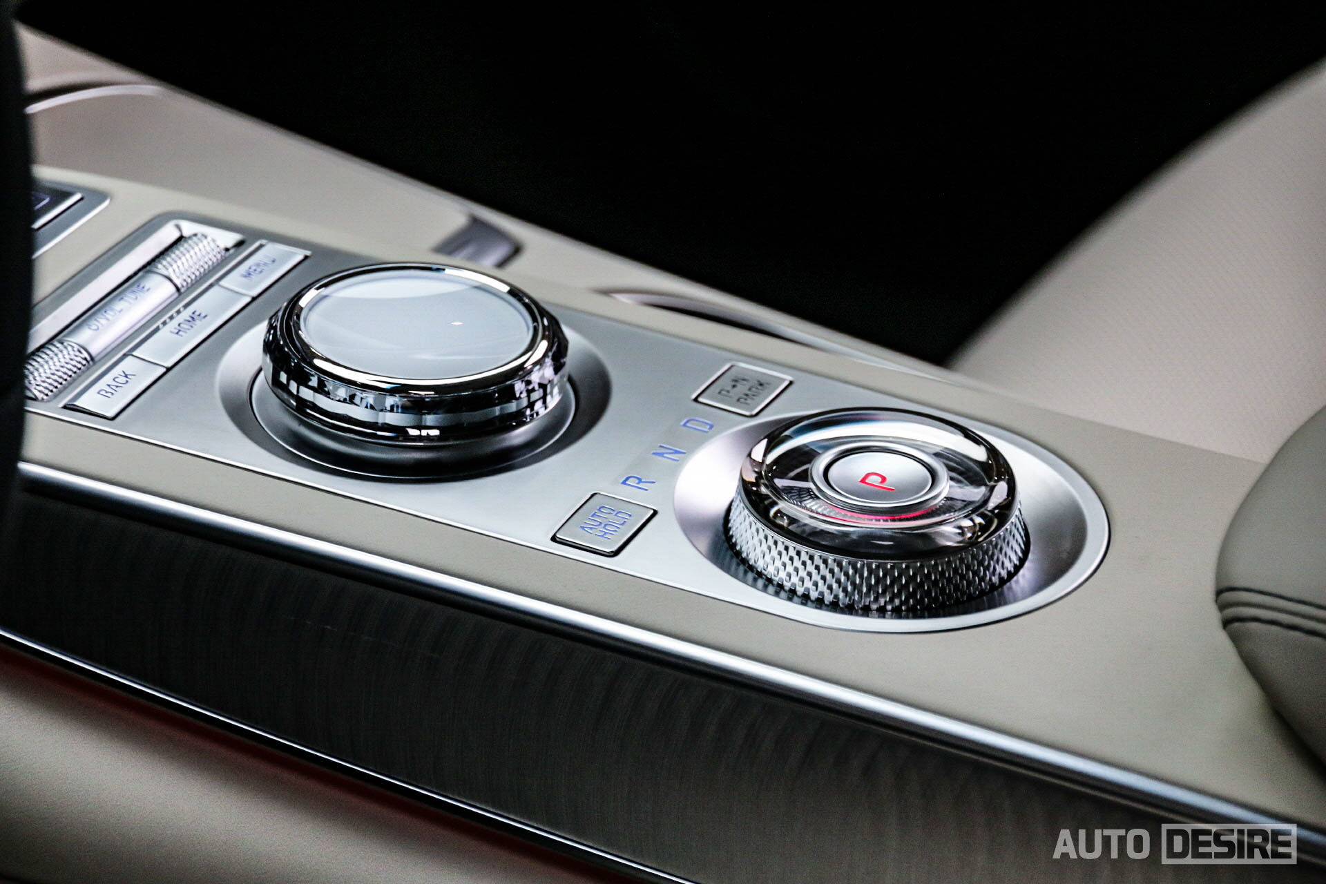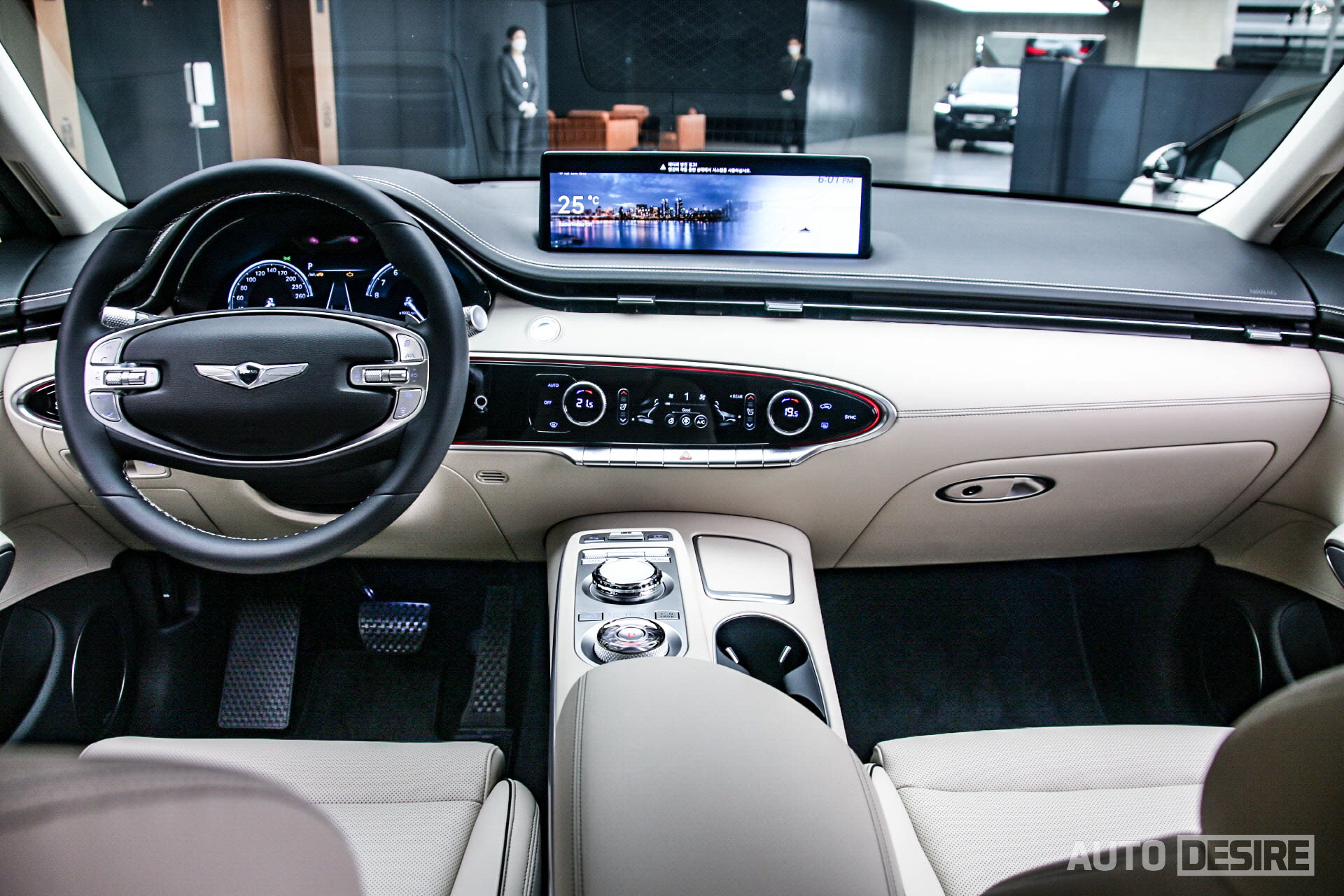 스티어링 휠은 GV80과 동일한 2-스포크 타입이 적용되며, 변속기도 마치 보석처럼 정교하게 세공한 듯한 전자식 변속 다이얼이 적용되는데, 통합 컨트롤러는 사용 편의성 개선을 위해서인지 G80, GV80처럼 평평한 다이얼에 중앙이 오목하게 파인 형태가 아닌 돌출된 다이얼로 변경, 대신 변속 다이얼과 다른 마감재를 적용으로 쉽게 구분할 수 있게 적용했다.