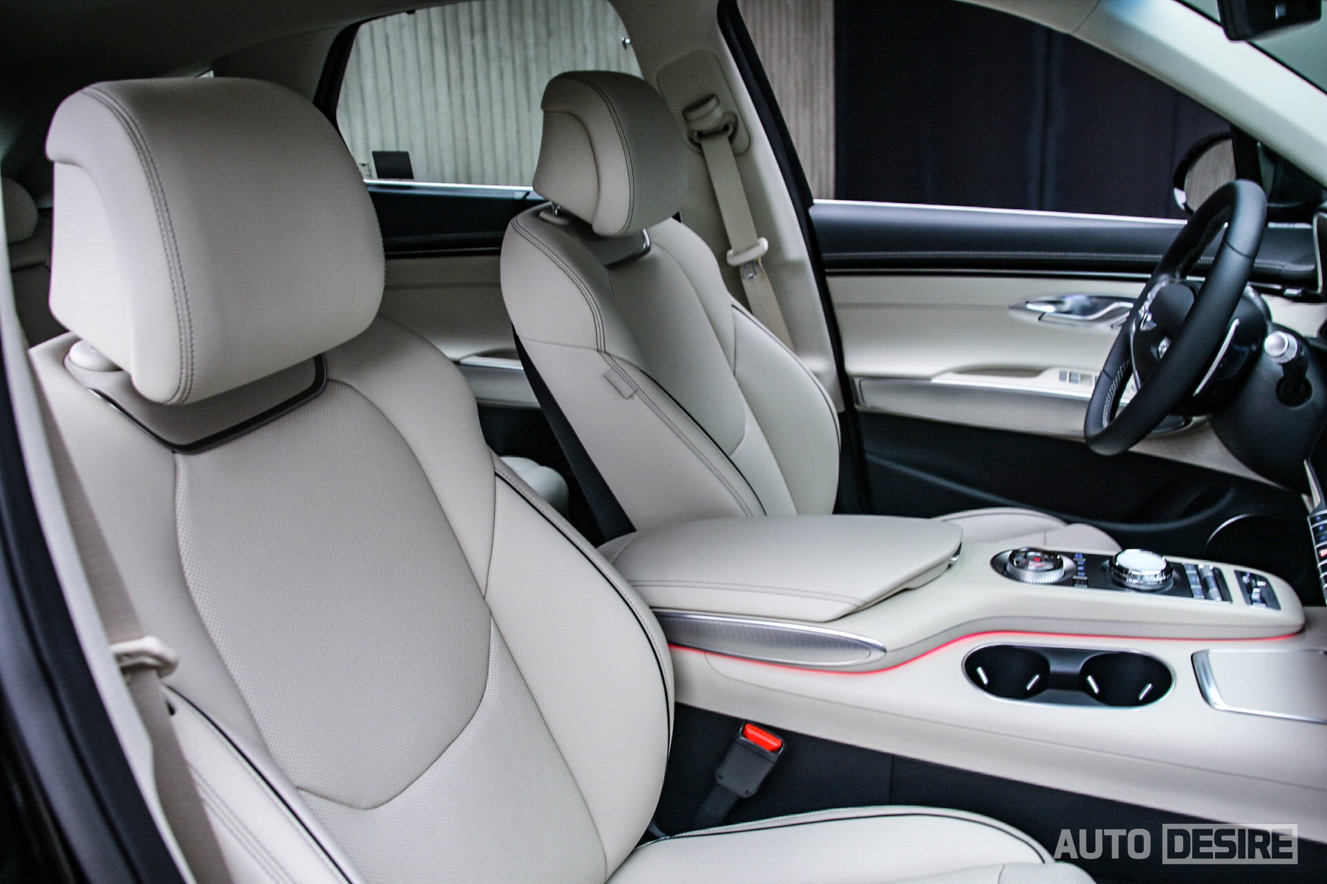 실내에서도 여백의 미를 기본으로 수평형의 슬림한 송풍구와 플로팅 타입 14.5인치 대화면 디스플레이, 12.3인치 디지털 클러스터와 수평형 대시보드 레이아웃으로 제네시스 디자인 언어를 보여주고 있으되, 외관과 마찬가지로 GV80이 직선 위주로 안정감이 강한 느낌이었다면 GV70은 비행기의 날개 형상에서 모티브를 따온 타원형 요소와 강한 볼륨감을 통해 긴장감이 더 살아있고, 부드러운 느낌이 전해진다.