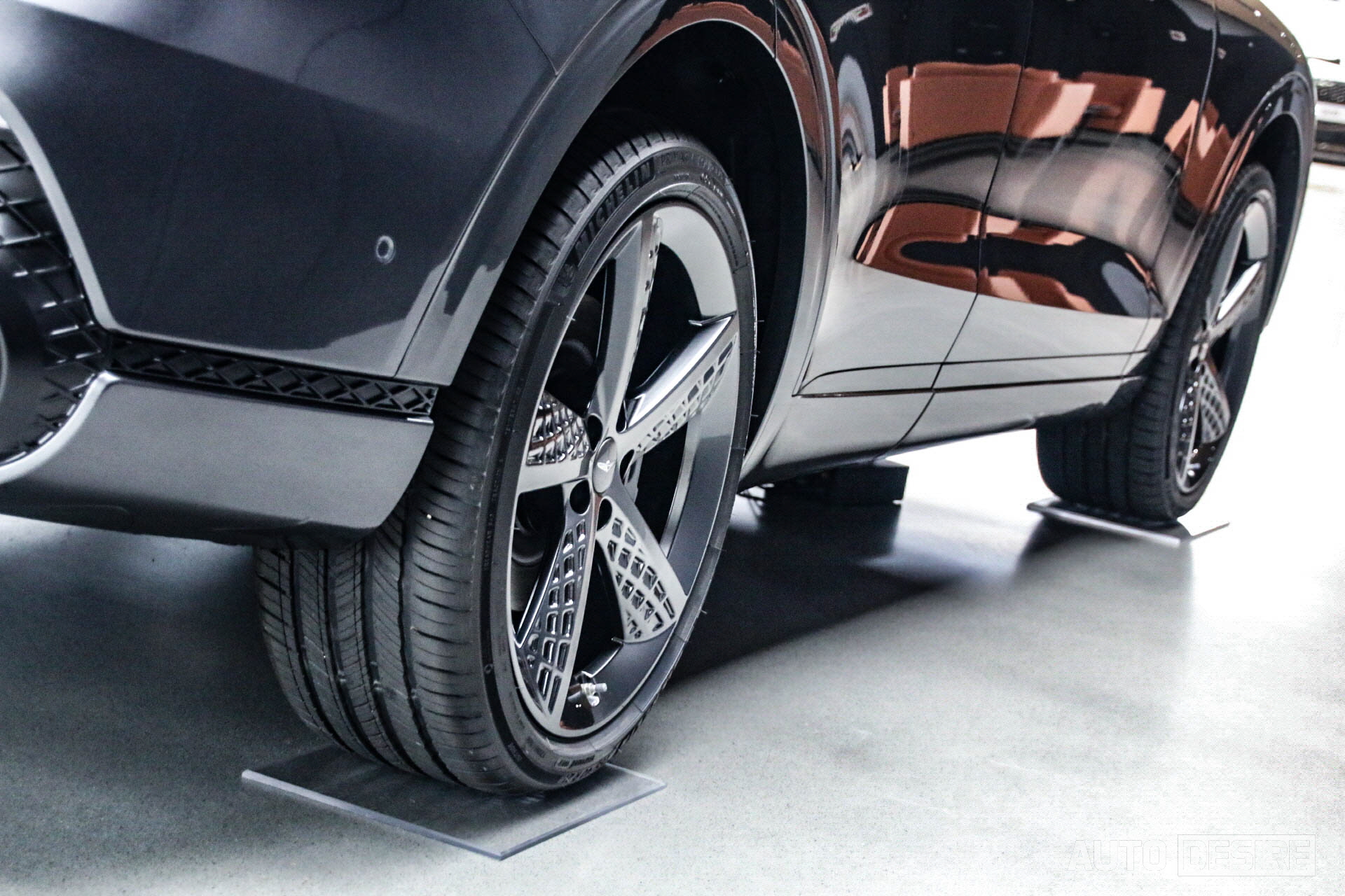 이어서 스포츠 패키지 모델은 기본 상태에서도 훌륭한 GV70의 스타일을 한층 더 스포티하고 강한 인상, 더 다이나믹한 분위기로 만들어 준다. 기본적으로 범퍼의 에어벤트 디자인을 더 크게 키우고 윈도우 라인과 메시 패턴 프런트 그릴, 사이드 가니시에 다크 틴티드 크롬과 다크 DLO 몰딩, 범퍼 하단 스키드 플레이트와 루프도 블랙/다크 컬러로 적용해 밝은 외장 컬러일 시 더 확실한 대비감을 만들고 시원하게 뻗는 스포츠 전용 5-스포크 21인치 휠은 스포크마다 G-매트릭스 패턴을 적극적으로 적용해 제네시스의 정체성과 화려함을 함께 살렸다. (이 휠의 디자인은 GV80 콘셉트에서 먼저 적용되기도 했다.) 다만 타이어는 일반/스포츠 패키지 모두 미쉐린 프라이머시 투어 올시즌 타이어로 동일하다.