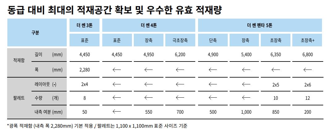 한편 더 쎈은 기존 준중형 트럭에서 일반적으로 통용되던 적재중량 대비 0.5톤 더 증량된 3톤, 4톤, 5톤으로 더 증량된 적재중량을 통해 트럭 기사, 차주들이 한 번에 더 많은 짐을 적재, 수송할 수 있도록 했다고 한다. 적재함의 폭은 모든 모델이 2,280mm로 동일하며 길이는 3톤과 4톤 표준 적재함 4,450mm, 장축 4,950mm, 극초장축 6,200mm이며 5톤 모델은 단축 4,900mm, 장축 5,400mm, 초장축 6,350mm, 초장축+ 6,800mm이다.