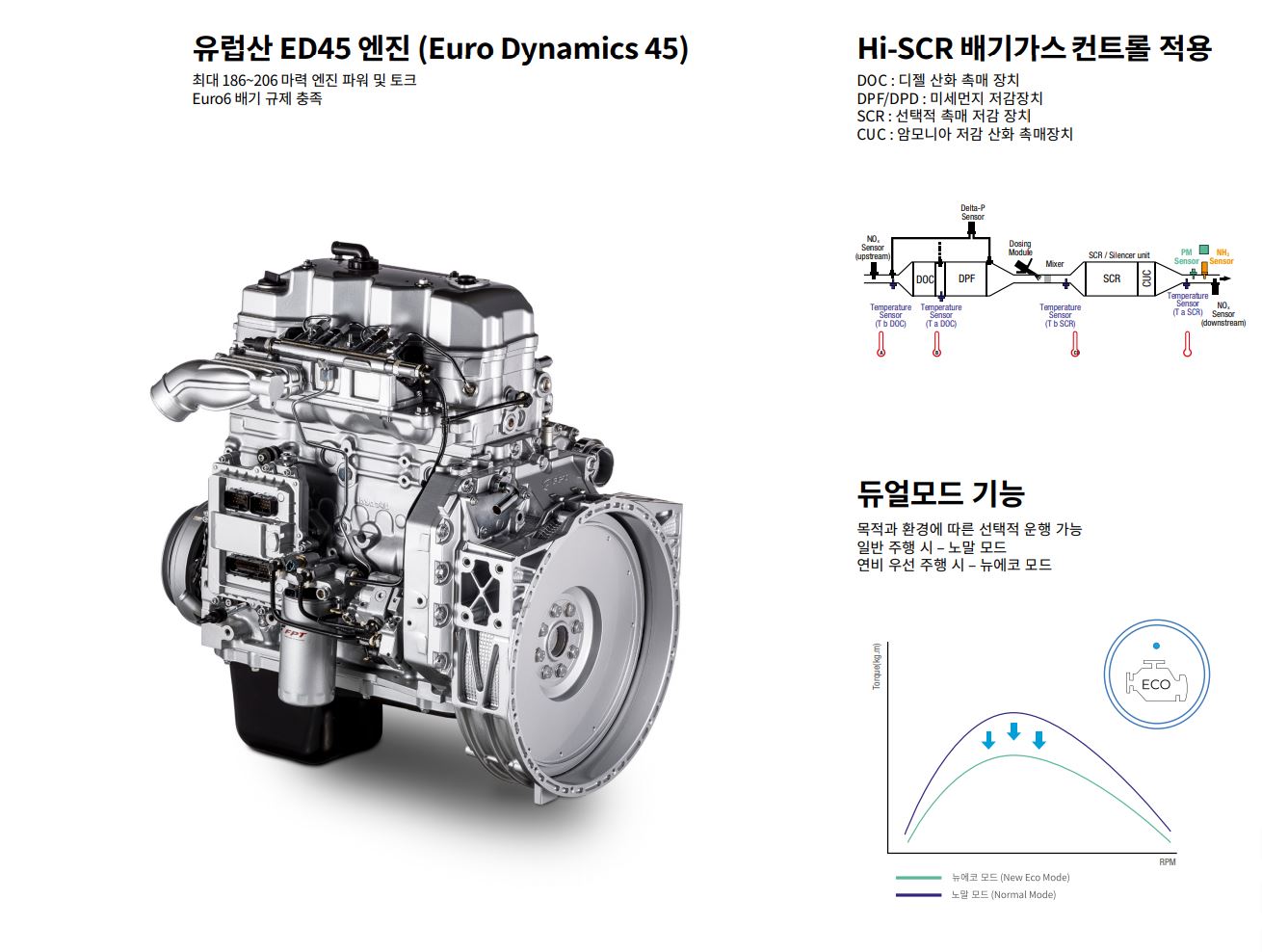 타타대우 더 쎈에는 유럽산 디젤 엔진인 4.5리터 ED45 엔진을 탑재하며, 3/4톤 더 쎈은 최고출력 186마력, 최대토크 69kg.m, 5톤 더 쎈 펜타는 최고출력 206마력, 최대토크 76kg.m을 발휘한다. 기본적으로 유로6 배출가스 규제를 충족하는 것은 물론, 디젤 산화 촉매장치/미세먼지 저감장치/선택적 촉매 저감장치/암모니아 저감 산화 촉매장치로 구성된 Hi-SCR 배기가스 컨트롤을 적용해 특히 중저속 구간, 도심 주행에서 배기가스 저감 효과를 더 높였다고 한다. 또한 주행모드도 노말 모드와 뉴에코 모드를 선택할 수 있다.