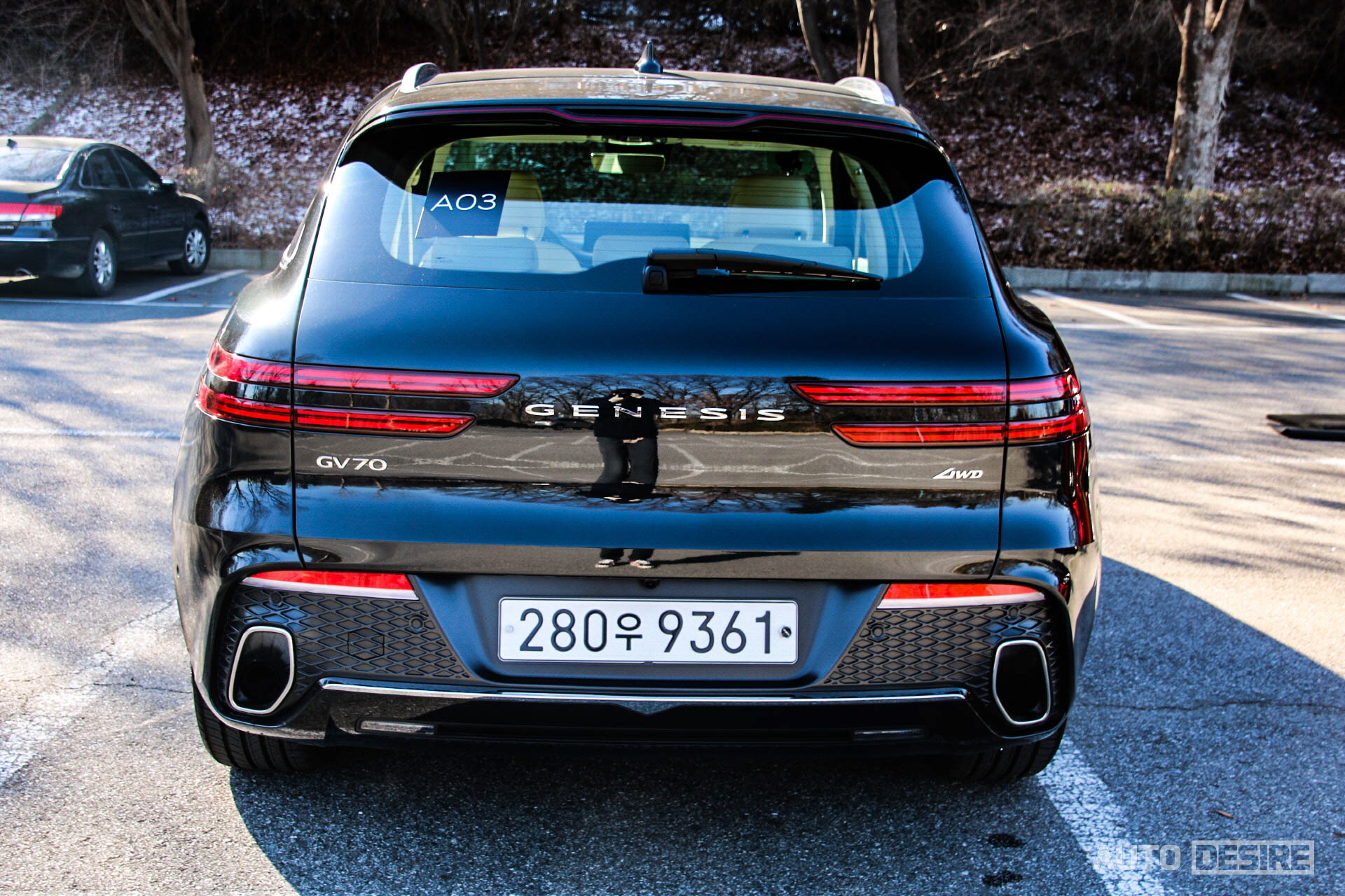 아치형으로 완만하게 떨어지는 루프라인과 C필러에서 한번 꺾여 내려오는 윈도우 크롬 라인, 파라볼릭 캐릭터 라인은 측면에 긴장감과 우아한 느낌을 함께 만든다. 뒷모습에서는 턴 시그널이 통합되지 않은 것이 조금 아쉽지만 긴 쿼드랩프를 통해 제네시스의 정체성을 강하게 나타냈고, 스포일러의 보조 제동등은 중앙 부분이 꺾여 내려오도록 만들어 포인트를 더했다. 스포츠 패키지를 적용하지 않으면 머플러 팁은 크레스트 그릴을 닮은 수직 오각형 팁이 적용되는데, 개인적으로는 스포츠 패키지의 원형 팁보다 이게 더 자연스럽게 잘 어울리는 것 같다.